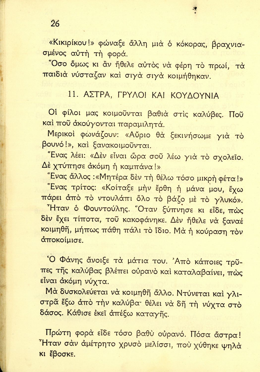 Αναγνωστικό για την Γ΄ Δημοτικού. Περιλαμβάνει μια αφηγηματική ιστορία, η οποία εμπεριέχει ηθικά διδάγματα για την ηθικοπλαστική καλλιέργεια των μαθητών. Η γλώσσα είναι δημοτική και το ύφος απλό. Στο παράρτημα