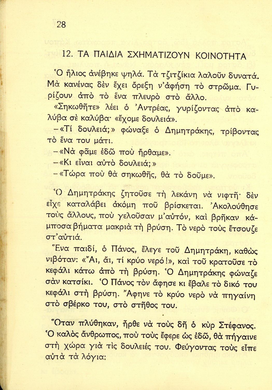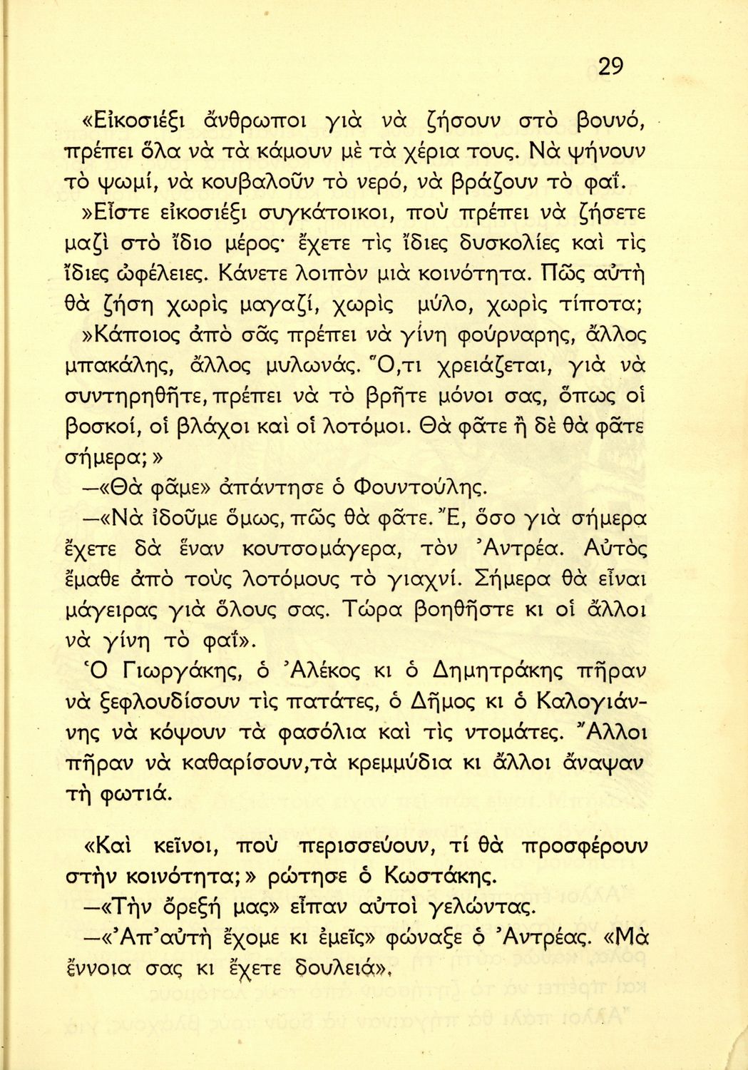 Αναγνωστικό Δ΄ Δημοτικού που αποτελεί τομή στην ιστορία της νεοελληνικής εκπαίδευσης και σταθμό στην εξέλιξη της ορθολογικής συγγραφής ενός σχολικού εγχειριδίου. Αναφέρεται στις παιδαγωγικές αρχές της συνεργασίας, της εργατικότητας και της αλληλεγγύης.