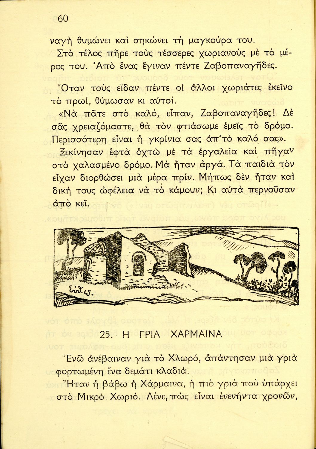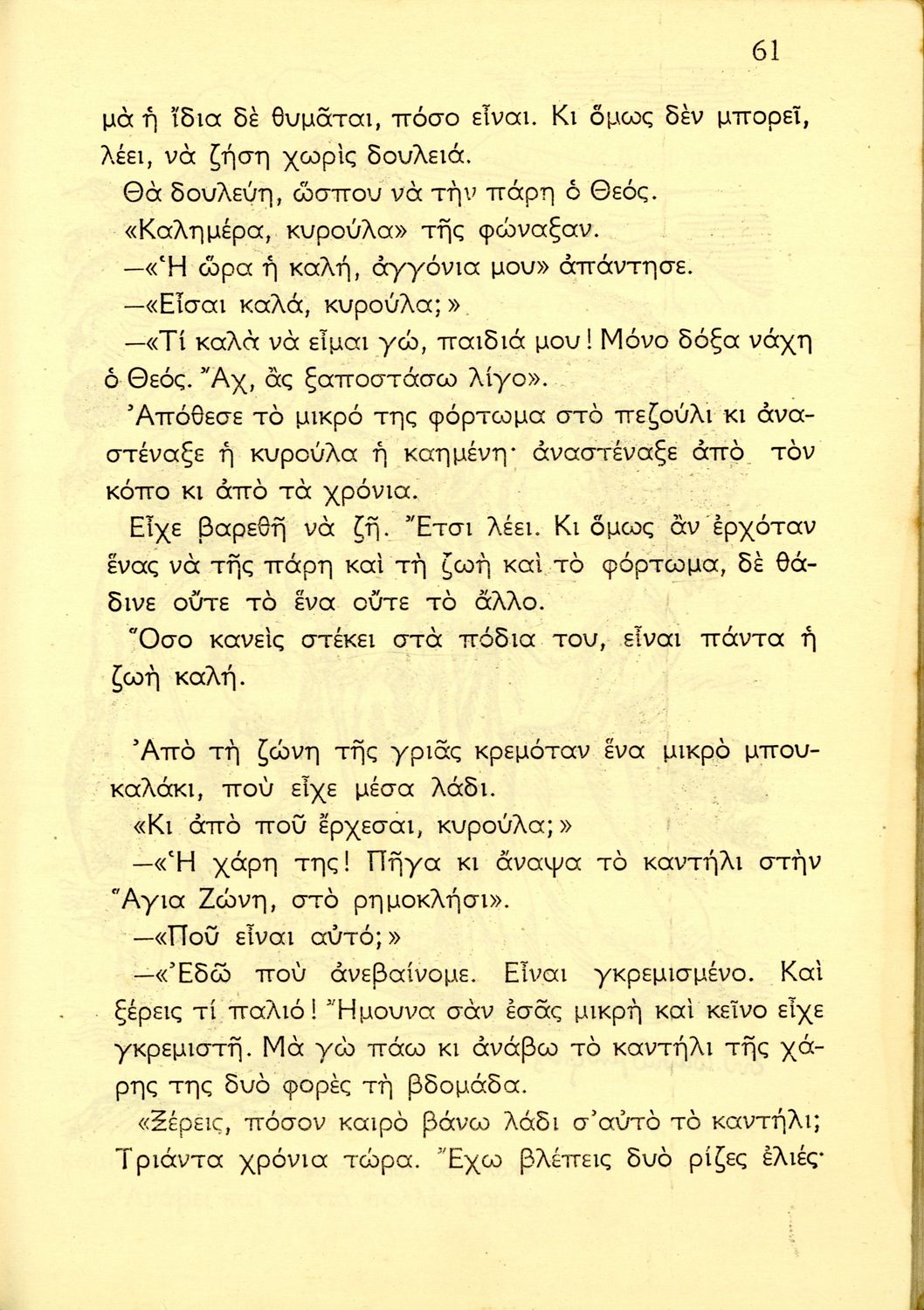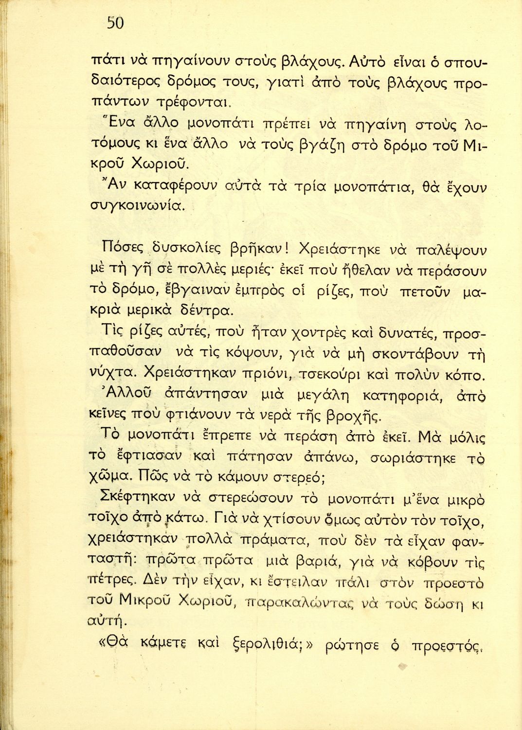 Αναγνωστικό Δ΄ Δημοτικού που περιέχει πεζά και ποιήματα με περιεχόμενο διδακτικό και ηθικοπλαστικό εμπνευσμένα από την ελληνική ιστορία και μυθολογία, και την αγροτική και κοινωνική ζωή.