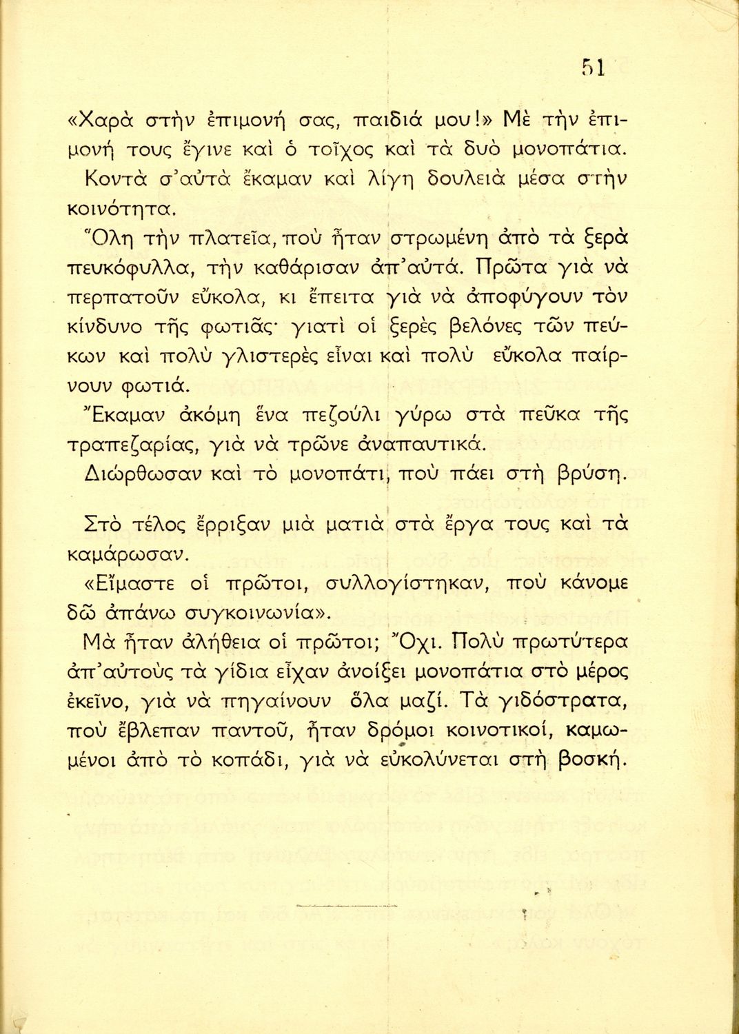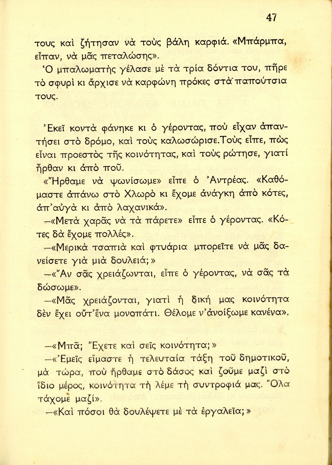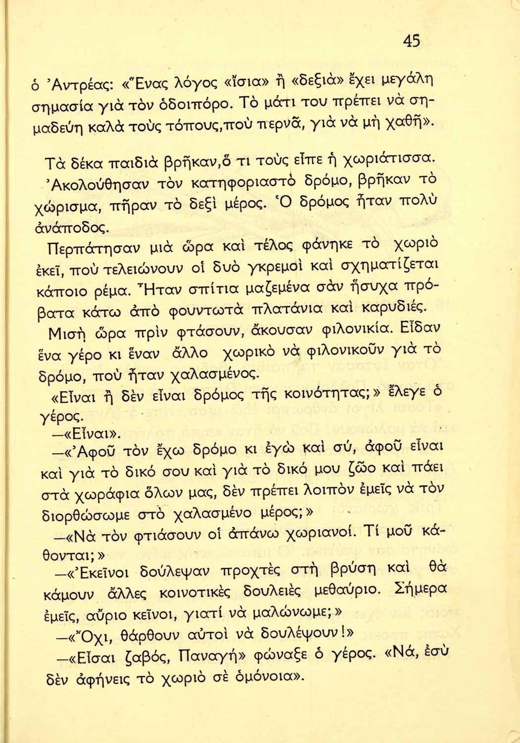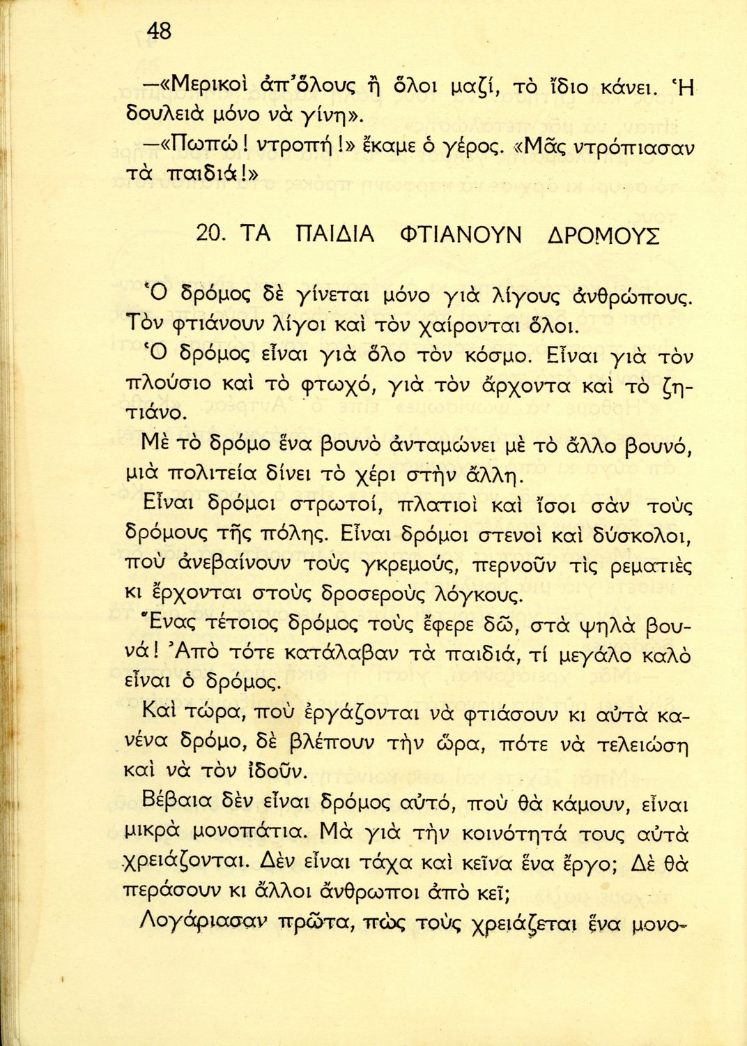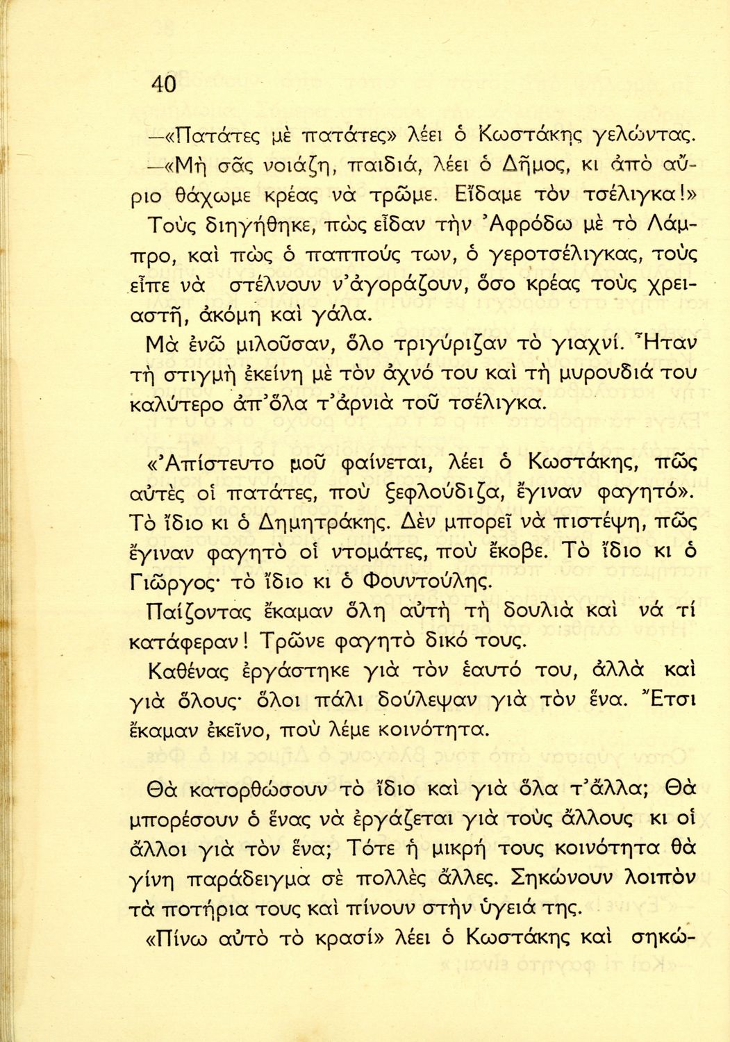Αναγνωστικό Δ΄ Δημοτικού που αποτελεί τομή στην ιστορία της νεοελληνικής εκπαίδευσης και σταθμό στην εξέλιξη της ορθολογικής συγγραφής ενός σχολικού εγχειριδίου. Αναφέρεται στις παιδαγωγικές αρχές της συνεργασίας, της εργατικότητας και της αλληλεγγύης.