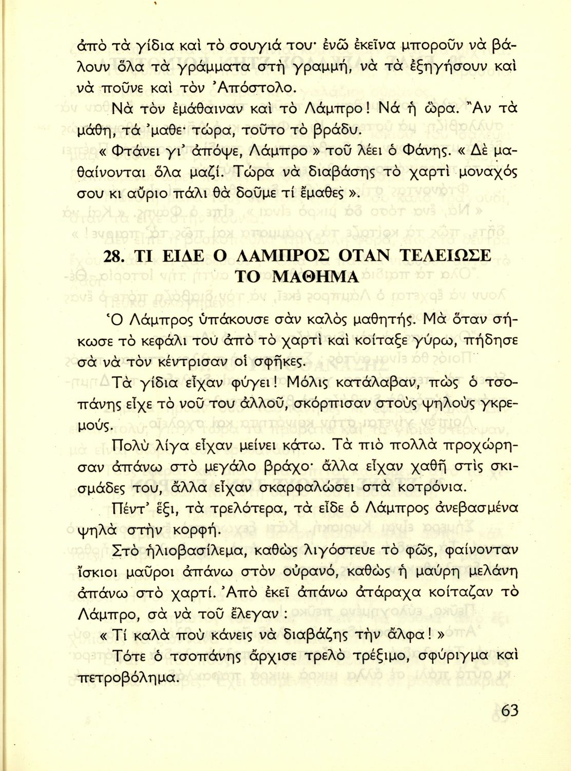 Βαθμίδα εκπαίδευσης: Πρωτοβάθμια Τάξη: Γ' Δημοτικού Μάθημα: Νέα Ελληνικά Γλώσσα: Δημοτική Παρουσίαση περιεχομένου: Αναγνωστικό Γ΄ Δημοτικού που αποτελεί τομή στην ιστορία της νεοελληνικής εκπαίδευσης και σταθμό στην εξέλιξη της ορθολογικής συγγραφής ενός σχολικού εγχειριδίου. Αναφέρεται στις παιδαγωγικές αρχές της συνεργασίας, της εργατικότητας και της αλληλεγγύης. |