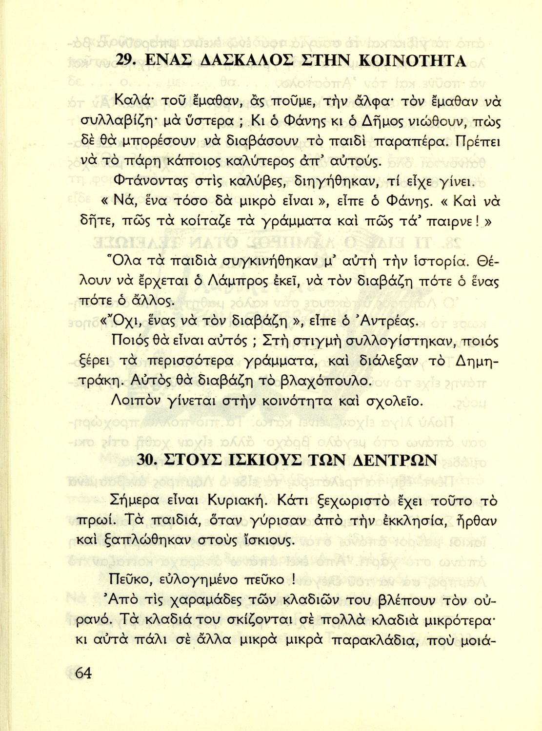Αναγνωστικό Γ΄ Δημοτικού που αποτελεί τομή στην ιστορία της νεοελληνικής εκπαίδευσης και σταθμό στην εξέλιξη της ορθολογικής συγγραφής ενός σχολικού εγχειριδίου. Αναφέρεται στις παιδαγωγικές αρχές της συνεργασίας, της εργατικότητας και της αλληλεγγύης.