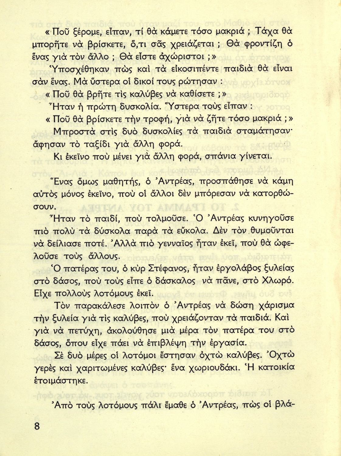 Αναγνωστικό Γ΄ Δημοτικού που αποτελεί τομή στην ιστορία της νεοελληνικής εκπαίδευσης και σταθμό στην εξέλιξη της ορθολογικής συγγραφής ενός σχολικού εγχειριδίου. Αναφέρεται στις παιδαγωγικές αρχές της συνεργασίας, της εργατικότητας και της αλληλεγγύης.