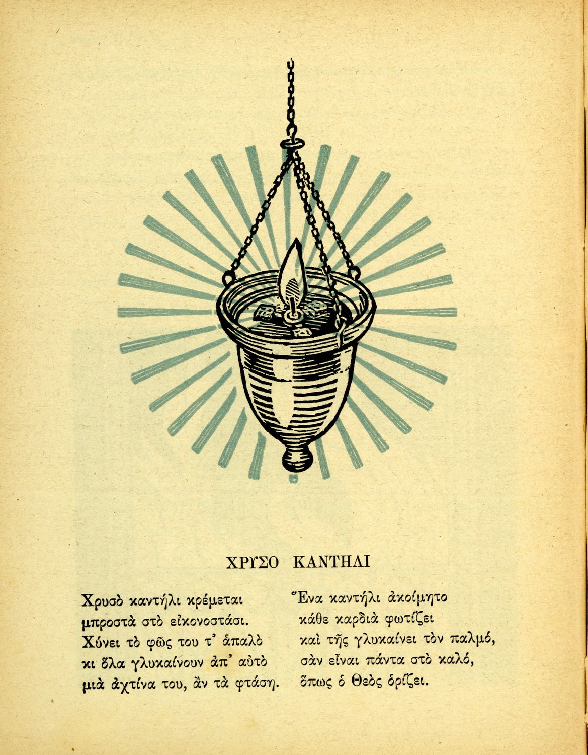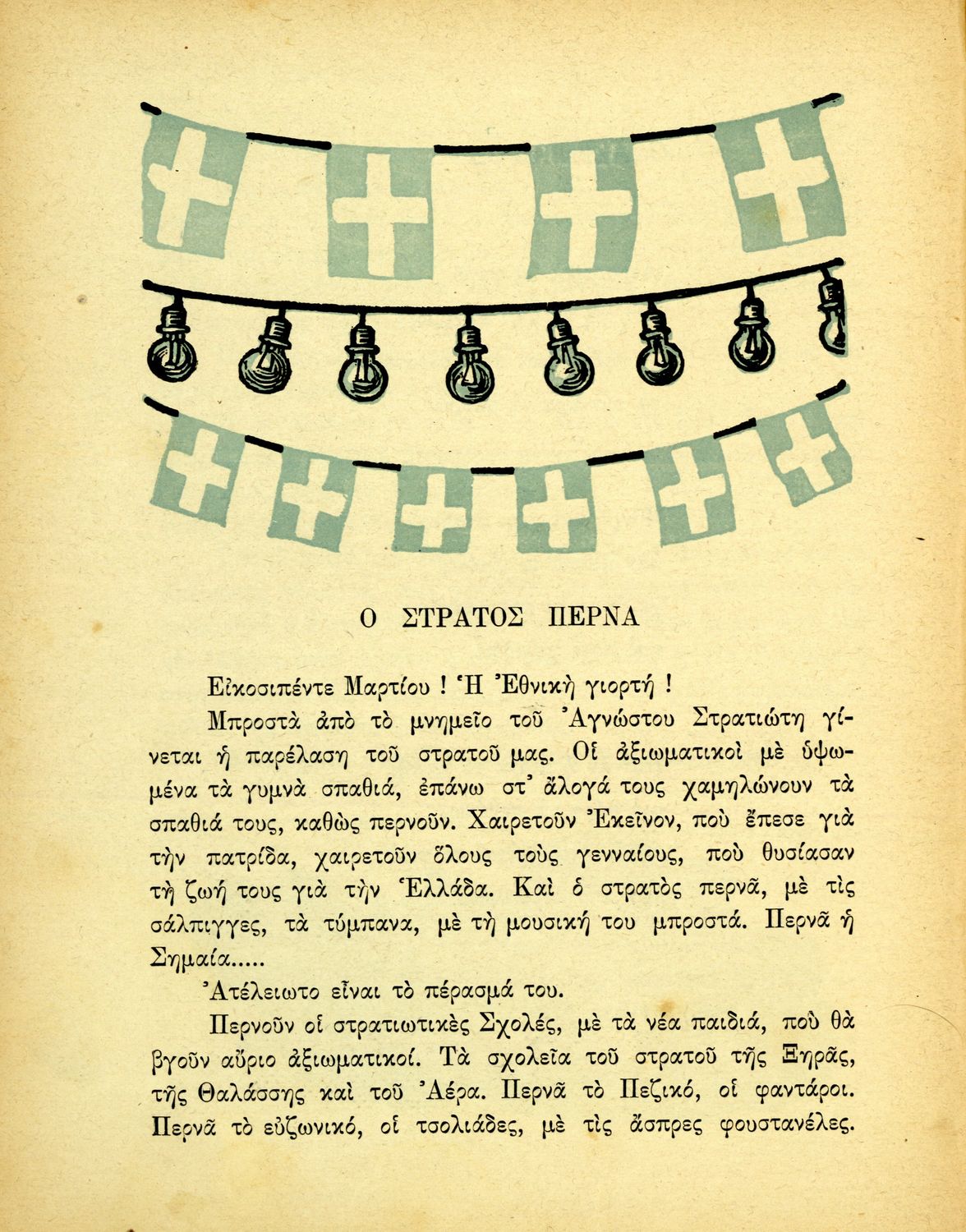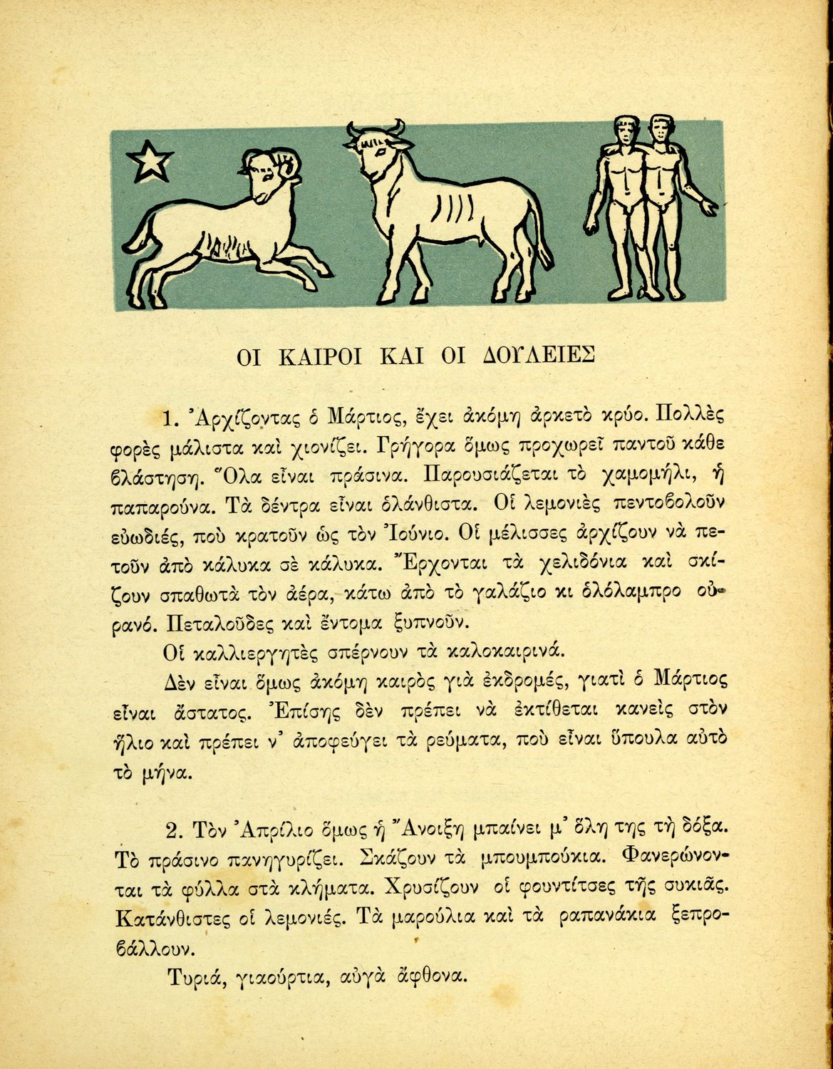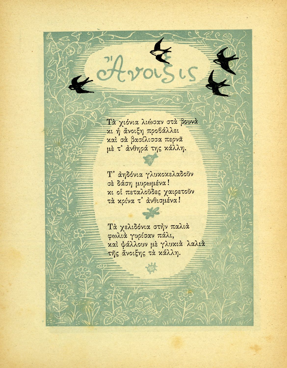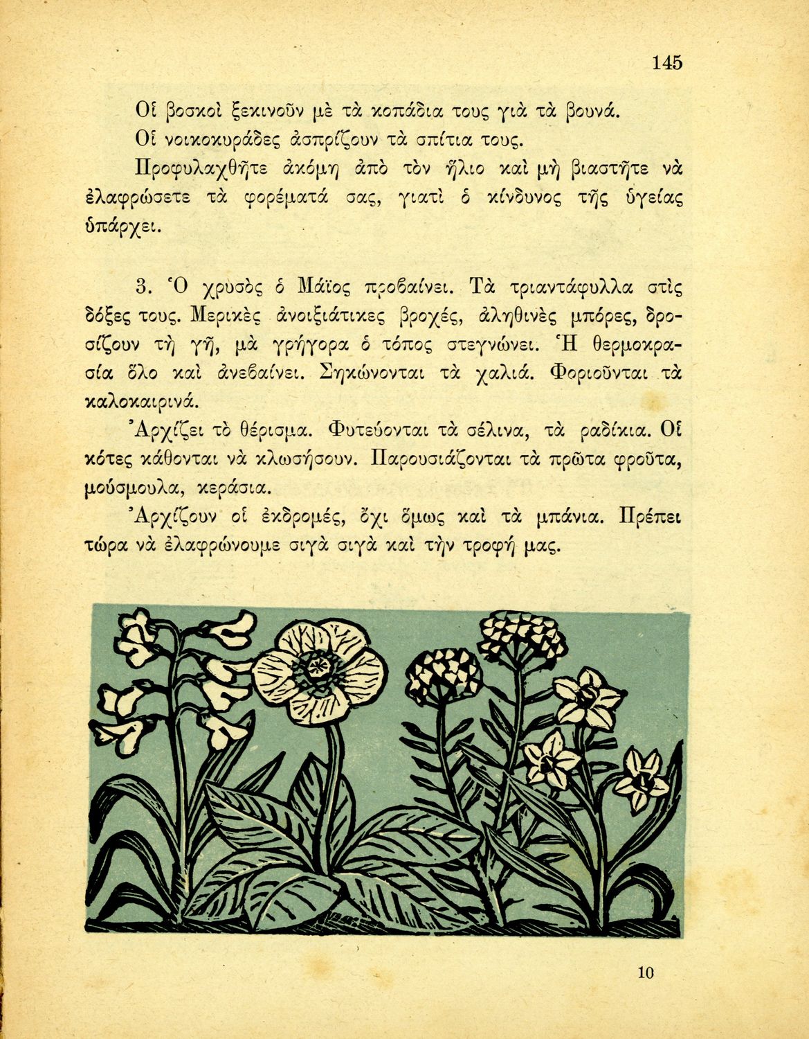 Αναγνωστικό Γ΄ Δημοτικού που περιλαμβάνει ποιήματα και πεζά εμπνευσμένα από την ελληνική φύση, τις ασχολίες των κατοίκων, την σύγχρονη ελληνική ιστορία, την ελληνική μυθολογία και τις θρησκευτικές γιορτές.