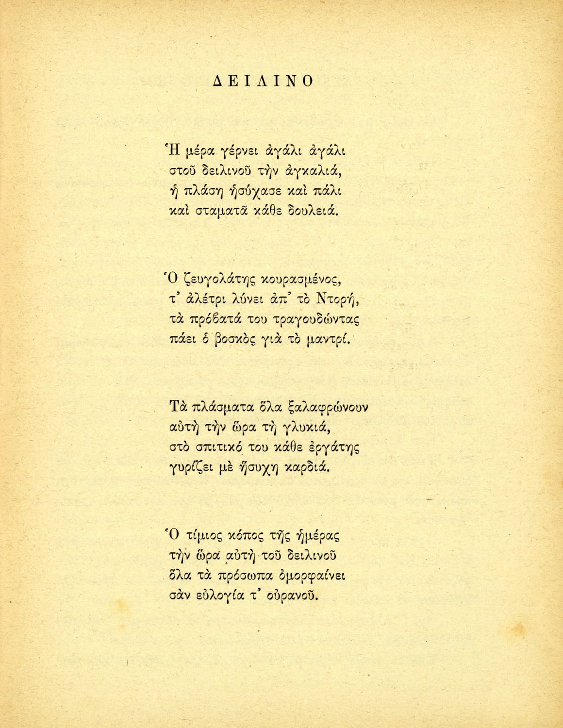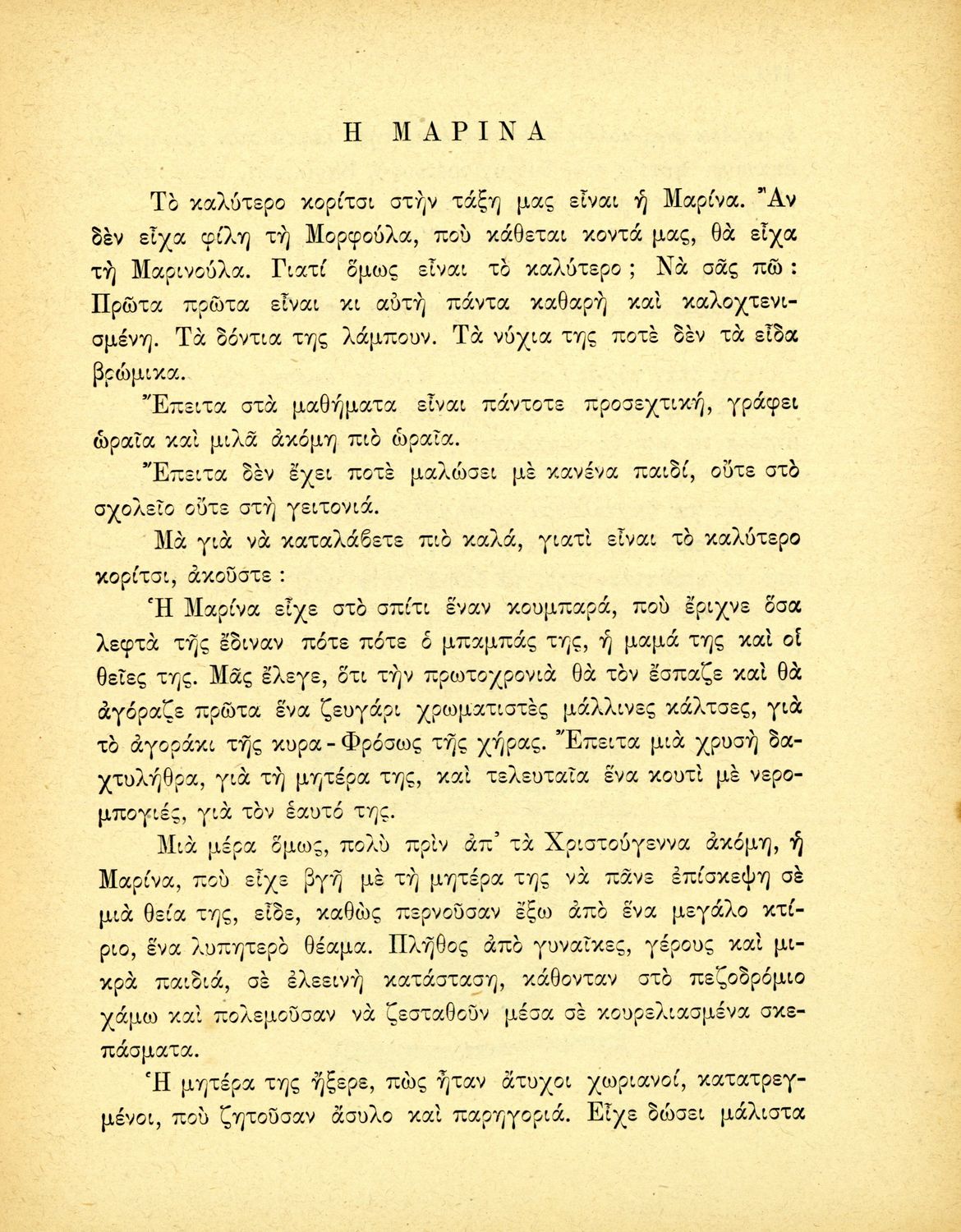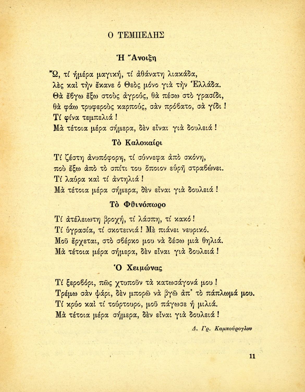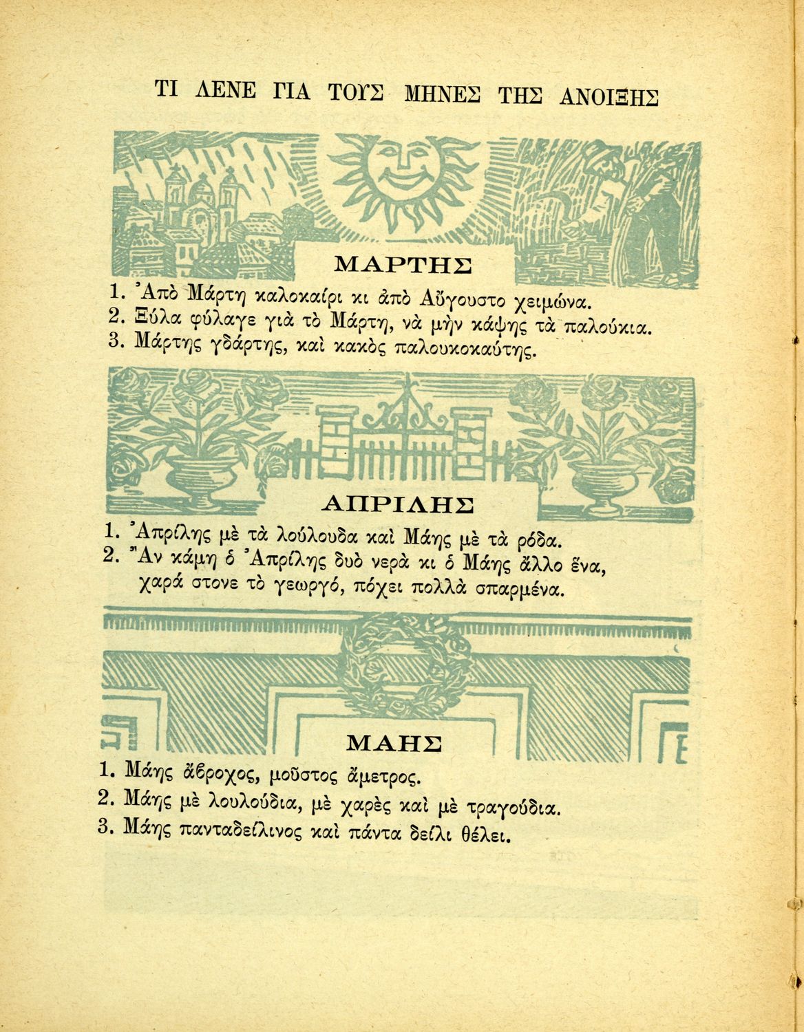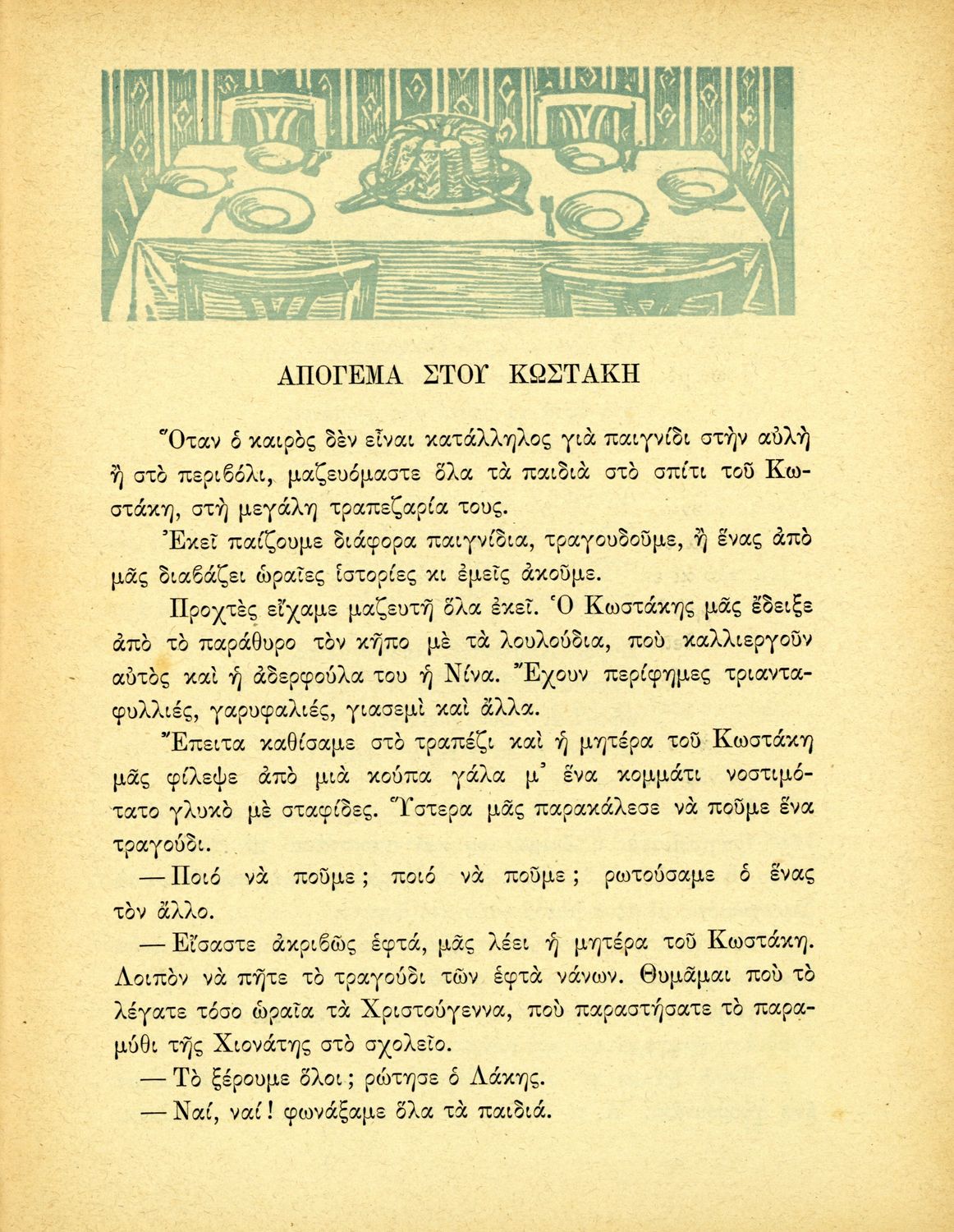 Αναγνωστικό Γ΄ Δημοτικού που περιλαμβάνει ποιήματα και πεζά εμπνευσμένα από την ελληνική φύση, τις ασχολίες των κατοίκων, την σύγχρονη ελληνική ιστορία, την ελληνική μυθολογία και τις θρησκευτικές γιορτές.