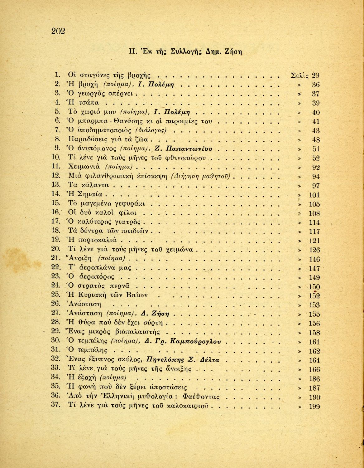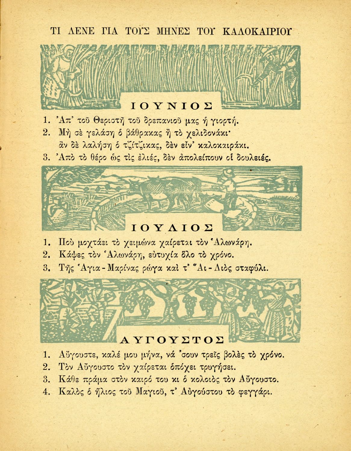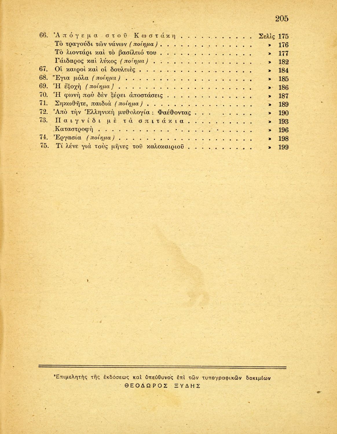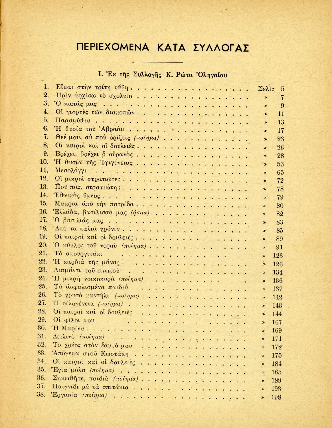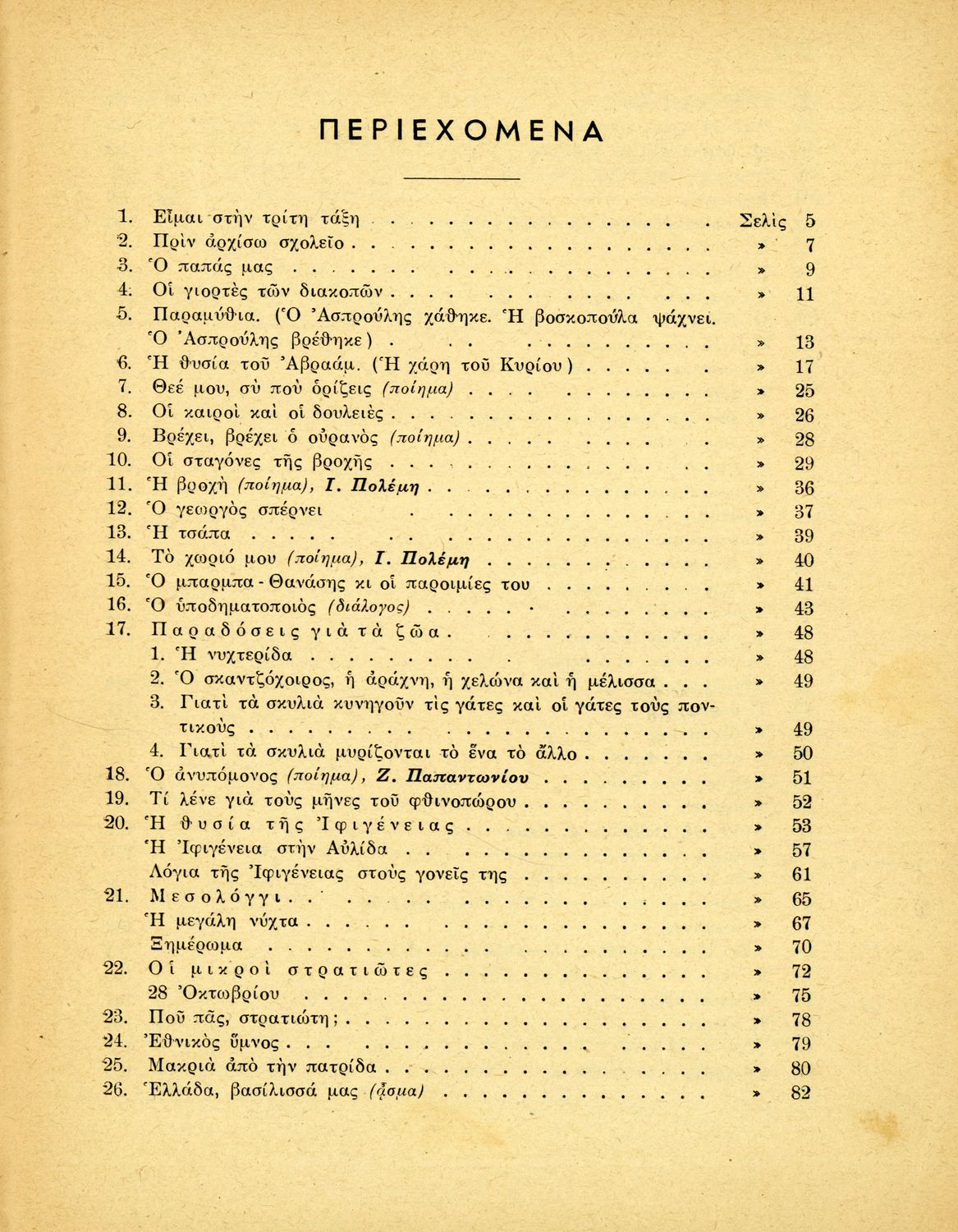 Αναγνωστικό Γ΄ Δημοτικού που περιλαμβάνει ποιήματα και πεζά εμπνευσμένα από την ελληνική φύση, τις ασχολίες των κατοίκων, την σύγχρονη ελληνική ιστορία, την ελληνική μυθολογία και τις θρησκευτικές γιορτές.