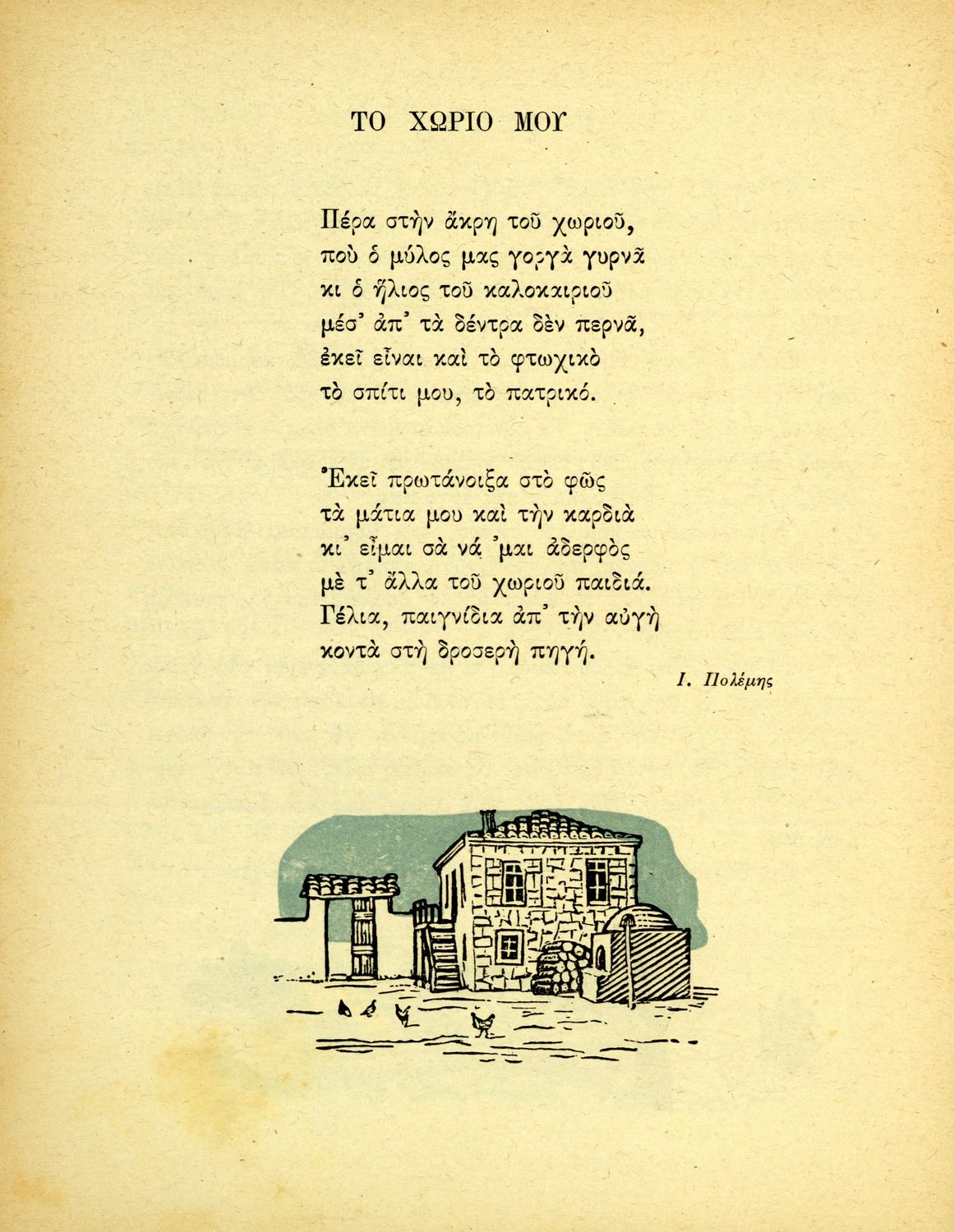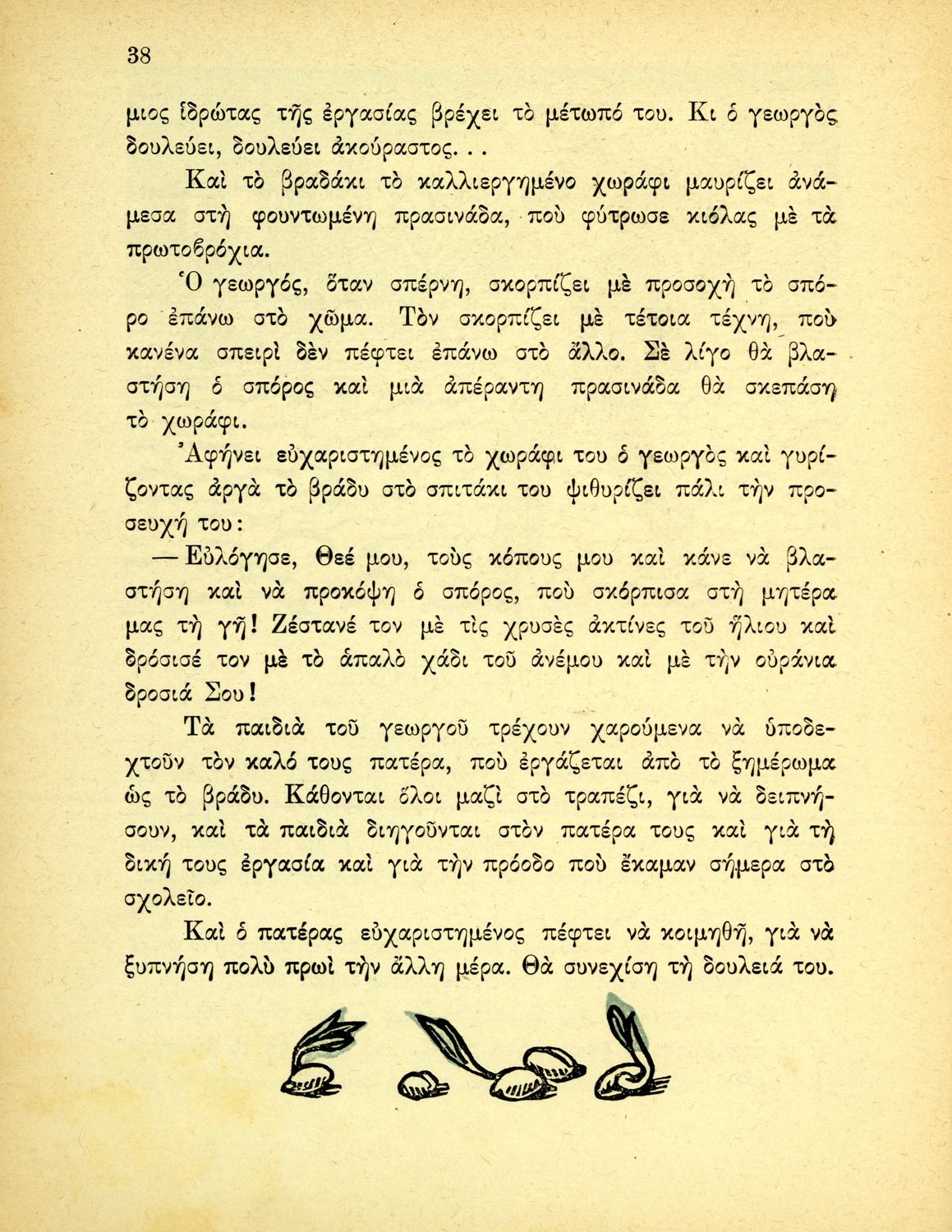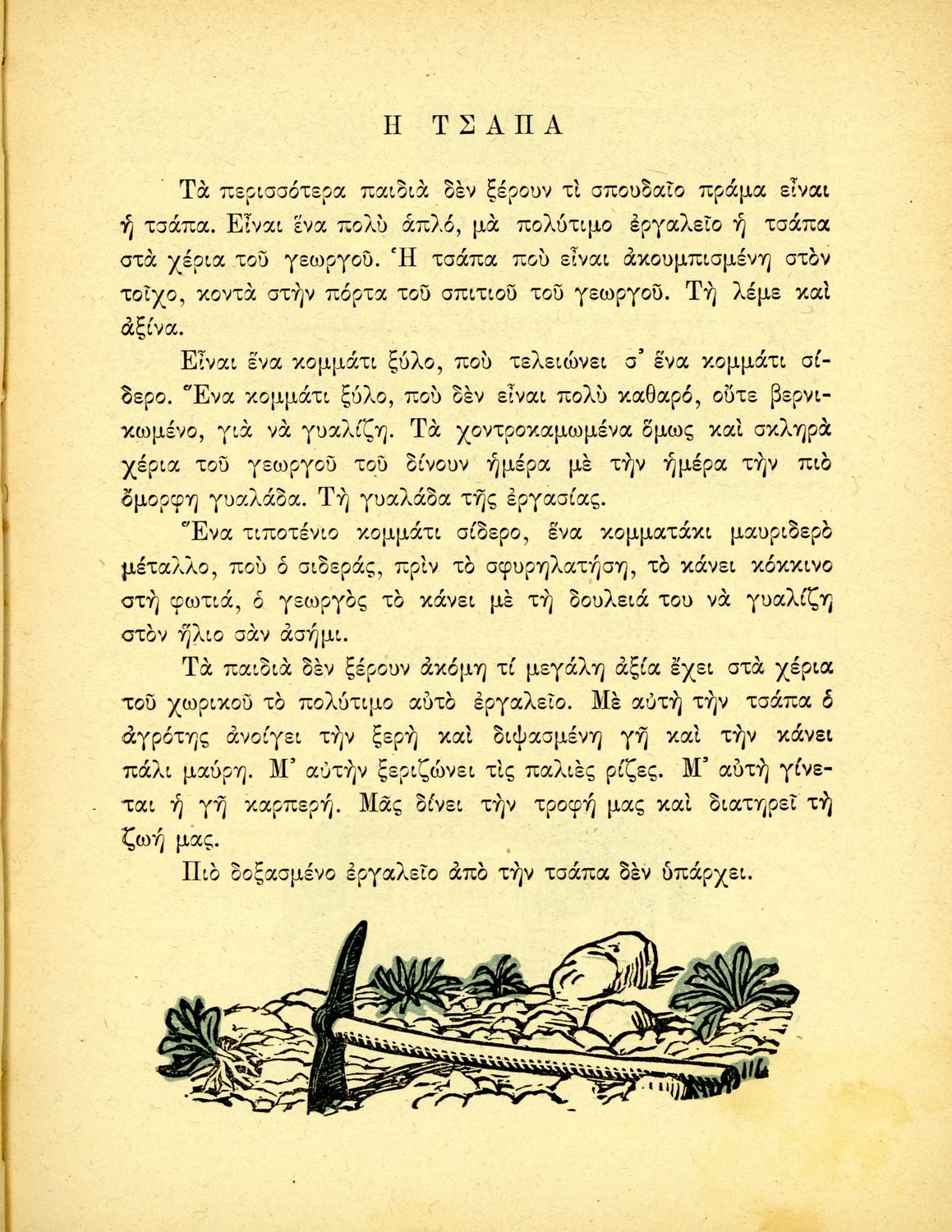 Αναγνωστικό Γ΄ Δημοτικού που περιλαμβάνει ποιήματα και πεζά εμπνευσμένα από την ελληνική φύση, τις ασχολίες των κατοίκων, την σύγχρονη ελληνική ιστορία, την ελληνική μυθολογία και τις θρησκευτικές γιορτές.
