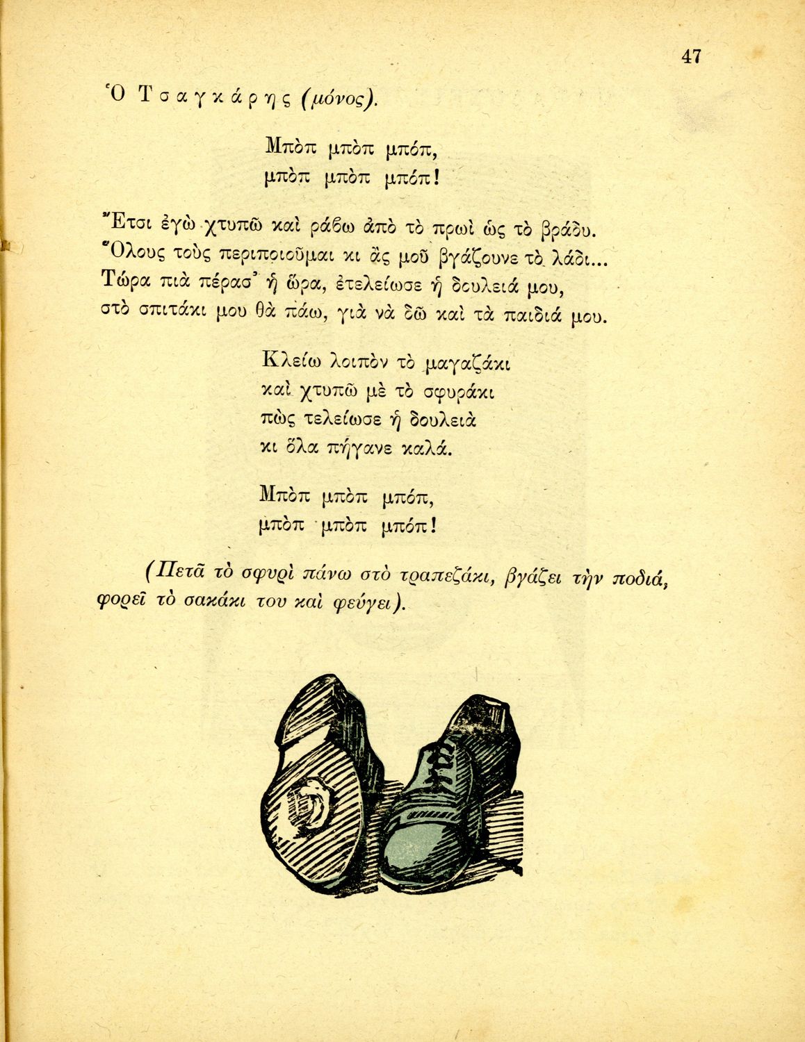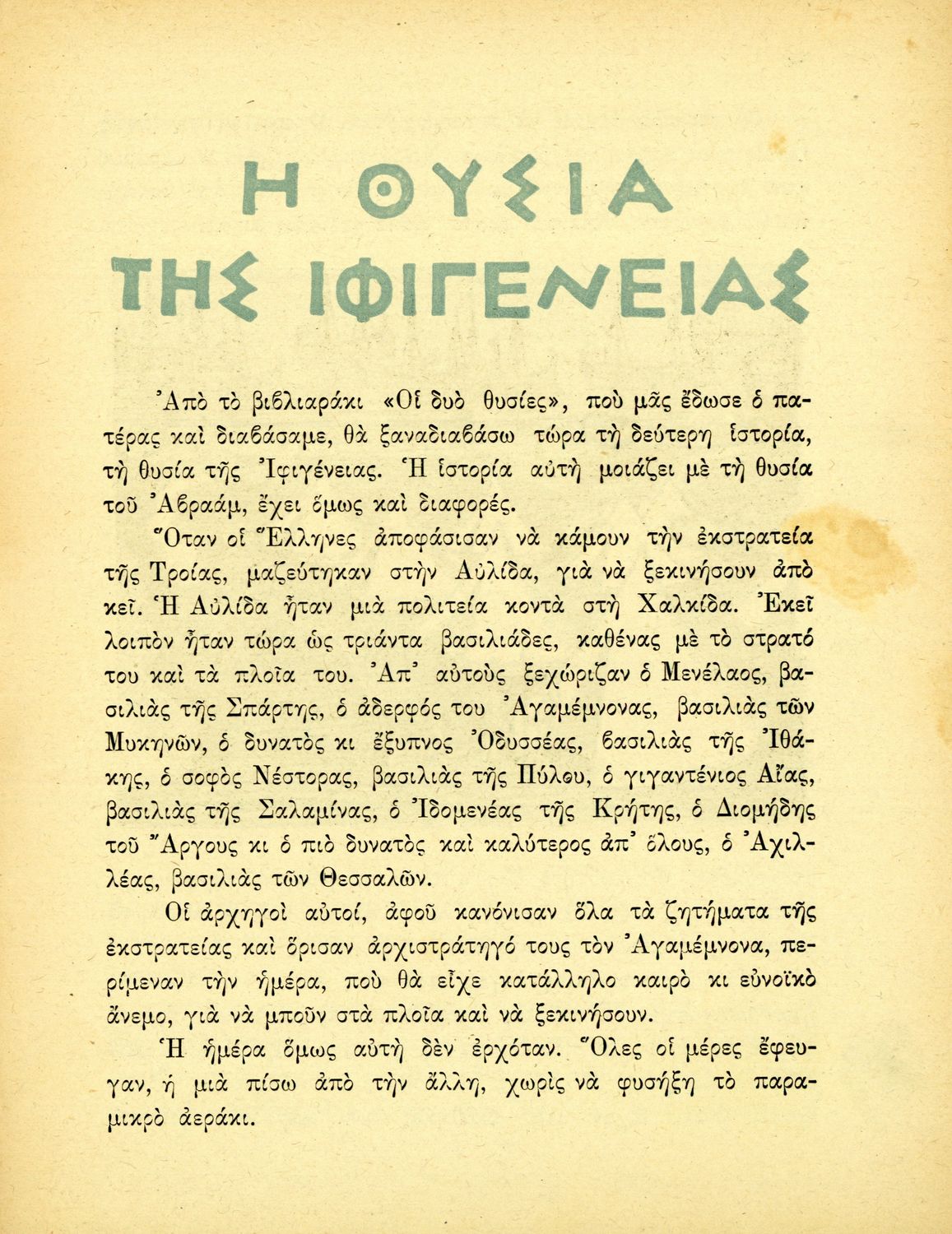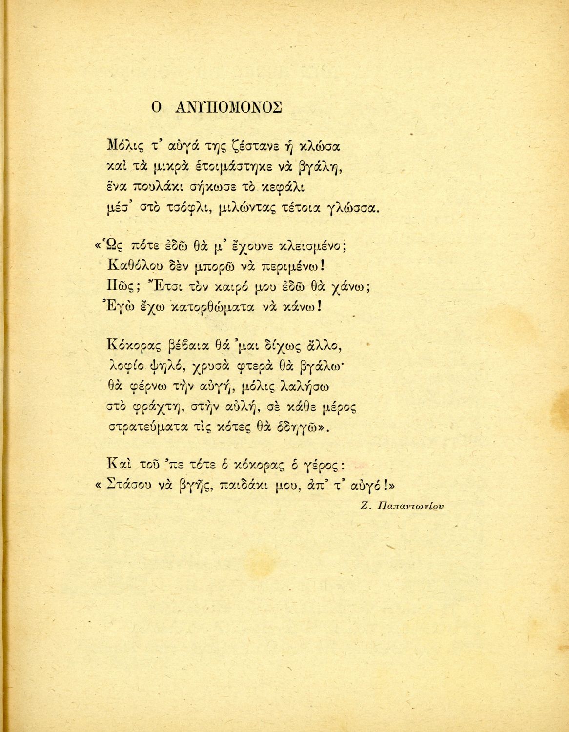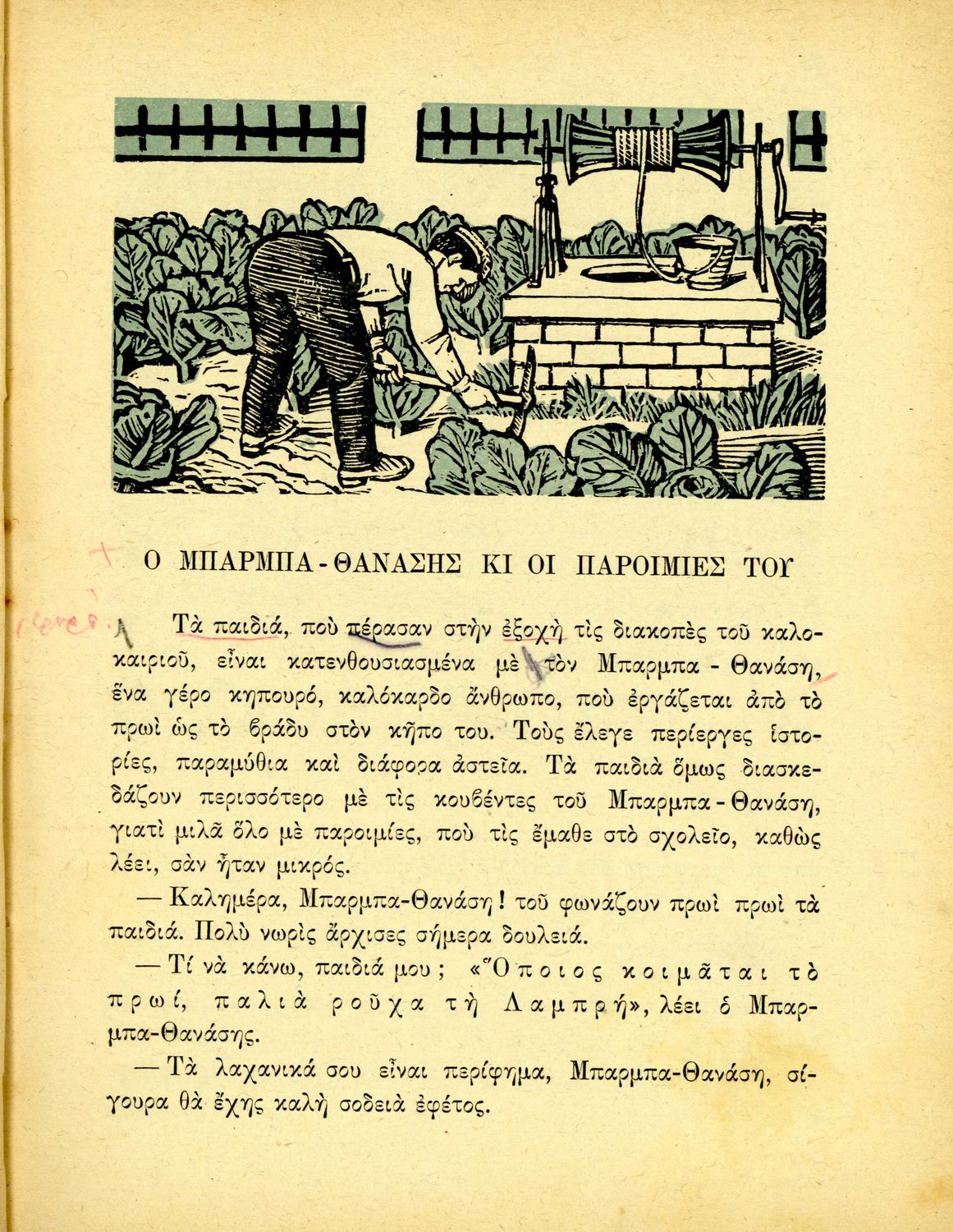 Αναγνωστικό Γ΄ Δημοτικού που περιλαμβάνει ποιήματα και πεζά εμπνευσμένα από την ελληνική φύση, τις ασχολίες των κατοίκων, την σύγχρονη ελληνική ιστορία, την ελληνική μυθολογία και τις θρησκευτικές γιορτές.