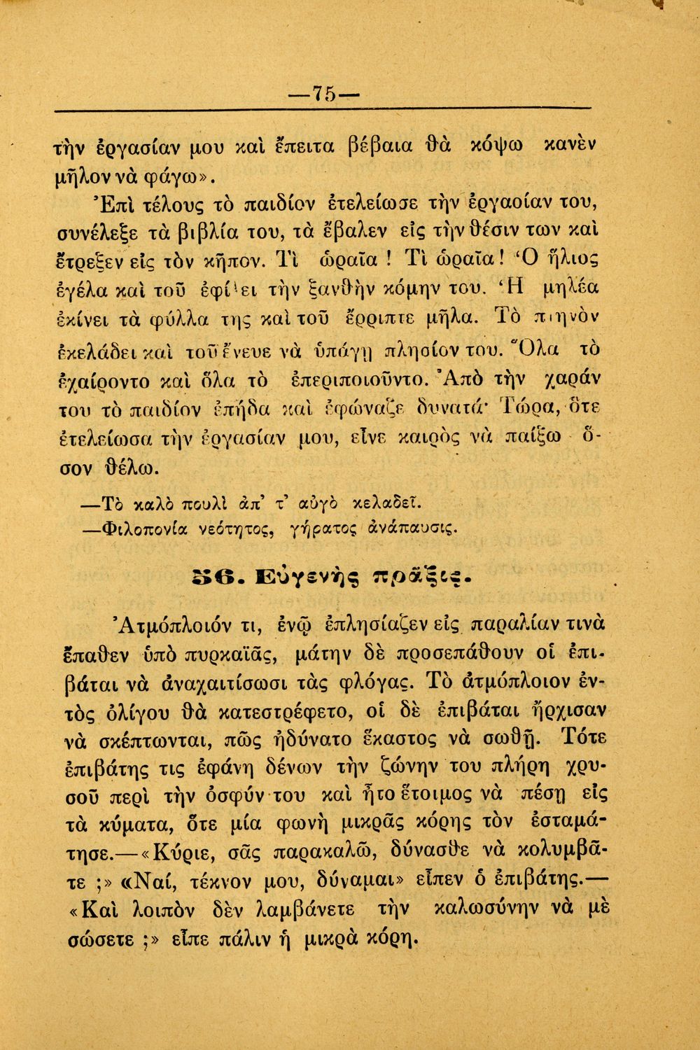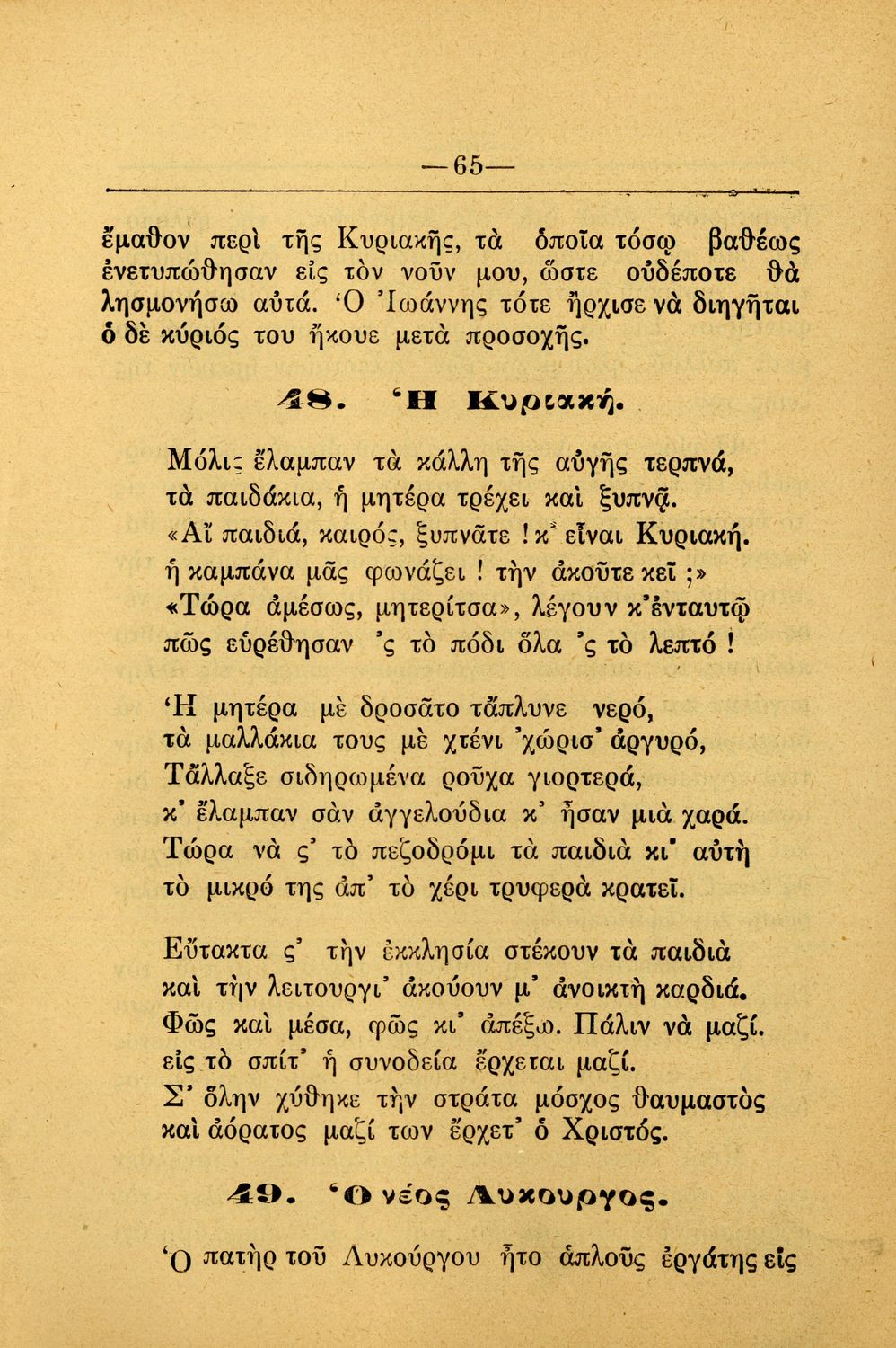 Βαθμίδα εκπαίδευσης: Πρωτοβάθμια Τάξη: Γ' Δημοτικού Μάθημα: Νέα Ελληνικά Γλώσσα: Απλή καθαρεύουσα Παρουσίαση περιεχομένου: Αναγνωστικό Γ΄ Δημοτικού που περιλαμβάνει ποιήματα και πεζά εμπνευσμένα από την ελληνική φύση, τις ασχολίες των κατοίκων, την σύγχρονη ελληνική ιστορία, την ελληνική μυθολογία και τις θρησκευτικές γιορτές. |
