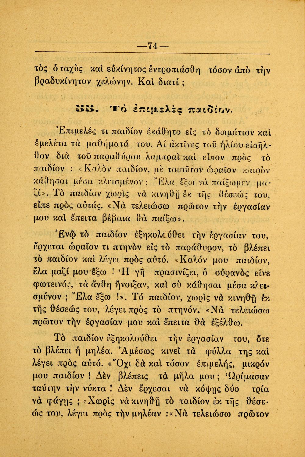 Κωδικός αναγνώρισης: 04-00091 Τίτλος: Τα καλά μαθήματα. Αναγνωστικόν κράτους τρίτης τάξεως των Δημοτικών Σχολείων Συγγραφέας: Γαλάτεια Καζαντζάκη Μέγεθος και υπόστρωμα: Σχολικό εγχειρίδιο, μαλακό εξώφυλλο, 80 σελίδες. |