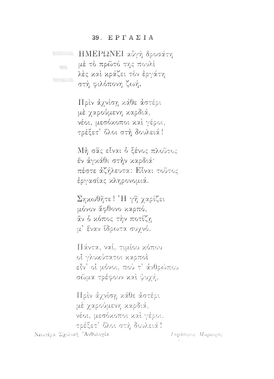 Αναγνωστικό Δ' Δημοτικού που είναι χωρισμένο σύμφωνα με τις εποχές του χρόνου και περιλαμβάνει ποιήματα και πεζά εμπνευσμένα από τη ζωή στην ύπαιθρο, την εθνική, οικογενειακή και κοινωνική ζωή, τη θρησκευτική παράδοση, τις ασχολίες των ανθρώπων, και την ελληνική φύση, ιστορία και μυθολογία.