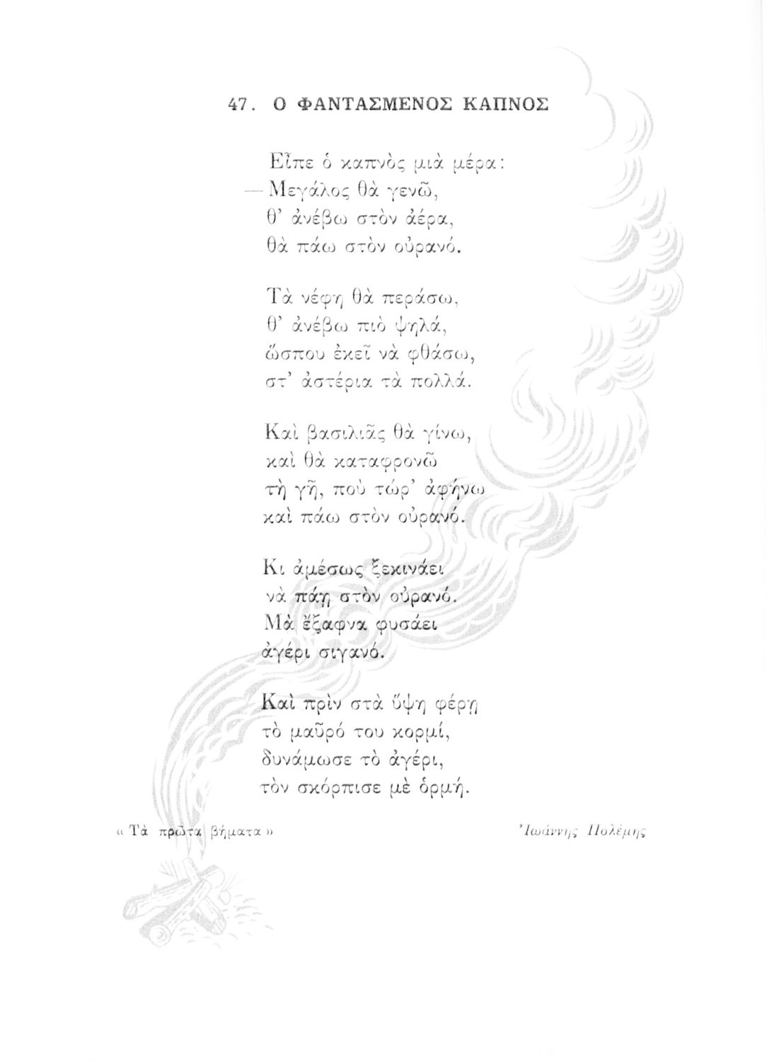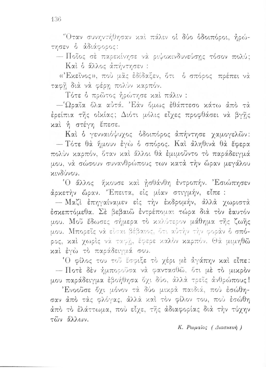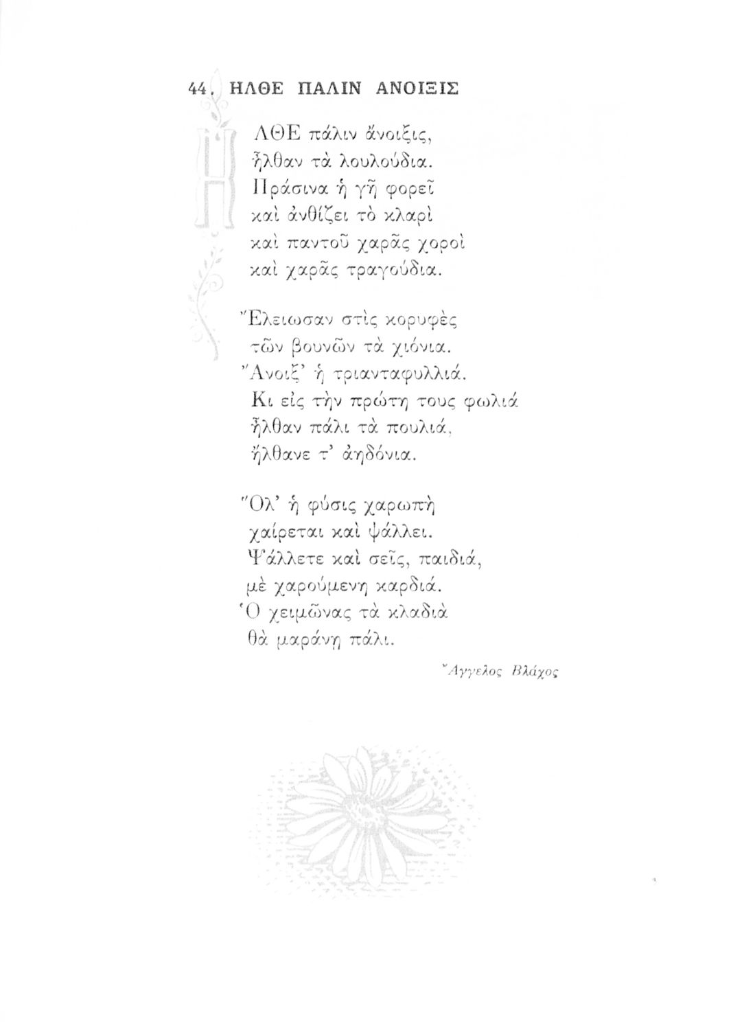 Αναγνωστικό Δ' Δημοτικού που είναι χωρισμένο σύμφωνα με τις εποχές του χρόνου και περιλαμβάνει ποιήματα και πεζά εμπνευσμένα από τη ζωή στην ύπαιθρο, την εθνική, οικογενειακή και κοινωνική ζωή, τη θρησκευτική παράδοση, τις ασχολίες των ανθρώπων, και την ελληνική φύση, ιστορία και μυθολογία.