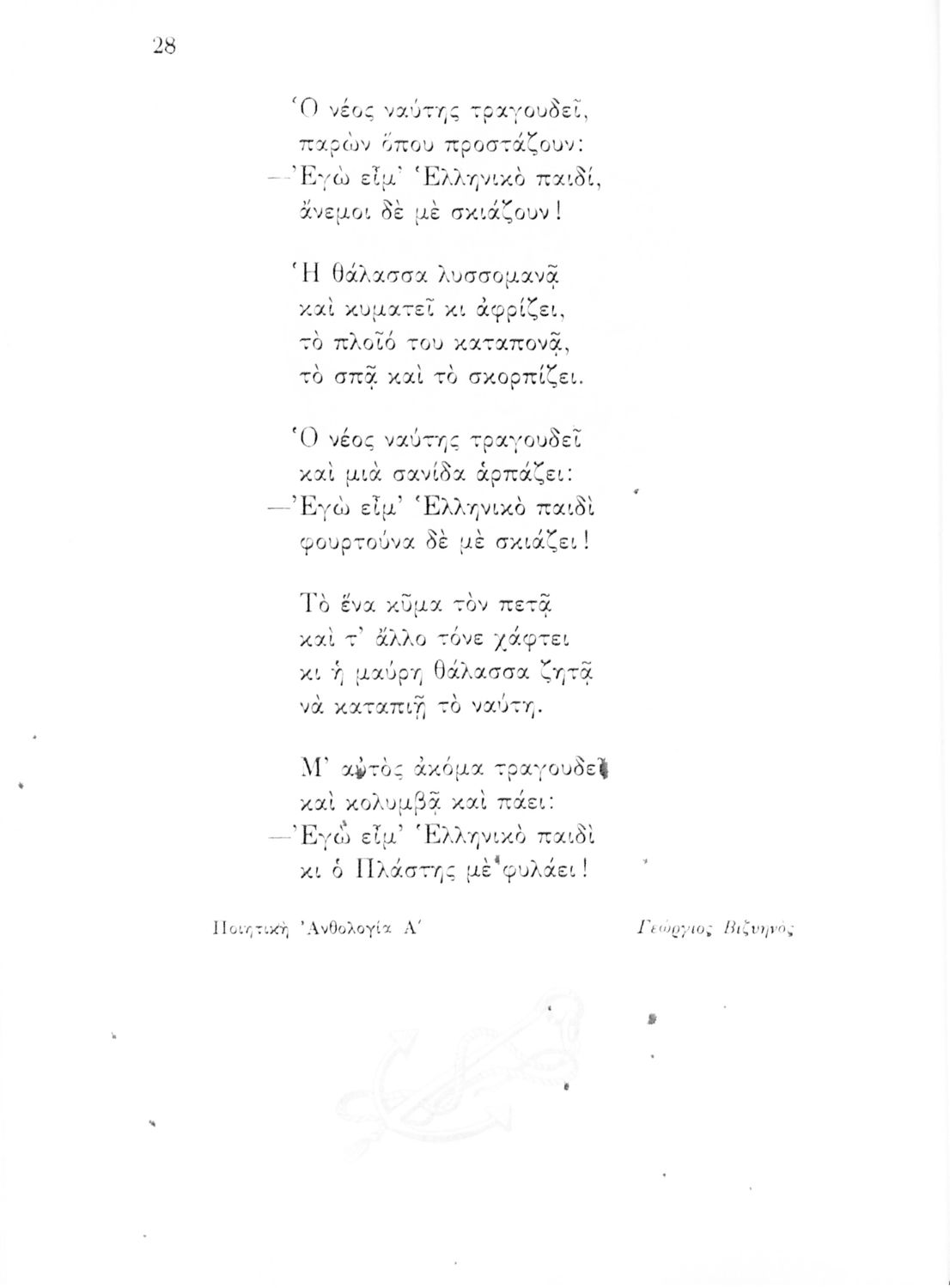 Βαθμίδα εκπαίδευσης: Πρωτοβάθμια Τάξη: Δ' Δημοτικού Μάθημα: Νέα Ελληνικά Γλώσσα: Απλή καθαρεύουσα Παρουσίαση περιεχομένου: Αναγνωστικό Δ' Δημοτικού που είναι χωρισμένο σύμφωνα με τις εποχές του χρόνου και περιλαμβάνει ποιήματα και πεζά εμπνευσμένα από τη ζωή στην ύπαιθρο, την εθνική, οικογενειακή και κοινωνική ζωή, τη θρησκευτική παράδοση, τις ασχολίες των ανθρώπων, και την ελληνική φύση, ιστορία και μυθολογία. |