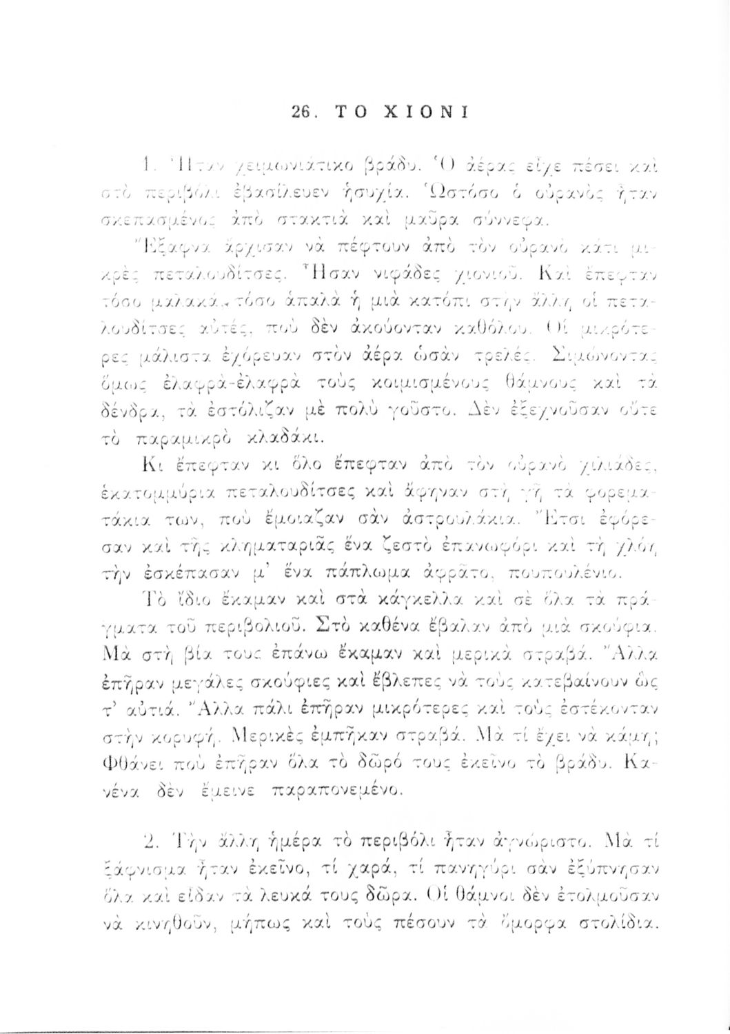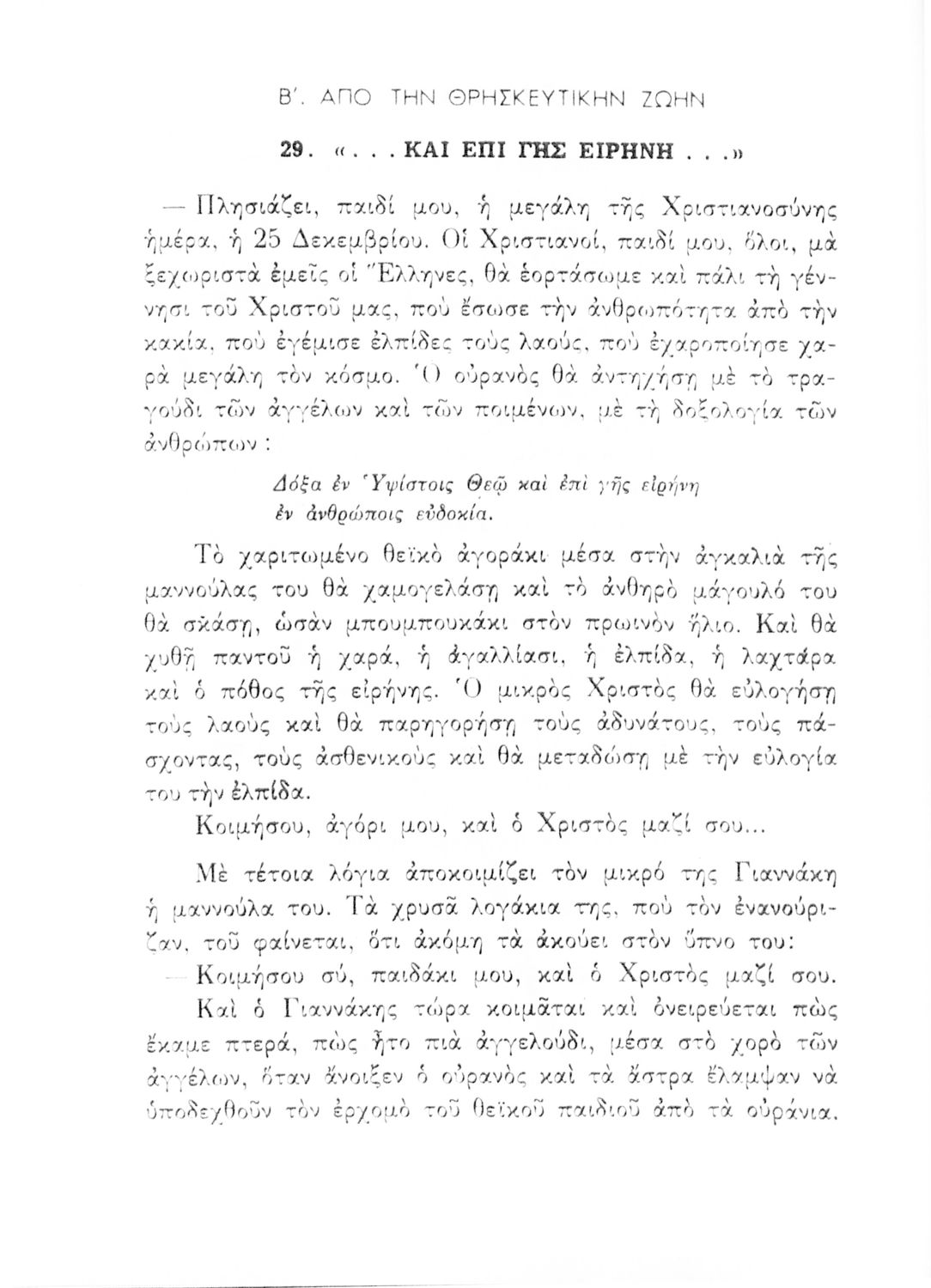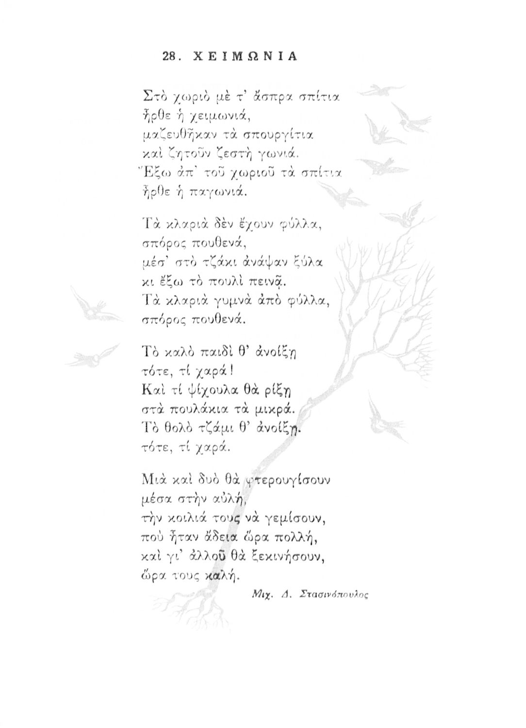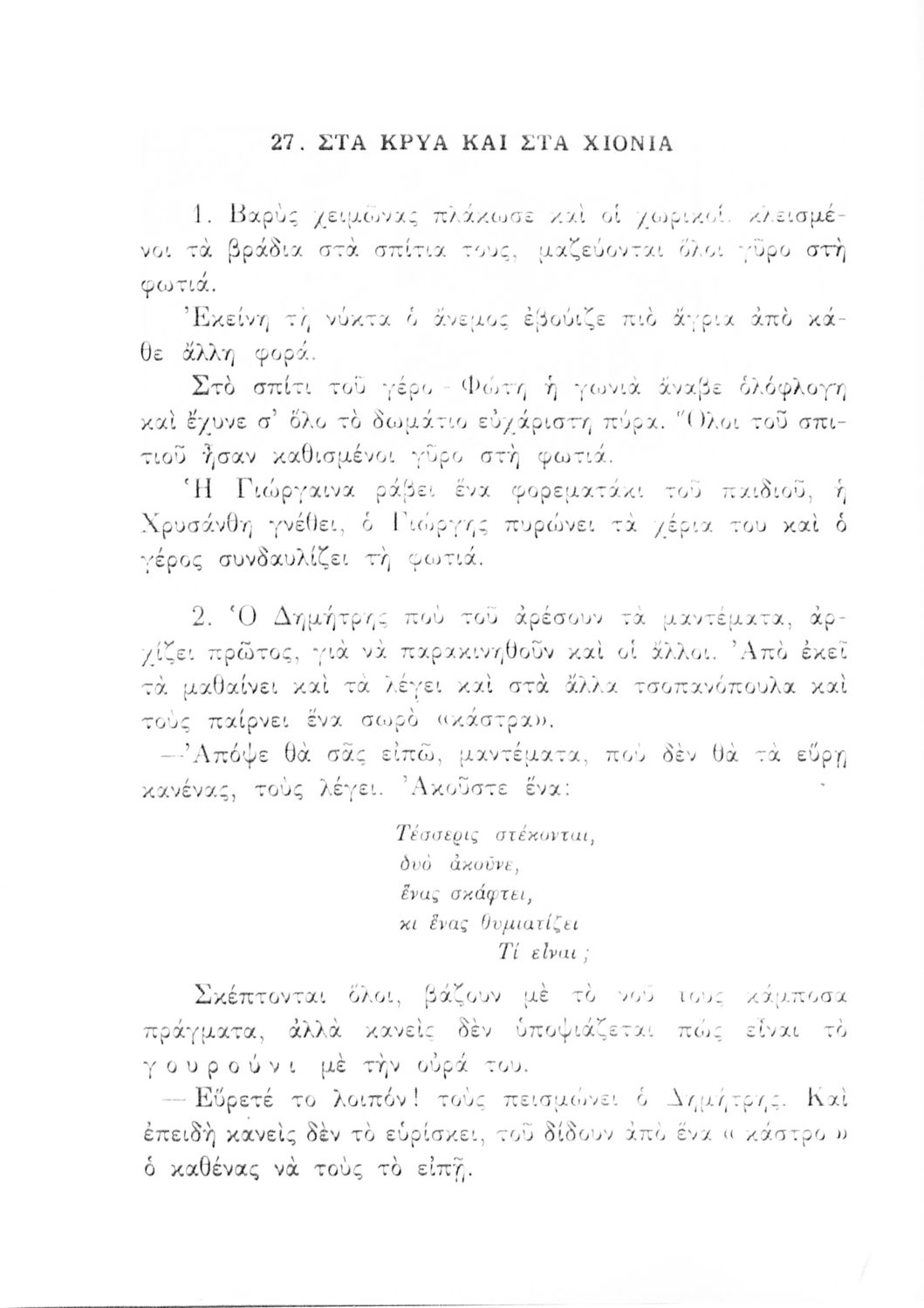 520 ## _aΑναγνωστικό Δ' Δημοτικού που είναι χωρισμένο σύμφωνα με τις εποχές του χρόνου και περιλαμβάνει ποιήματα και πεζά εμπνευσμένα από τη ζωή στην ύπαιθρο, την εθνική, οικογενειακή και κοινωνική ζωή, τη θρησκευτική παράδοση, τις ασχολίες των ανθρώπων, και την ελληνική φύση, ιστορία και μυθολογία.