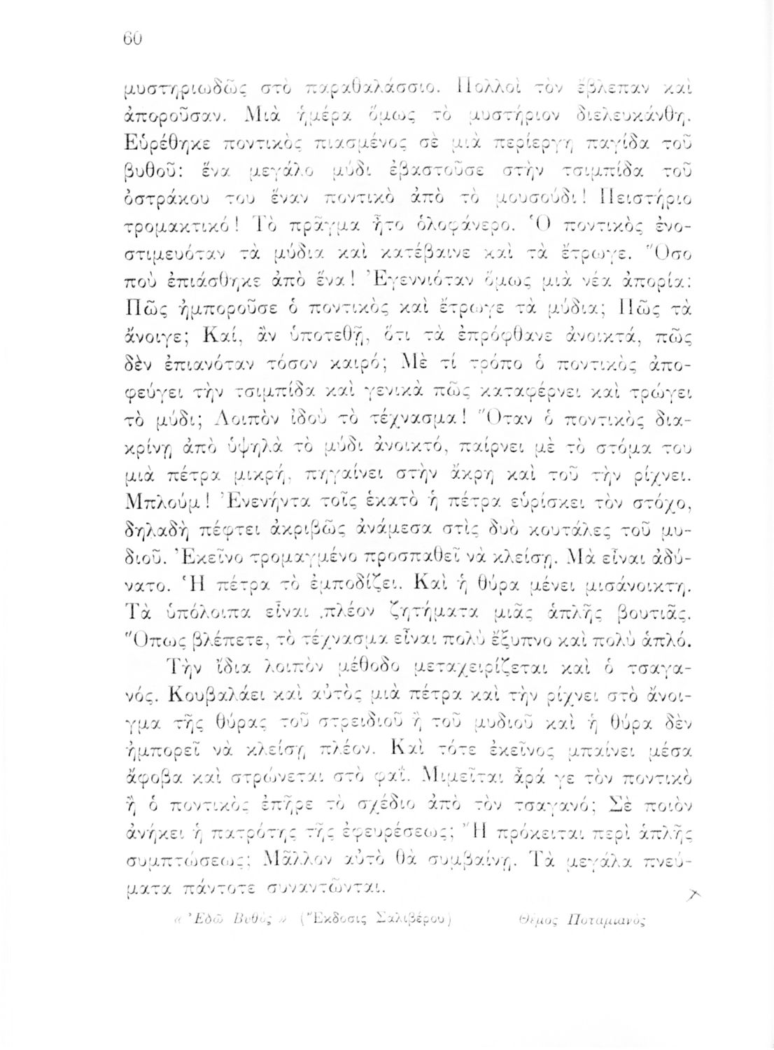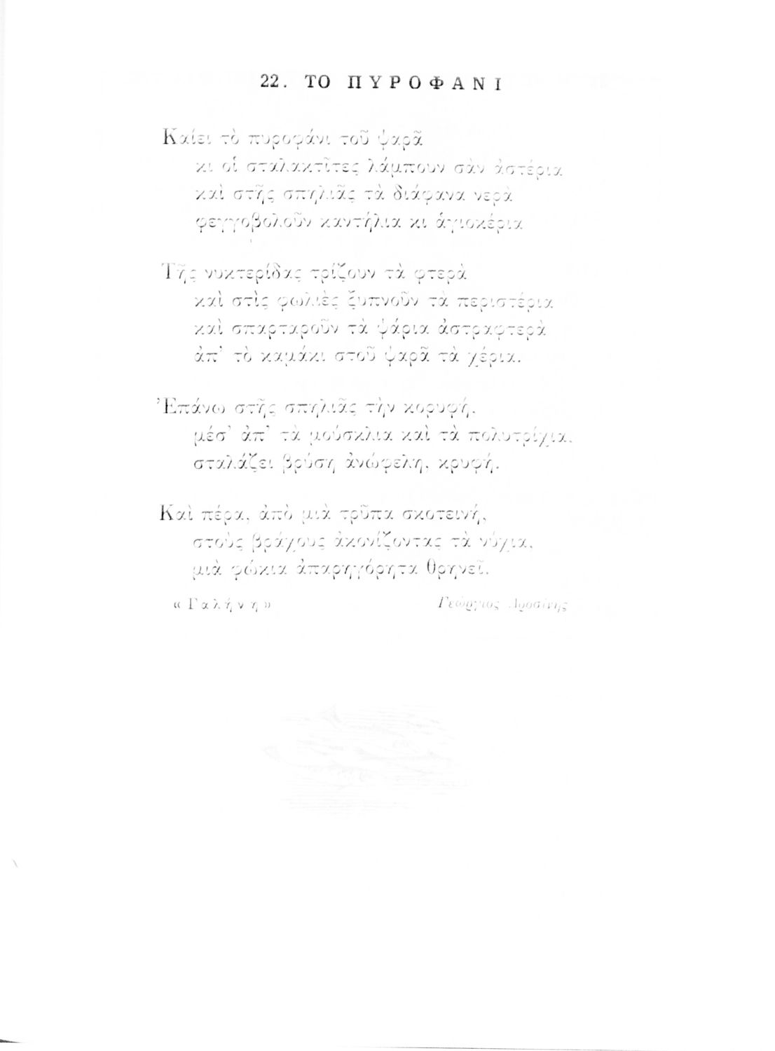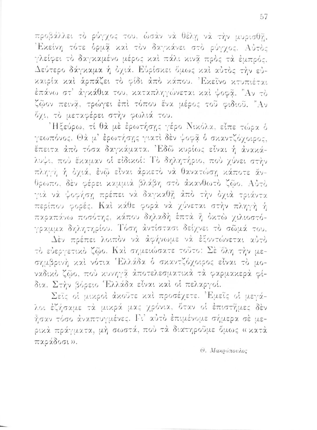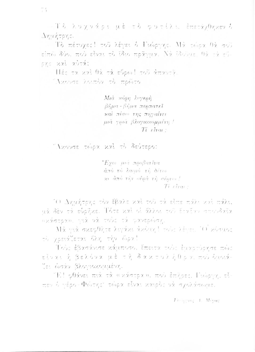 520 ## _aΑναγνωστικό Δ' Δημοτικού που είναι χωρισμένο σύμφωνα με τις εποχές του χρόνου και περιλαμβάνει ποιήματα και πεζά εμπνευσμένα από τη ζωή στην ύπαιθρο, την εθνική, οικογενειακή και κοινωνική ζωή, τη θρησκευτική παράδοση, τις ασχολίες των ανθρώπων, και την ελληνική φύση, ιστορία και μυθολογία.