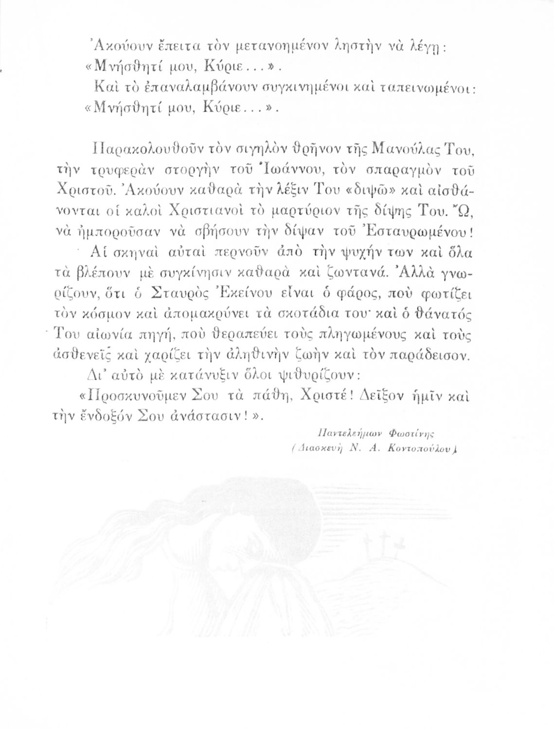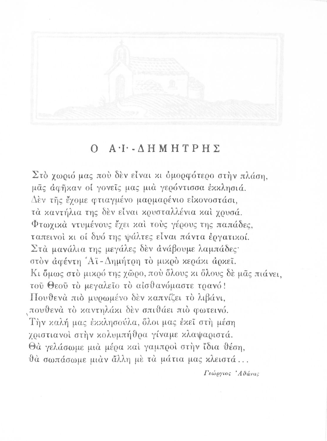 Αναγνωστικό ΣΤ΄ Δημοτικού που περιέχει πεζά και ποιήματα εμπνευσμένα από τη θρησκευτική, εθνική, κοινωνική και ατομική ζωή, την ελληνική φύση, ιστορία και μυθολογία και την υγιεινή.