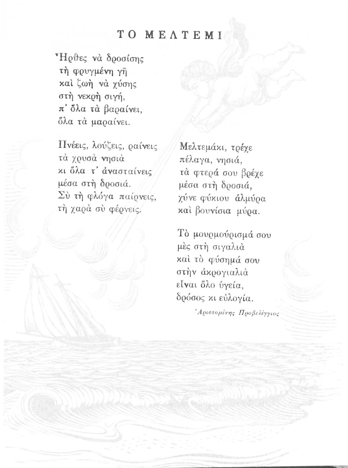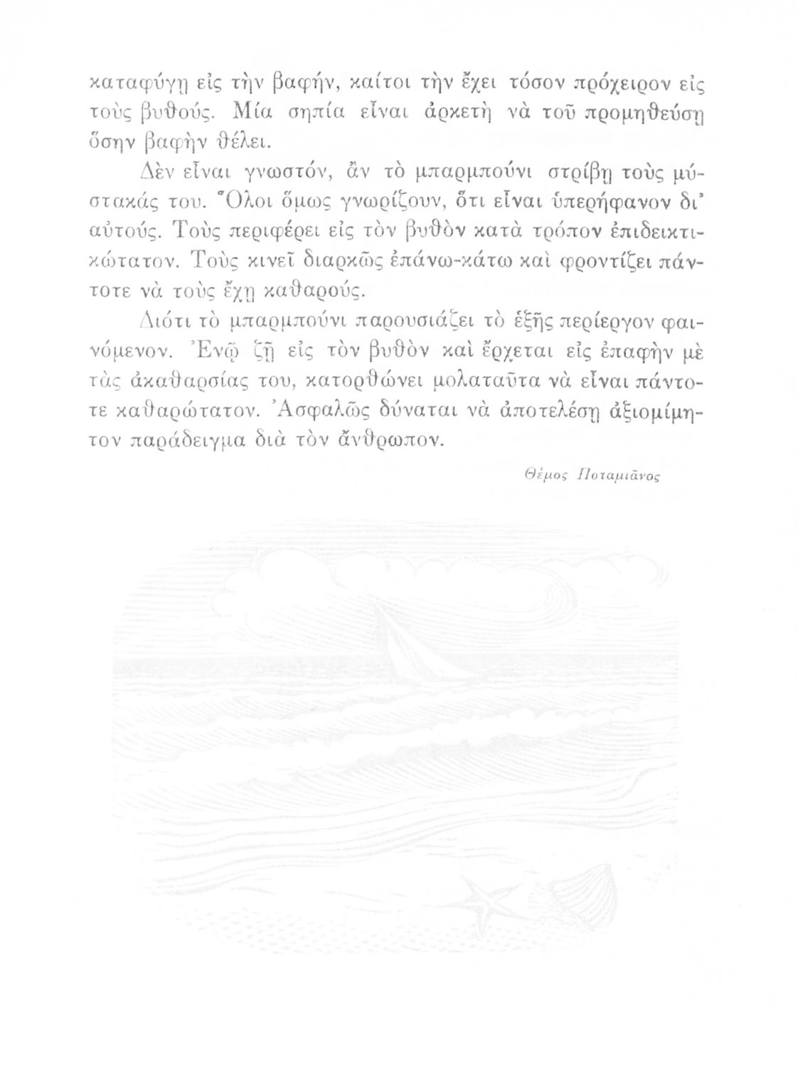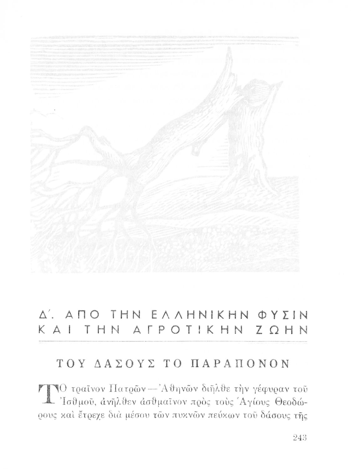 Αναγνωστικό ΣΤ΄ Δημοτικού που περιλαμβάνει θέματα από τις ελληνικές παραδόσεις και μύθους, την ελληνική φύση και θάλασσα και το τρίπτυχο "Πατρίς-θρησκεία-οικογένειαα".