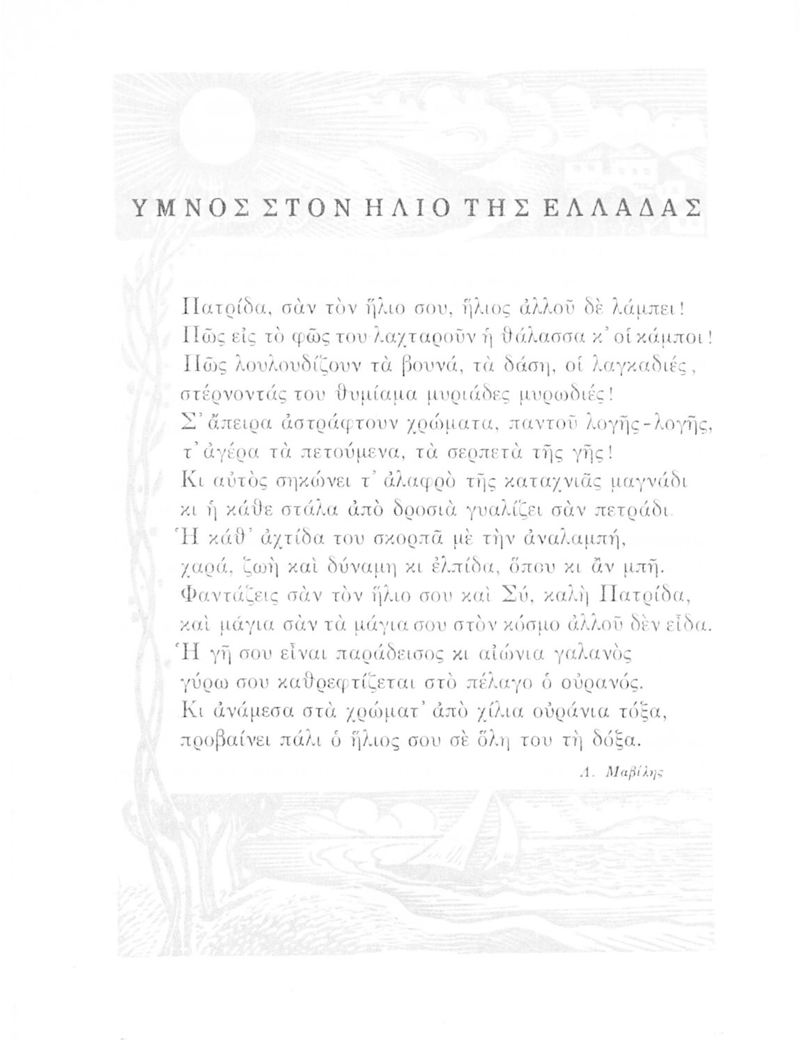 Αναγνωστικό ΣΤ΄ Δημοτικού που περιλαμβάνει θέματα από τις ελληνικές παραδόσεις και μύθους, την ελληνική φύση και θάλασσα και το τρίπτυχο "Πατρίς-θρησκεία-οικογένειαα".
