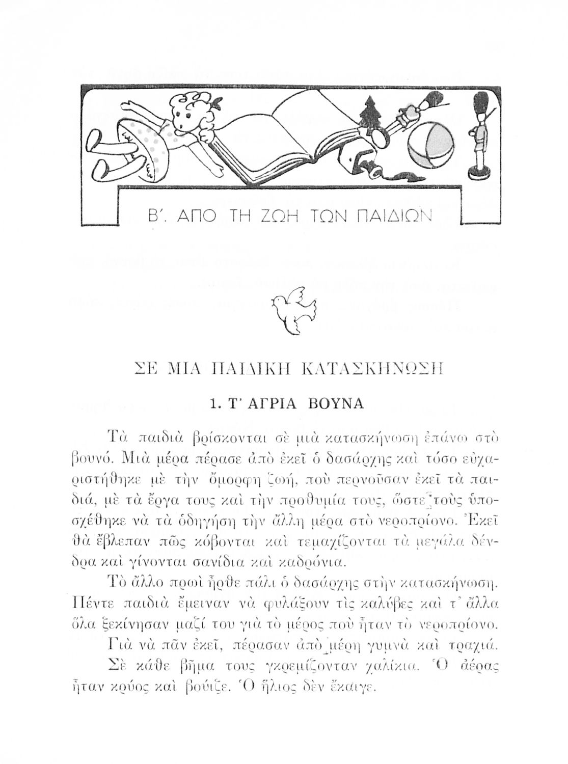Αναγνωστικό Δ΄ Δημοτικού που περιέχει πεζά και ποιήματα εμπνευσμένα από την ελληνική ιστορία και μυθολογία, την κοινωνική ζωή και την ελληνική φύση.