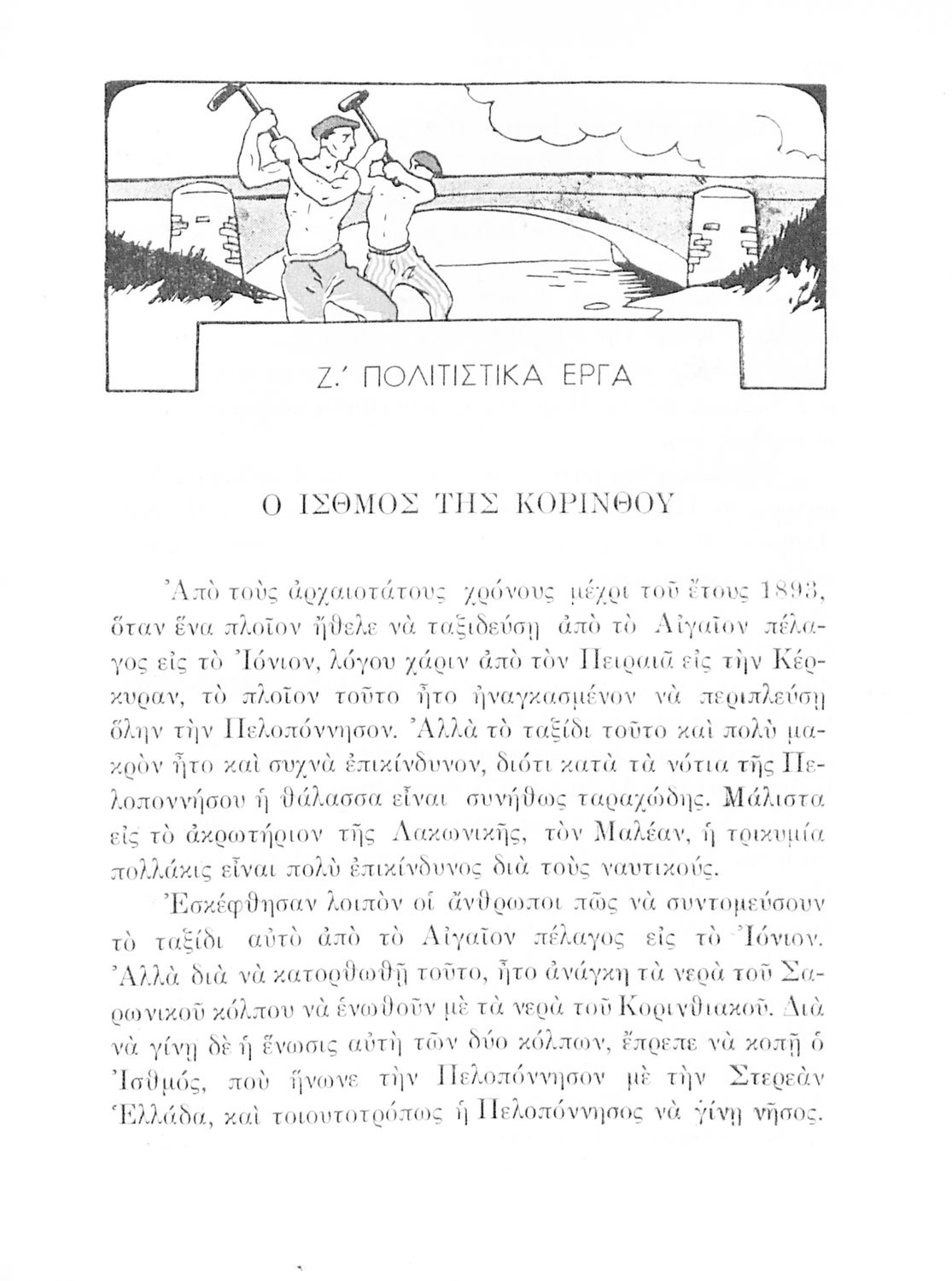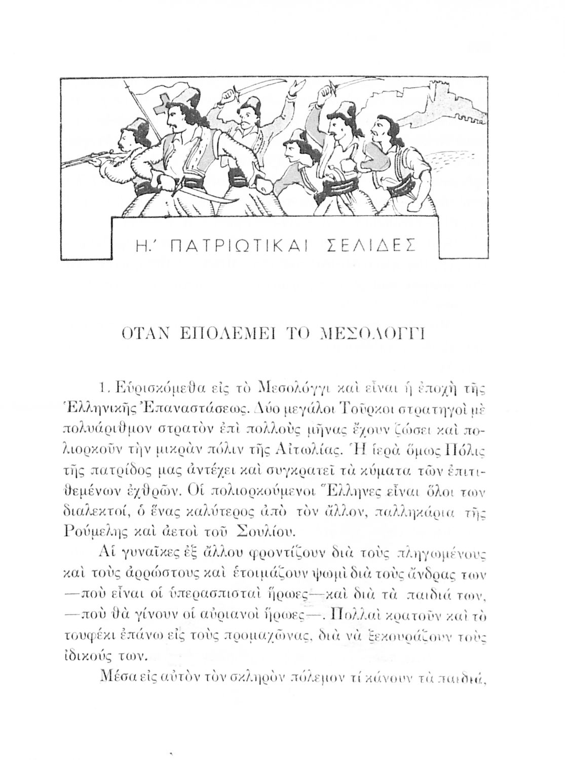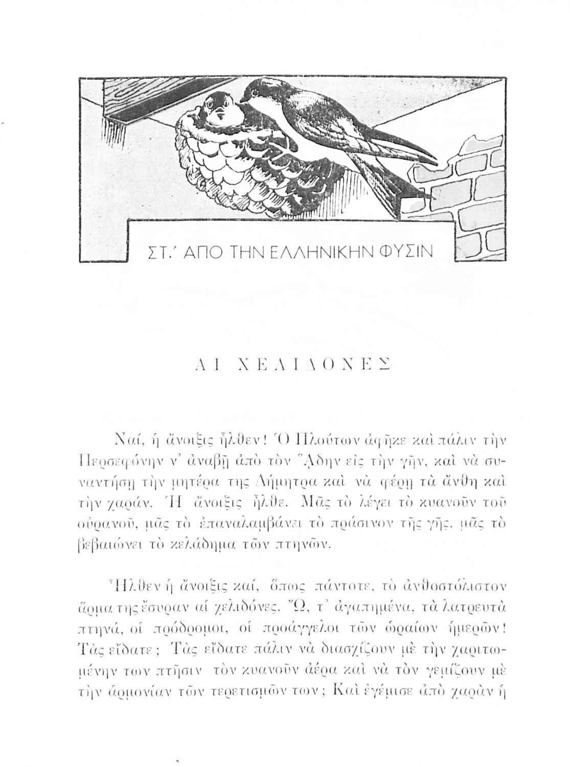 Αναγνωστικό Δ΄ Δημοτικού που περιέχει πεζά και ποιήματα εμπνευσμένα από την ελληνική ιστορία και μυθολογία, την κοινωνική ζωή και την ελληνική φύση.