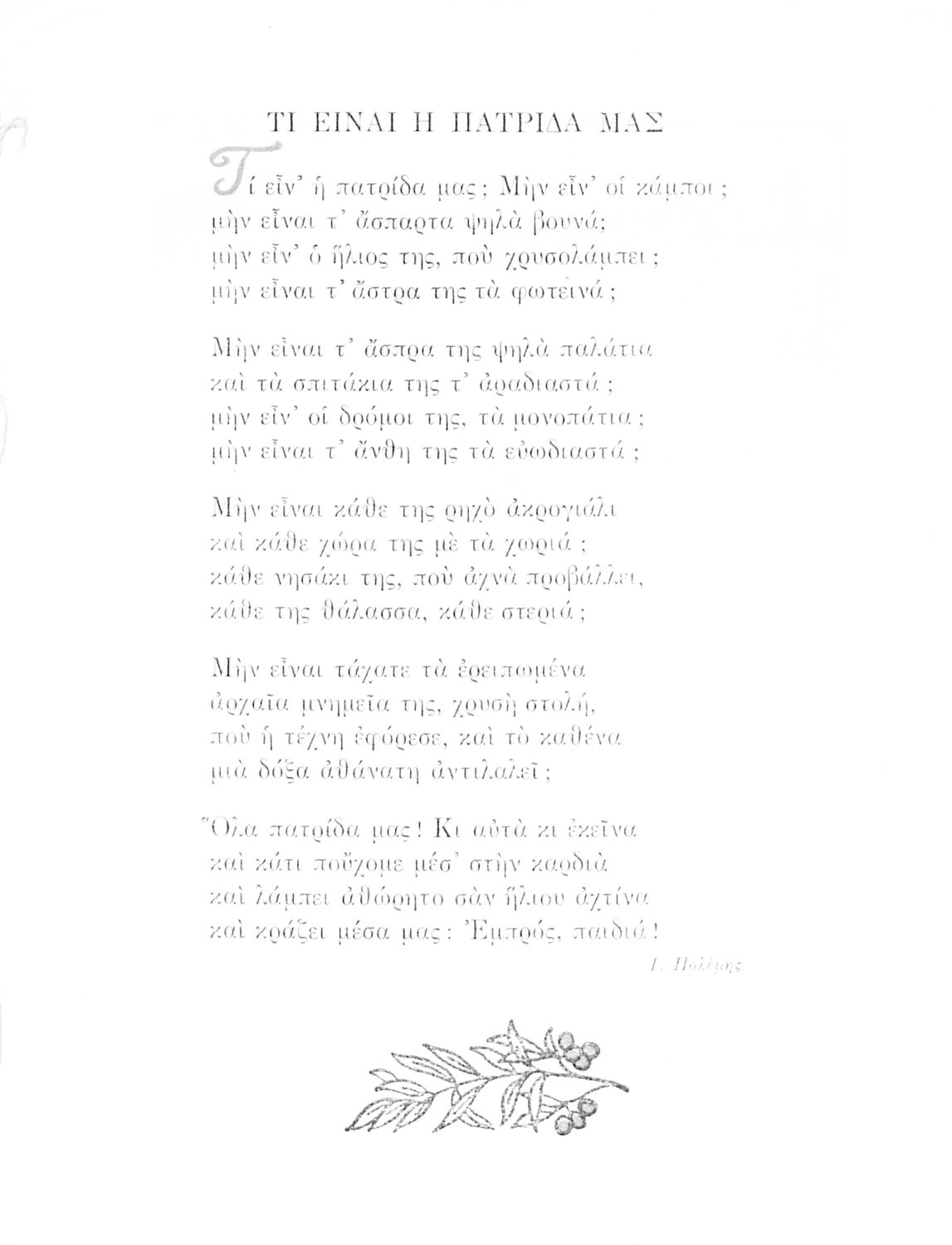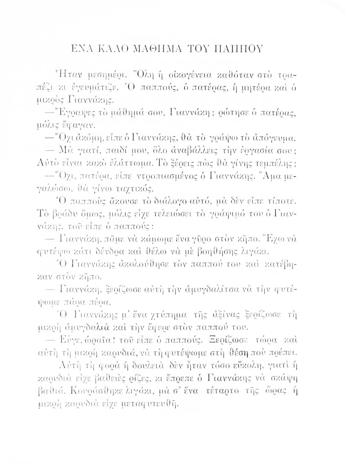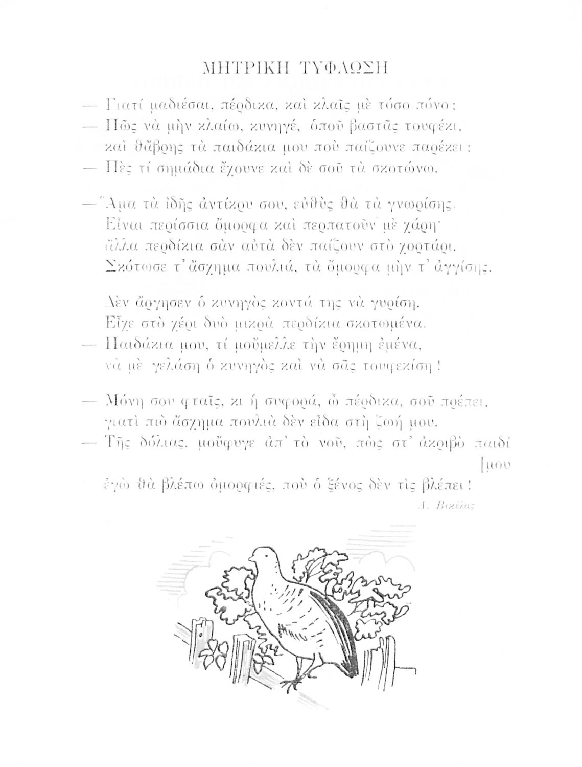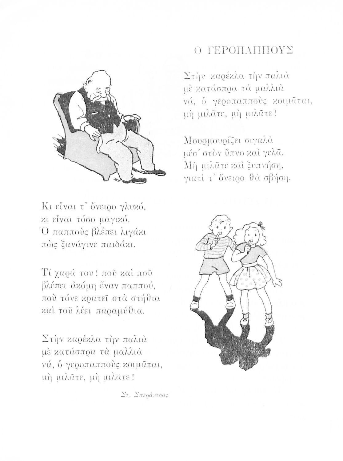 Αναγνωστικό Δ΄ Δημοτικού που περιέχει πεζά και ποιήματα εμπνευσμένα από την ελληνική ιστορία και μυθολογία, την κοινωνική ζωή και την ελληνική φύση.