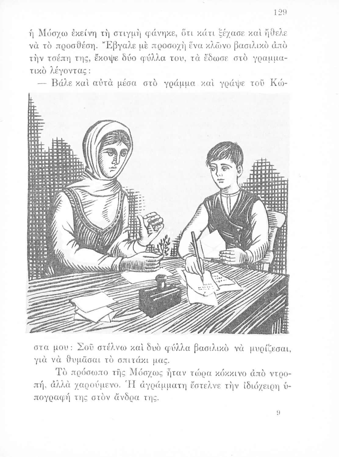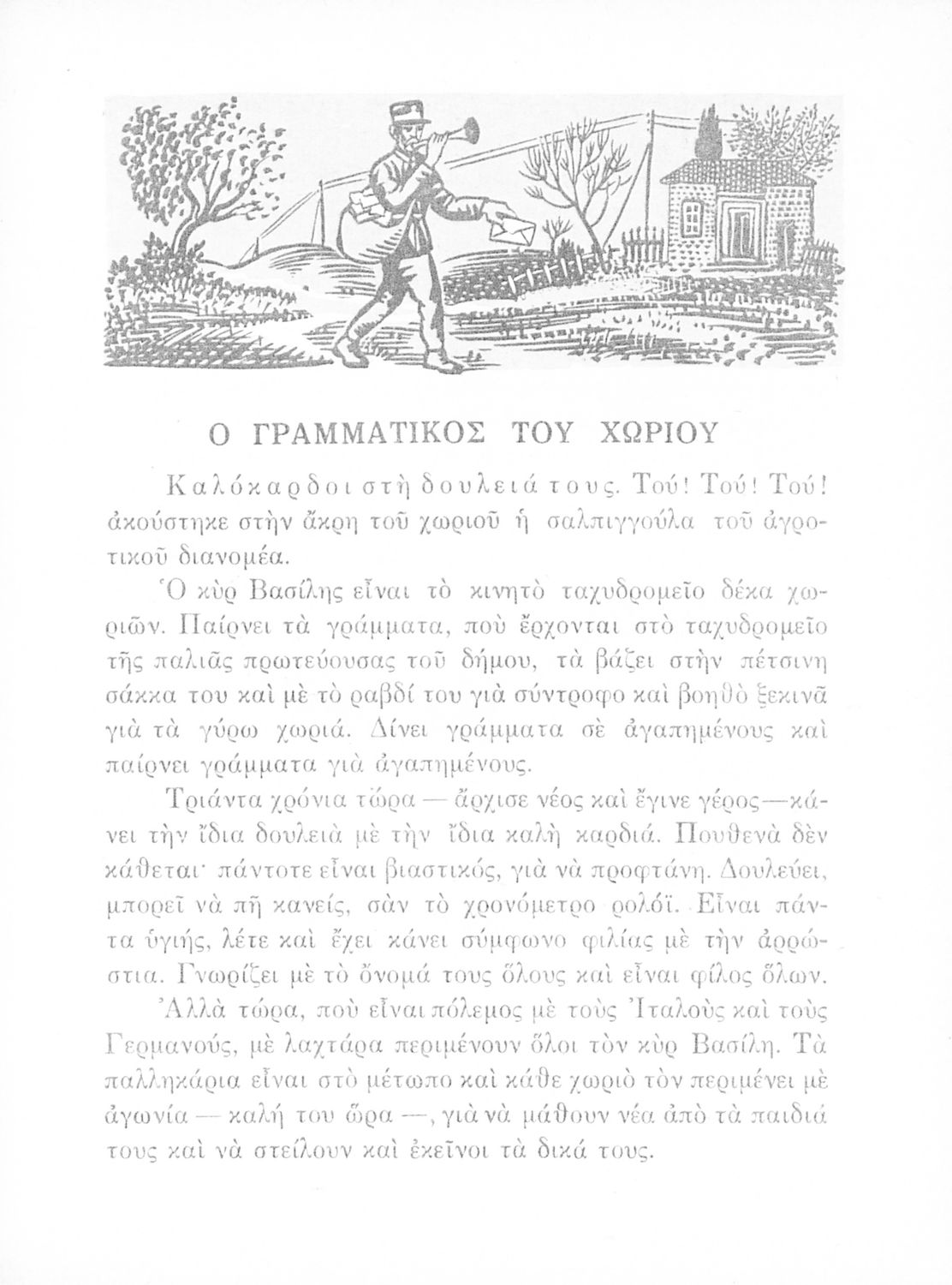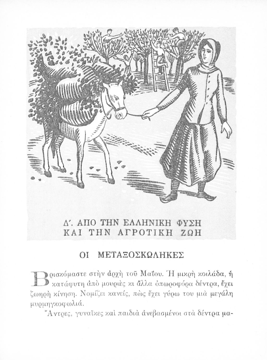 Αναγνωστικό Ε΄ Δημοτικού που περιλαμβάνει πεζογραφήματα εμπνευσμένα από την ελληνική φύση, την αγροτική ζωή και από το τρίπτυχο "Πατρίς- θρησκεία- οικογένεια".
