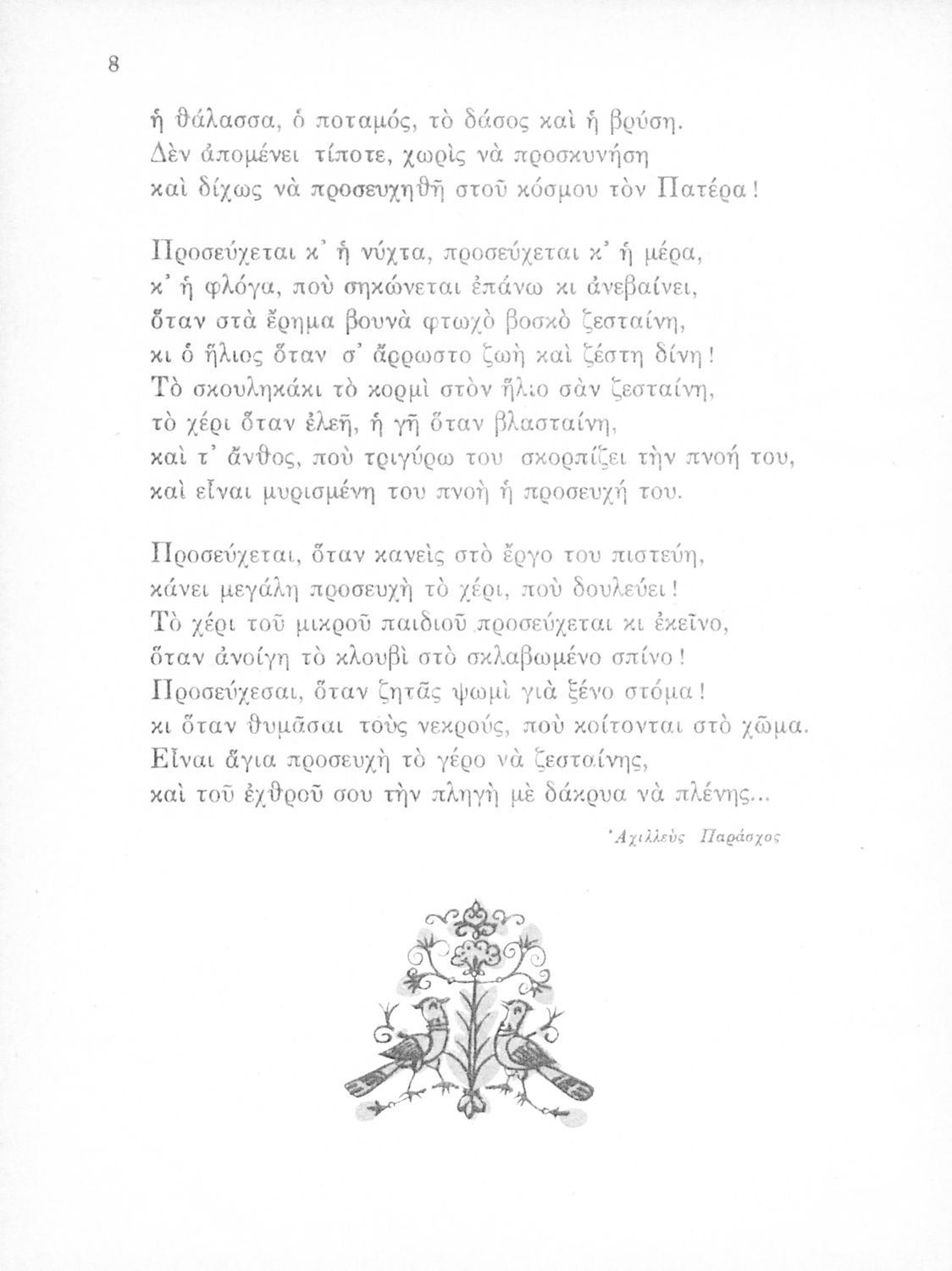Αναγνωστικό Ε΄ Δημοτικού που περιλαμβάνει πεζογραφήματα εμπνευσμένα από την ελληνική φύση, την αγροτική ζωή και από το τρίπτυχο "Πατρίς- θρησκεία- οικογένεια".