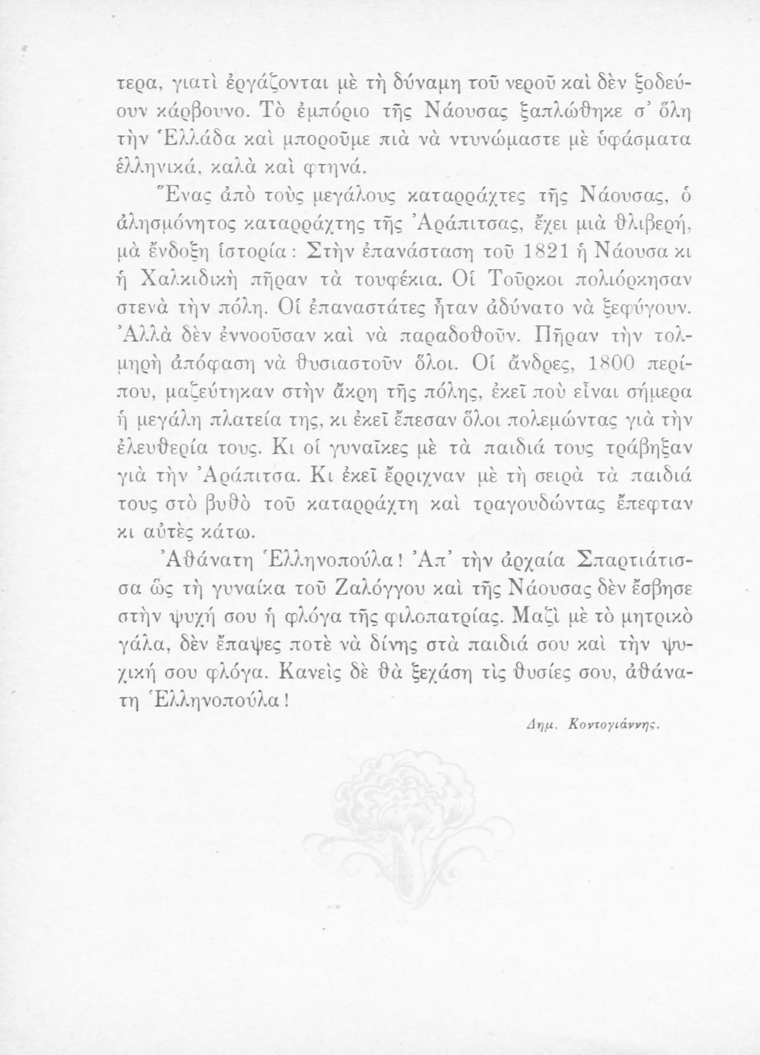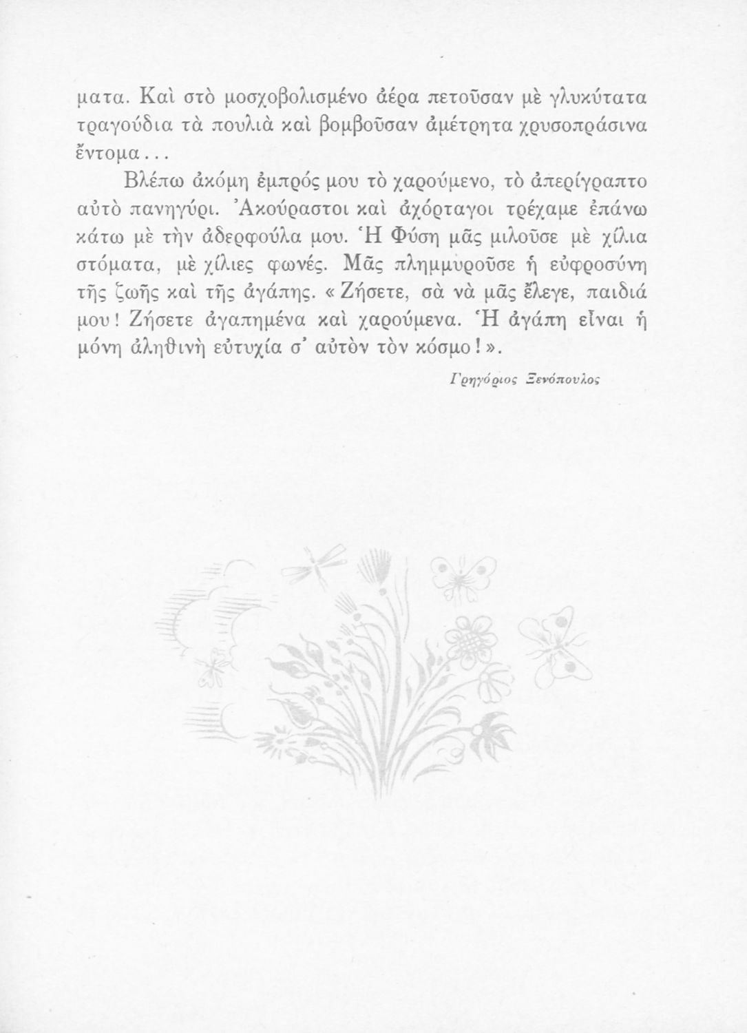 Αναγνωστικό ΣΤ΄ Δημοτικού που περιέχει πεζά και ποιήματα εμπνευσμένα από τη θρησκευτική, εθνική, κοινωνική και ατομική ζωή, την ελληνική φύση, ιστορία και μυθολογία και την υγιεινή.