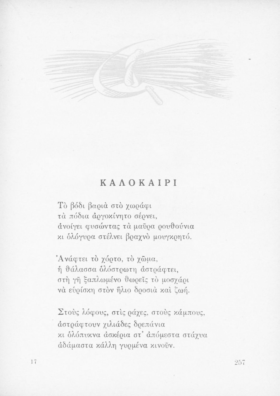 Αναγνωστικό ΣΤ΄ Δημοτικού που περιέχει πεζά και ποιήματα εμπνευσμένα από τη θρησκευτική, εθνική, κοινωνική και ατομική ζωή, την ελληνική φύση, ιστορία και μυθολογία και την υγιεινή.
