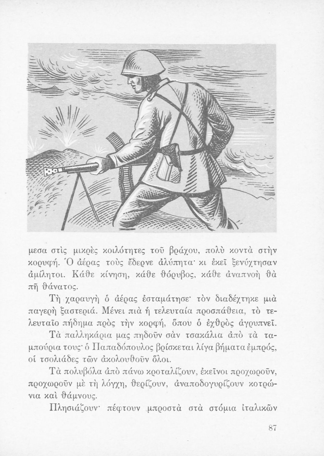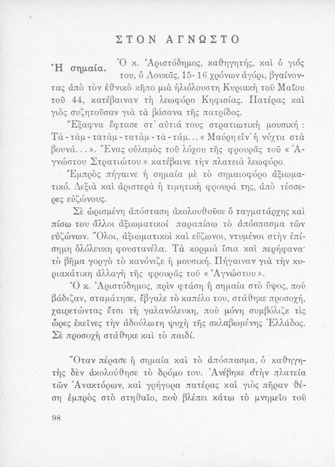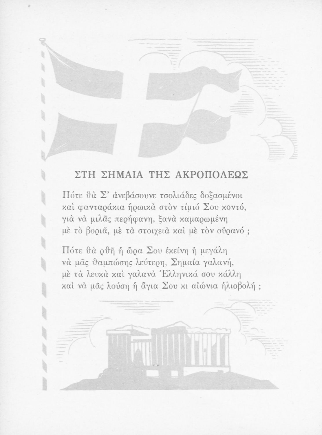 Αναγνωστικό ΣΤ΄ Δημοτικού που περιλαμβάνει θέματα από τις ελληνικές παραδόσεις και μύθους, την ελληνική φύση και θάλασσα και το τρίπτυχο "Πατρίς-θρησκεία-οικογένειαα".