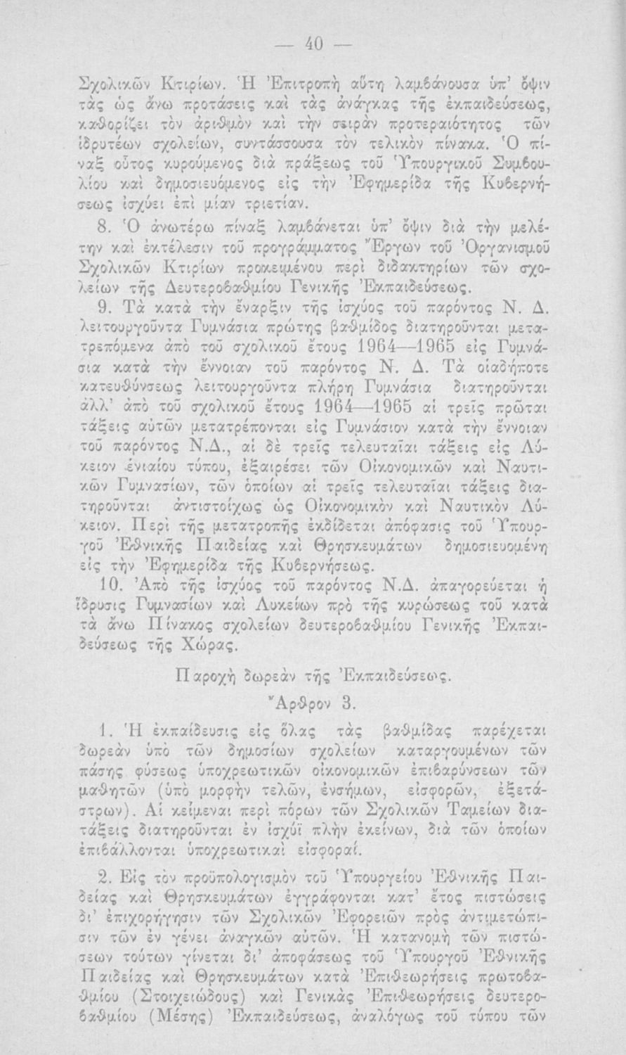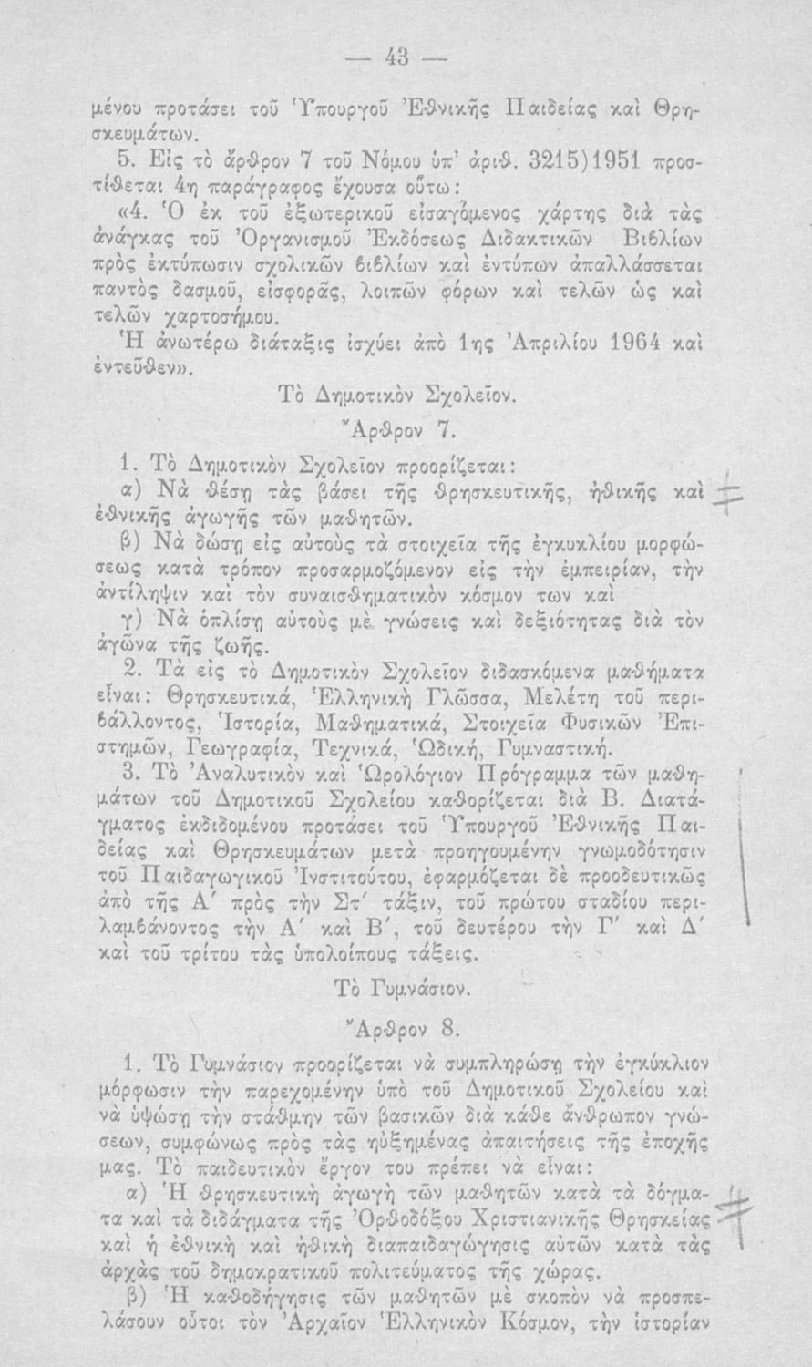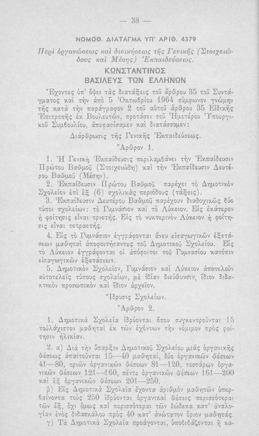 Έκδοση του Υπουργείου Εθνικής Παιδείας και Θρησκευμάτων που περιλαμβάνει το Ν.Δ. 4379/1964 (ΦΕΚ 182, 24-10-1964) "Περί οργανώσεως και διοικήσεως της Γενικής (Στοιχειώδους και Μέσης) Εκπαιδεύσεως".