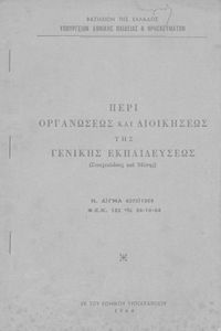 Βαθμίδα εκπαίδευσης: Πρωτοβάθμια, Δευτεροβάθμια Γλώσσα: Καθαρεύουσα Παρουσίαση περιεχομένου: Έκδοση του Υπουργείου Εθνικής Παιδείας και Θρησκευμάτων που περιλαμβάνει το Ν.Δ. 4379/1964 (ΦΕΚ 182, 24-10-1964) "Περί οργανώσεως και διοικήσεως της Γενικής (Στοιχειώδους και Μέσης) Εκπαιδεύσεως". |