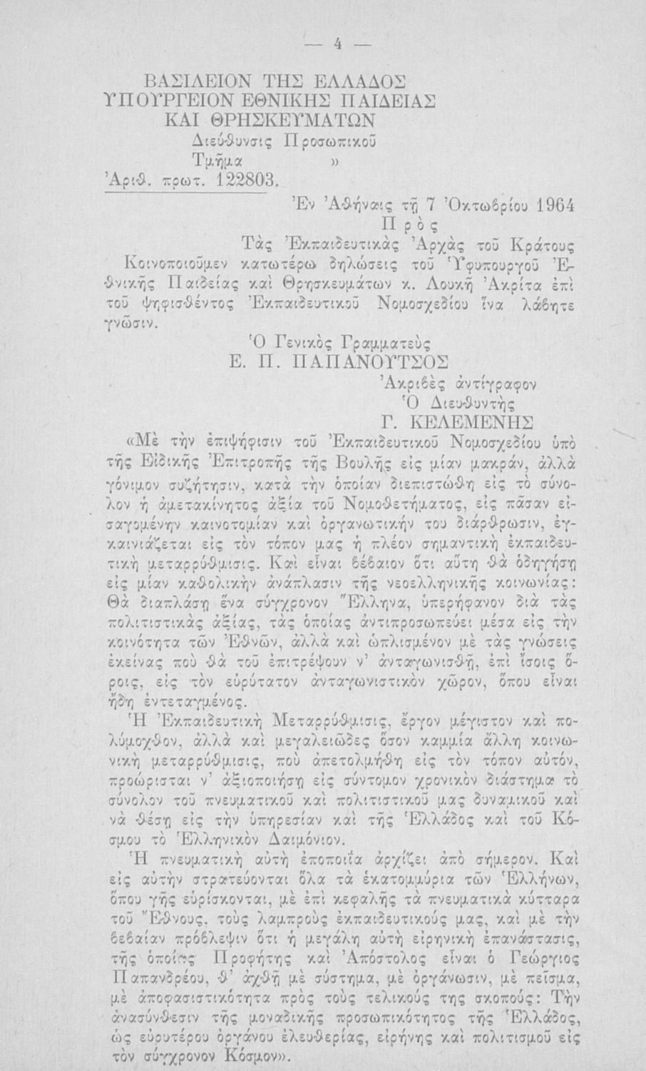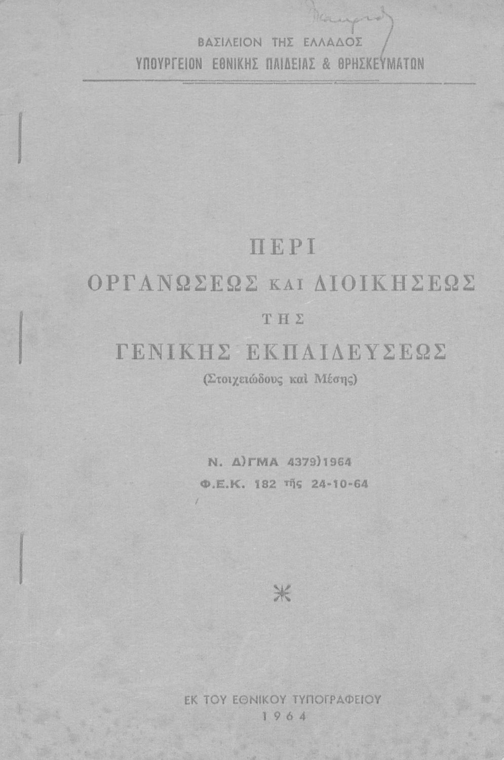Έκδοση του Υπουργείου Εθνικής Παιδείας και Θρησκευμάτων που περιλαμβάνει το Ν.Δ. 4379/1964 (ΦΕΚ 182, 24-10-1964) "Περί οργανώσεως και διοικήσεως της Γενικής (Στοιχειώδους και Μέσης) Εκπαιδεύσεως".