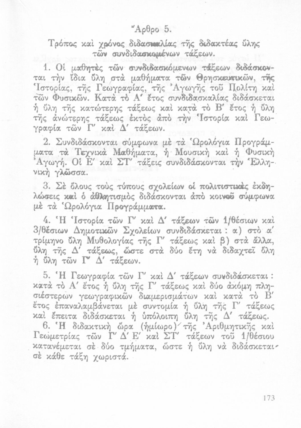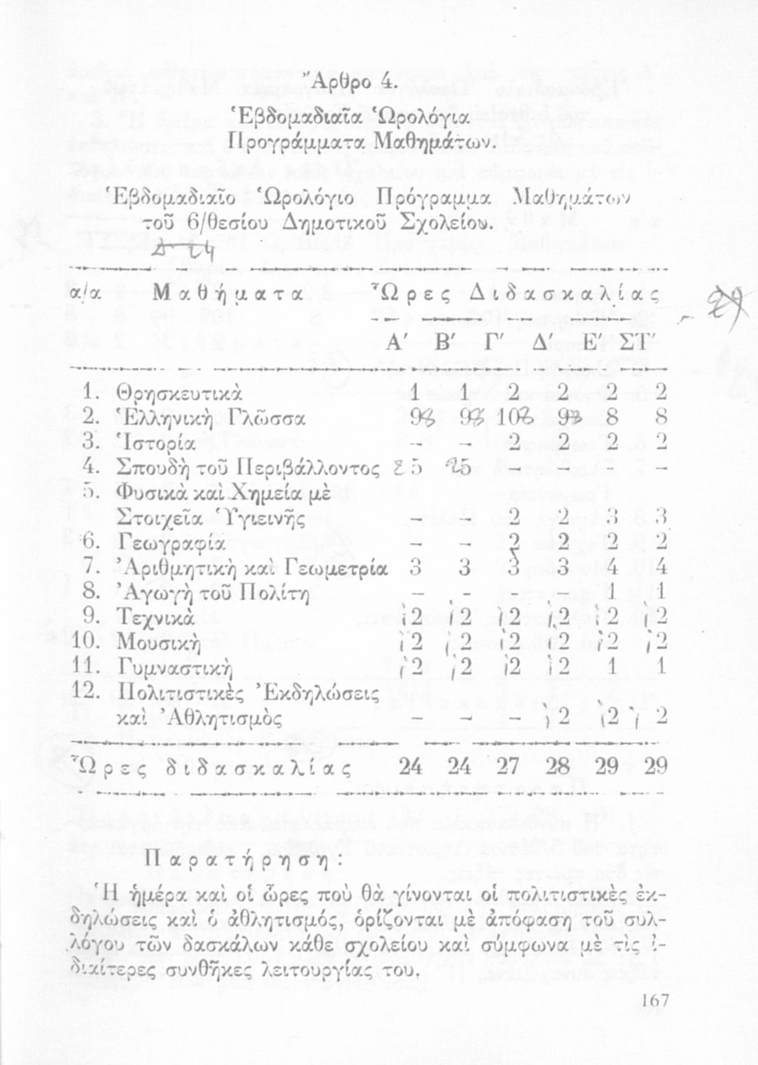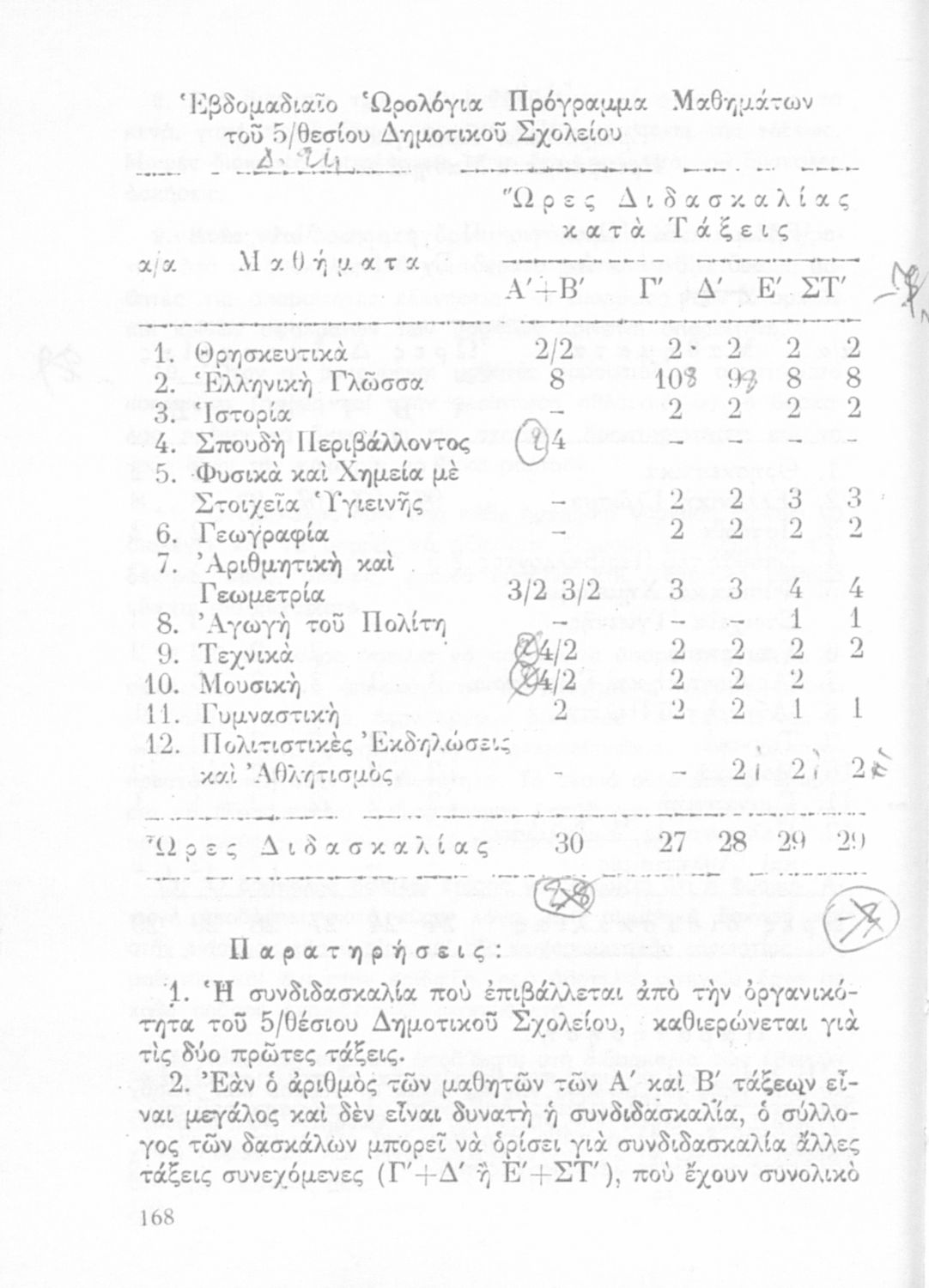 Έκδοση της Διδασκαλικής Ομοσπονδίας Ελλάδας που περιλαμβάνει το ωρολόγιο και αναλυτικό πρόγραμμα μαθημάτων του Δημοτικού Σχολείου κατά τη διάρκεια της δικτατορίας των συνταγματαρχών (1967 - 1974).