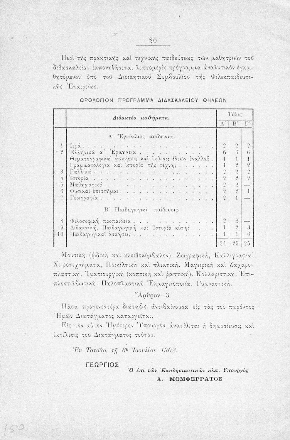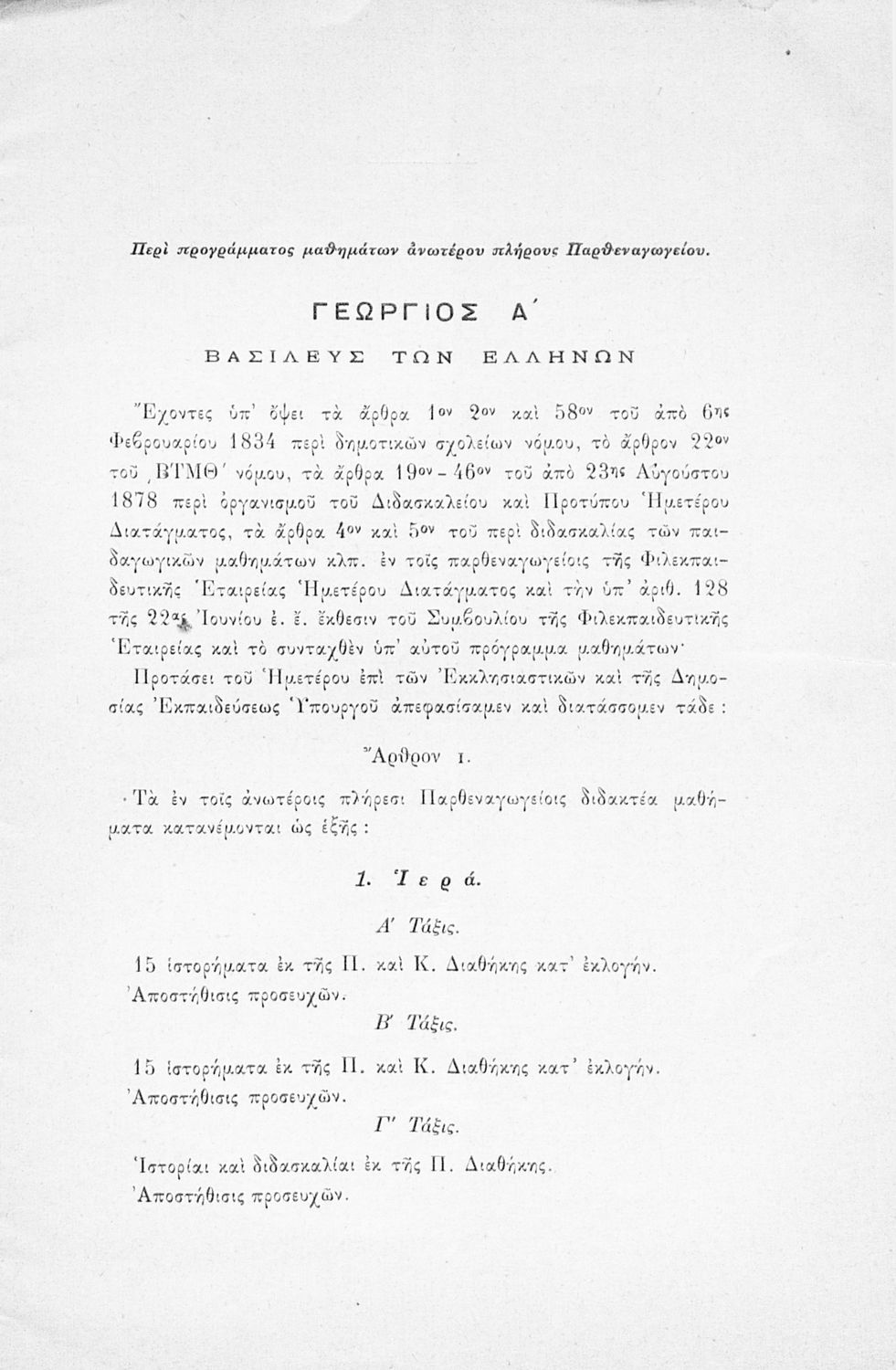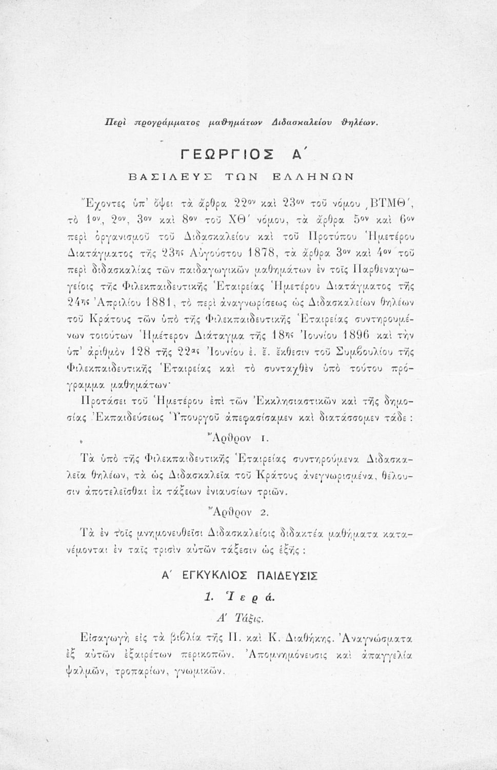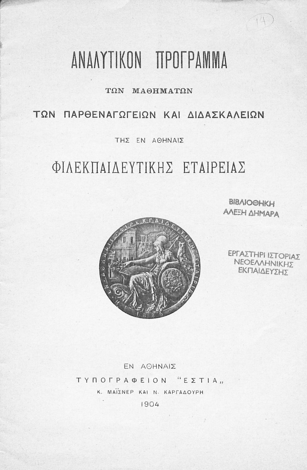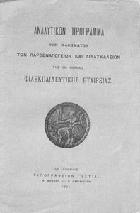 Έκδοση που περιλαμβάνει το αναλυτικό και ωρολόγιο πρόγραμμα για τα Παρθεναγωγεία και Διδασκαλεία της Φιλεκπαιδευτικής Εταιρείας.