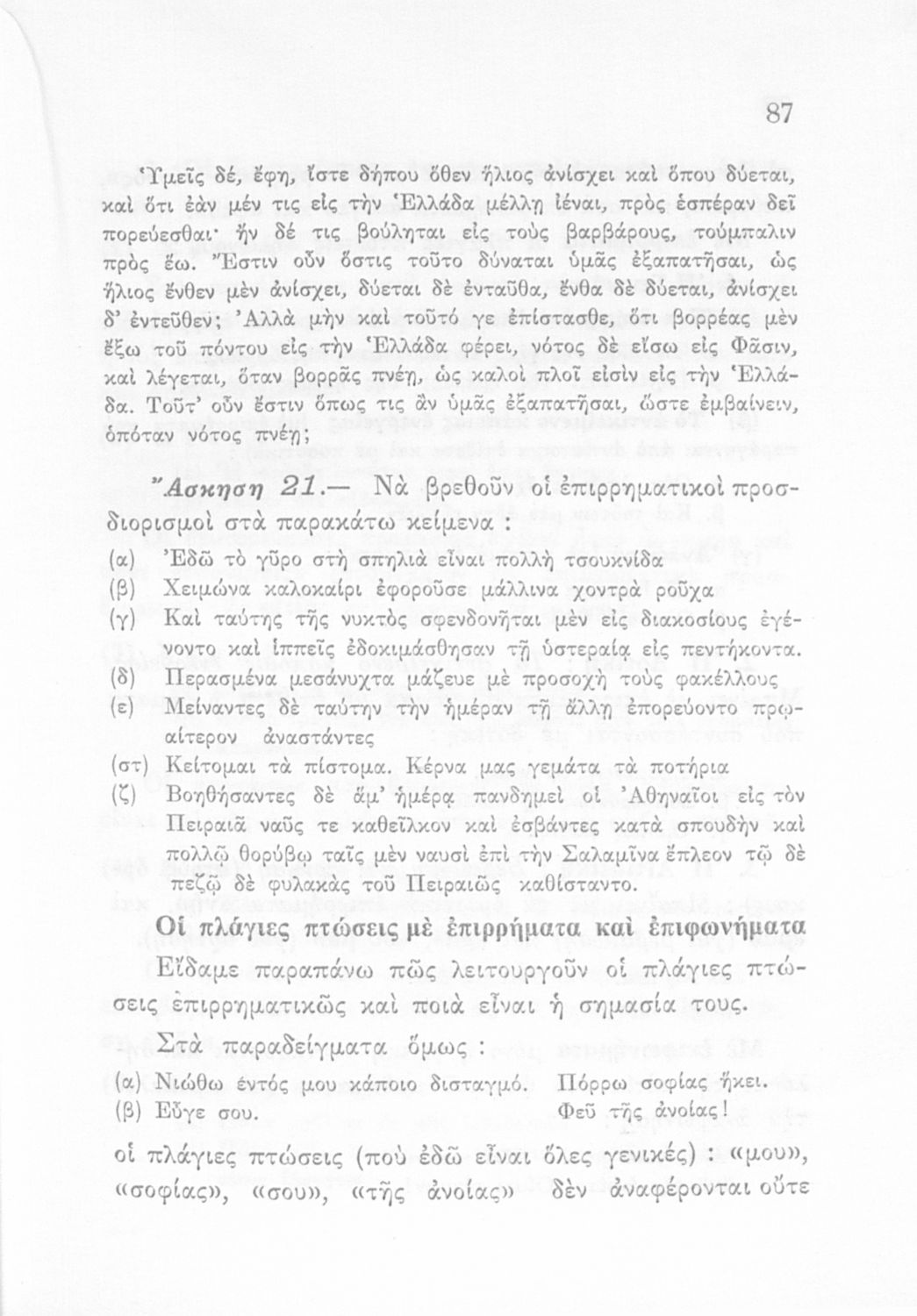 Σχολικό εγχειρίδιο Αρχαίων Ελληνικών που εστιάζει στα μέρη του λόγου και στην σύνταξή τους.