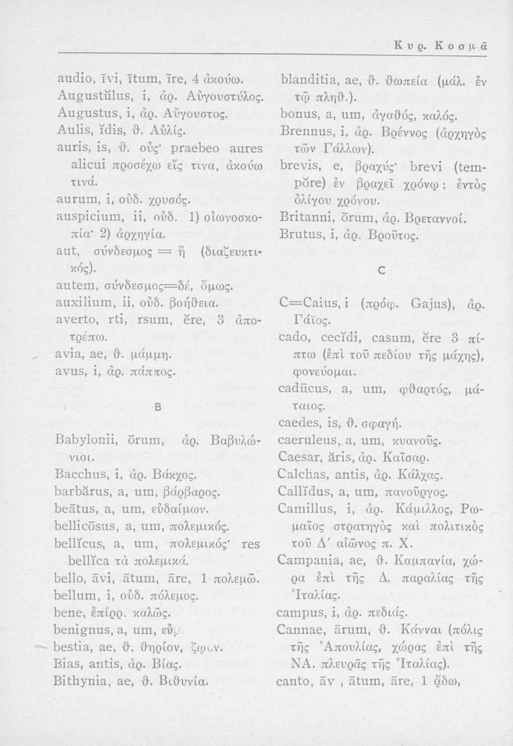 Κωδικός αναγνώρισης: 05-00018 Τίτλος: Αναγνωστικόν της λατινικής γλώσσας δια την Γ΄ τάξιν των Γυμνασίων Συγγραφέας: Κυριάκος Κοσμάς Μέγεθος και υπόστρωμα: Σχολικό εγχειρίδιο, μαλακό εξώφυλλο, 86 σελίδες. |