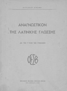Κωδικός αναγνώρισης: 05-00018 Τίτλος: Αναγνωστικόν της λατινικής γλώσσας δια την Γ΄ τάξιν των Γυμνασίων Συγγραφέας: Κυριάκος Κοσμάς Μέγεθος και υπόστρωμα: Σχολικό εγχειρίδιο, μαλακό εξώφυλλο, 86 σελίδες. |