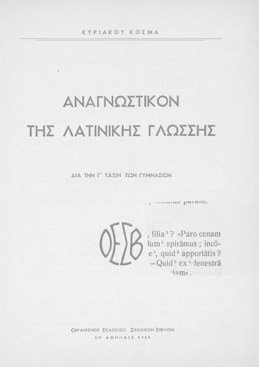 Εκδότης: Οργανισμός Εκδόσεως Σχολικών Βιβλίων Έτος έκδοσης: 1951 Τόπος έκδοσης: Αθήνα |