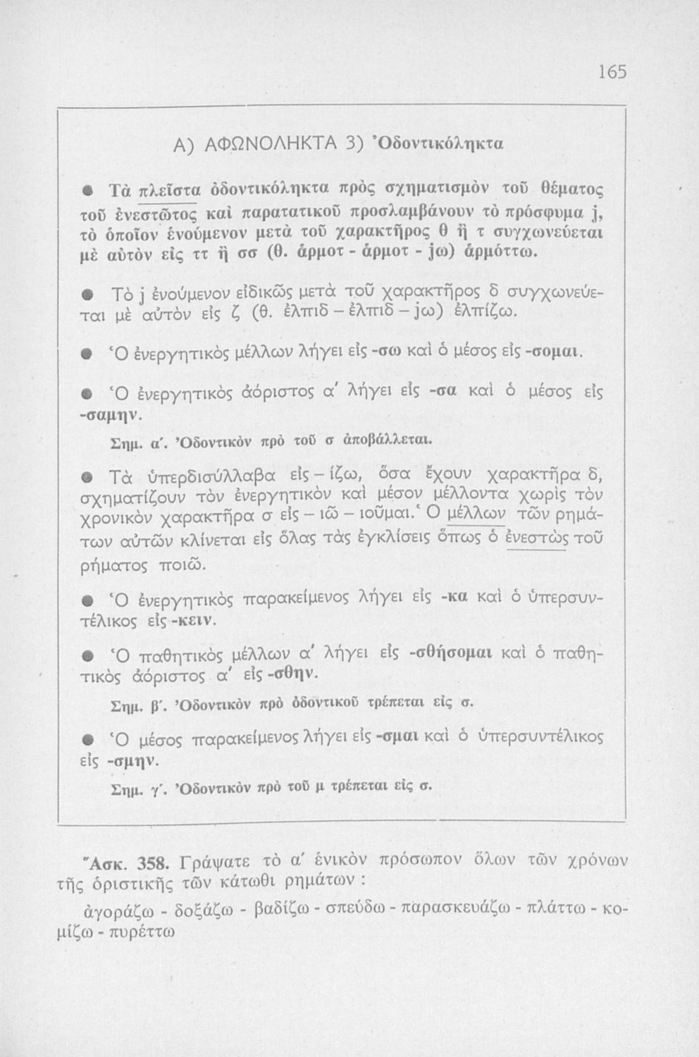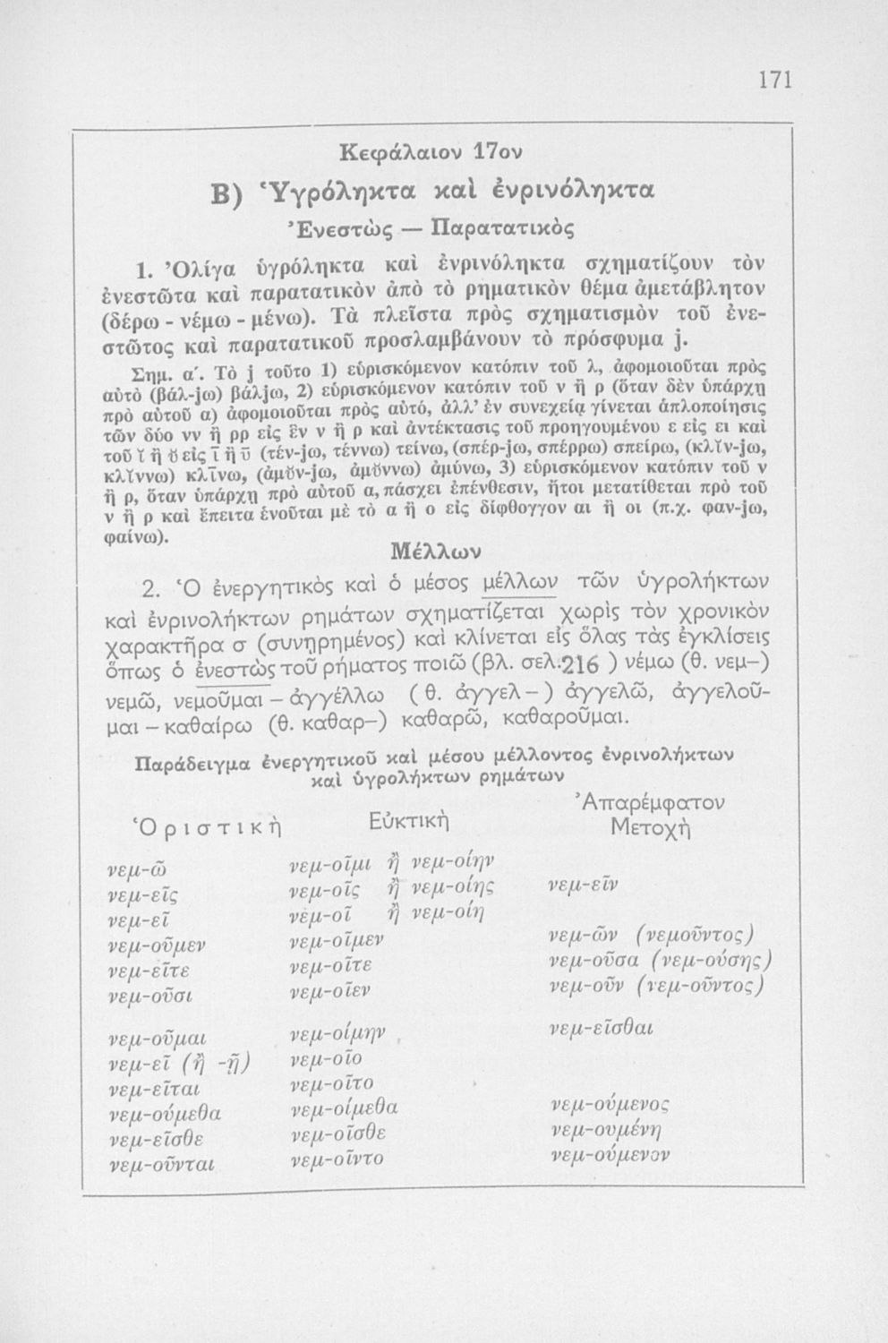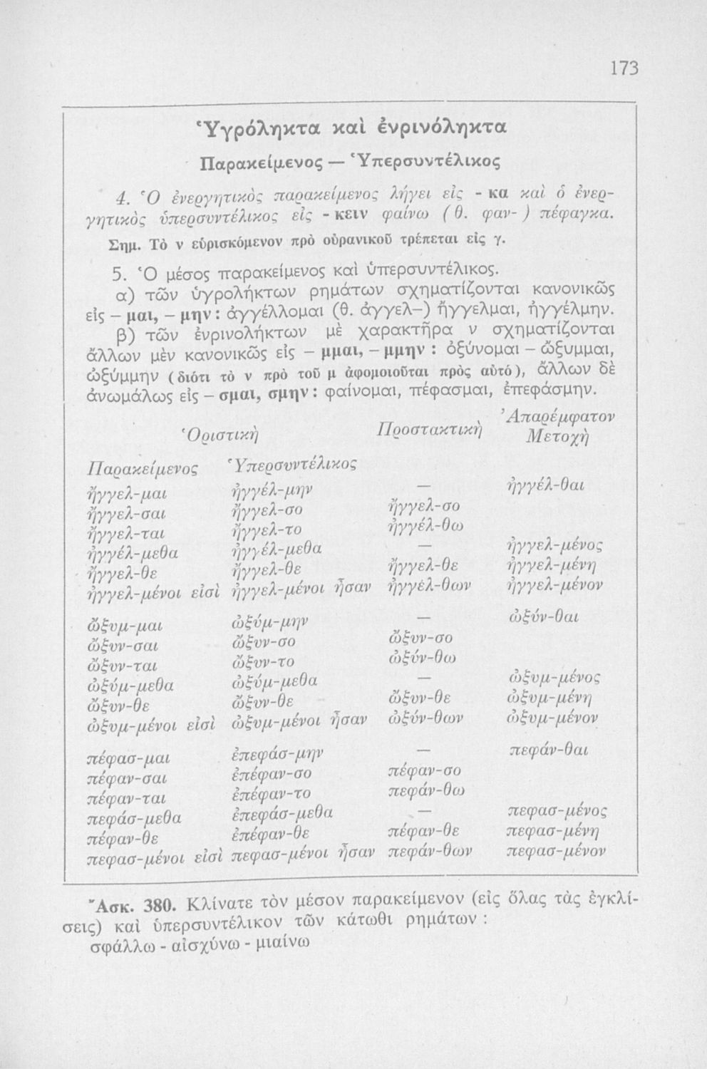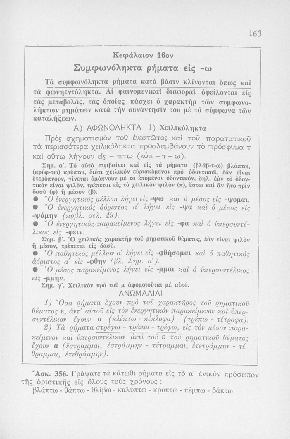 Σχολικό εγχειρίδιο Αρχαίων Ελληνικών Γυμνασίου που περιλαμβάνει τη γραμματική της αρχαίας ελληνικής και είναι χωρισμένο σε φθογγολογικό και τυπολογικό μέρος Περιέχει και κατάλογο ανωμάλων ρημάτων, ασκήσεις και