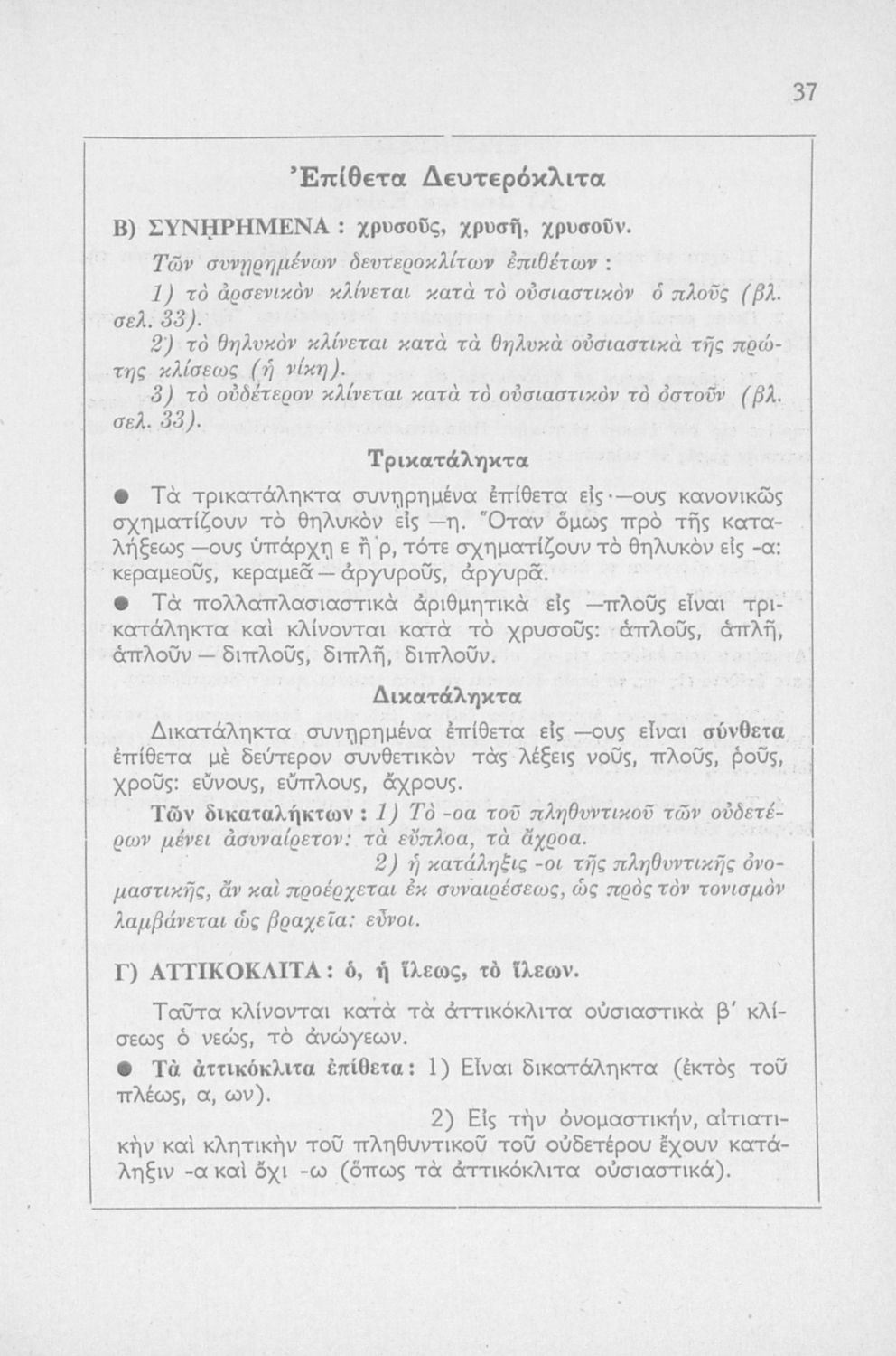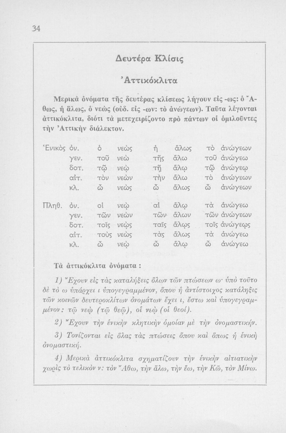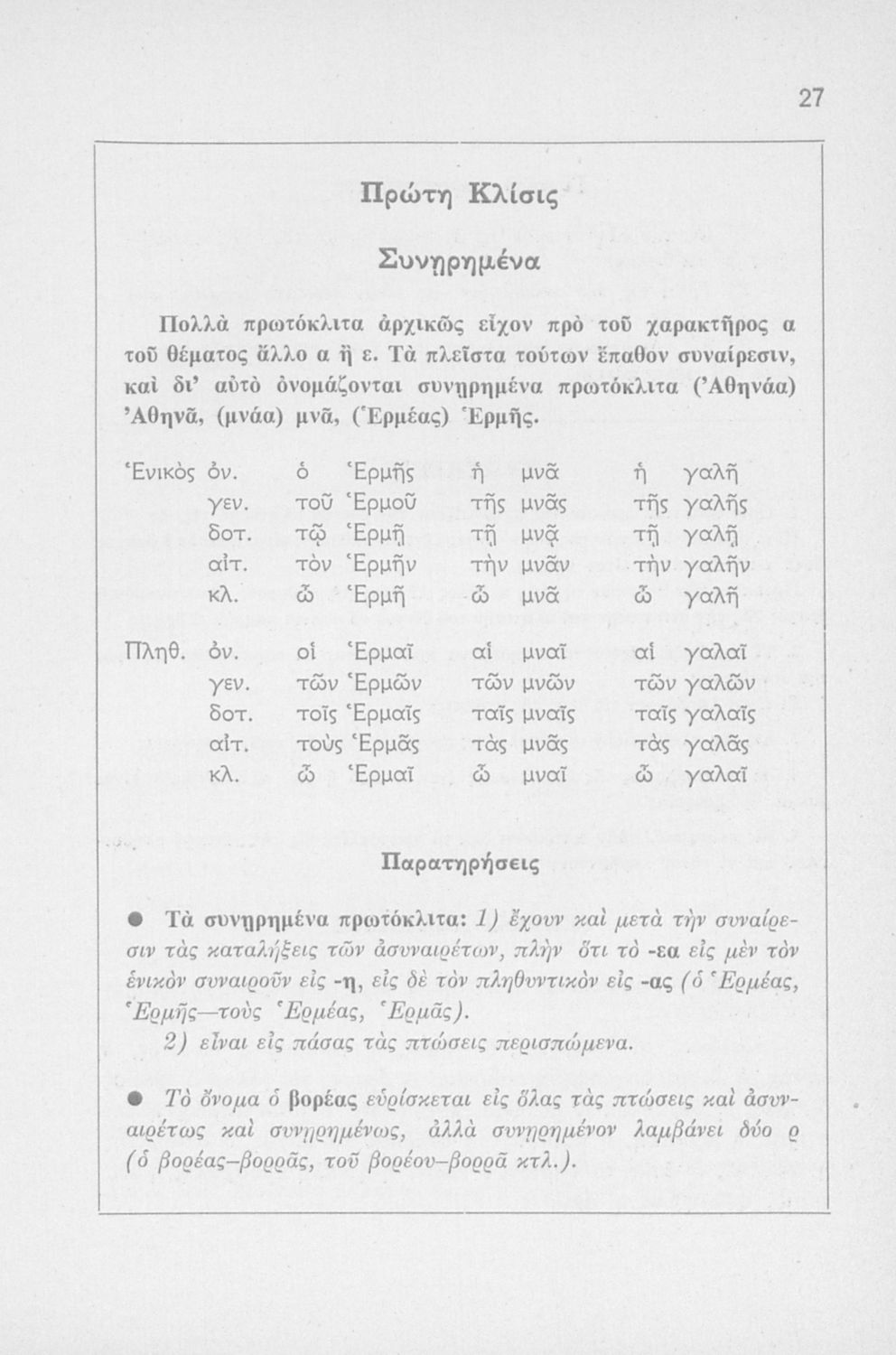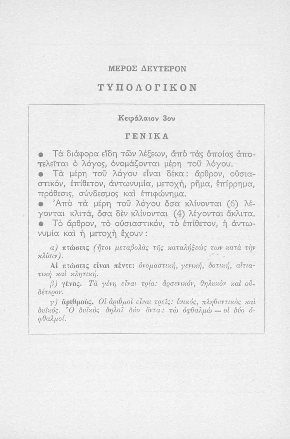 Σχολικό εγχειρίδιο Αρχαίων Ελληνικών Γυμνασίου που περιλαμβάνει τη γραμματική της αρχαίας ελληνικής και είναι χωρισμένο σε φθογγολογικό και τυπολογικό μέρος Περιέχει και κατάλογο ανωμάλων ρημάτων, ασκήσεις και