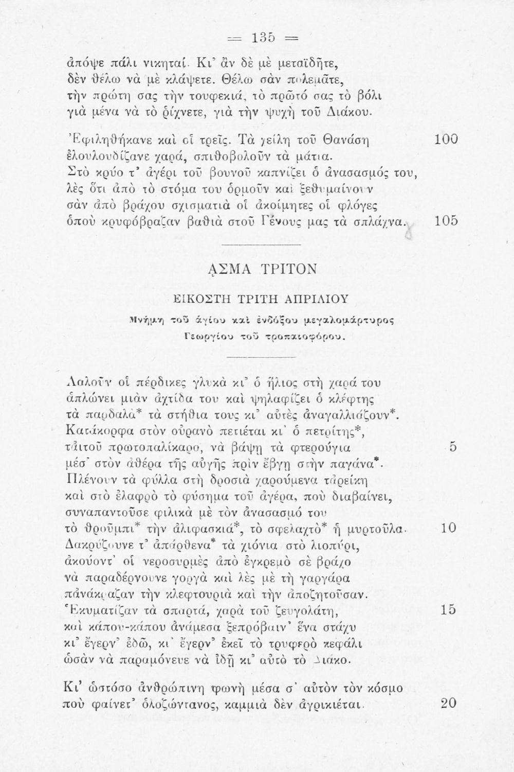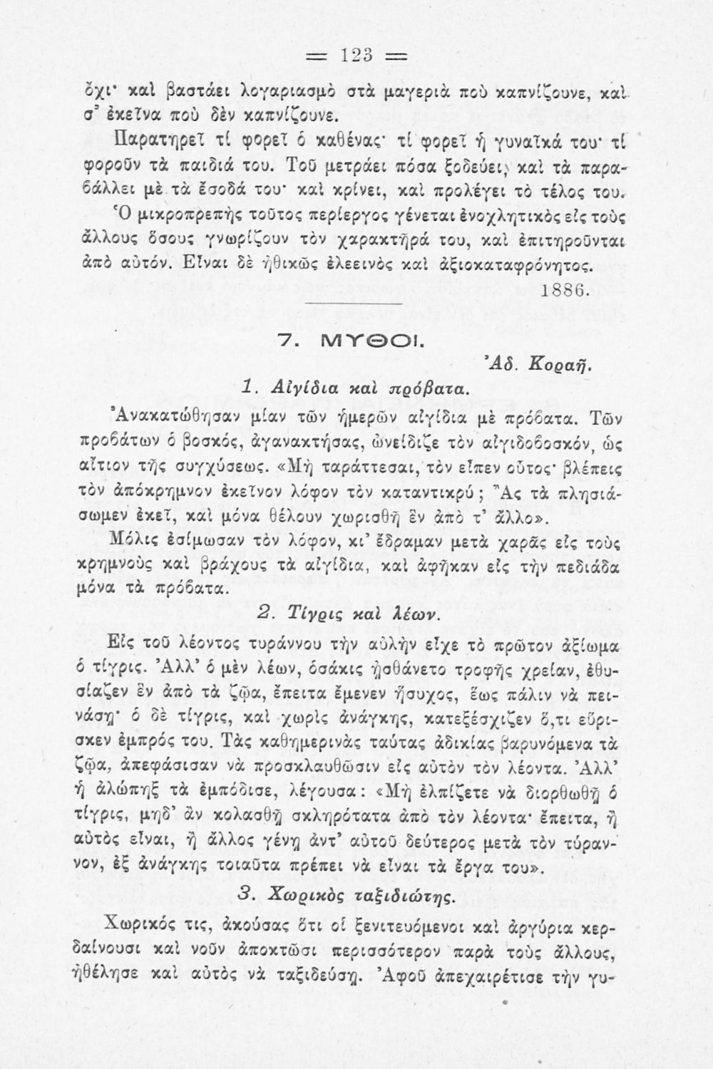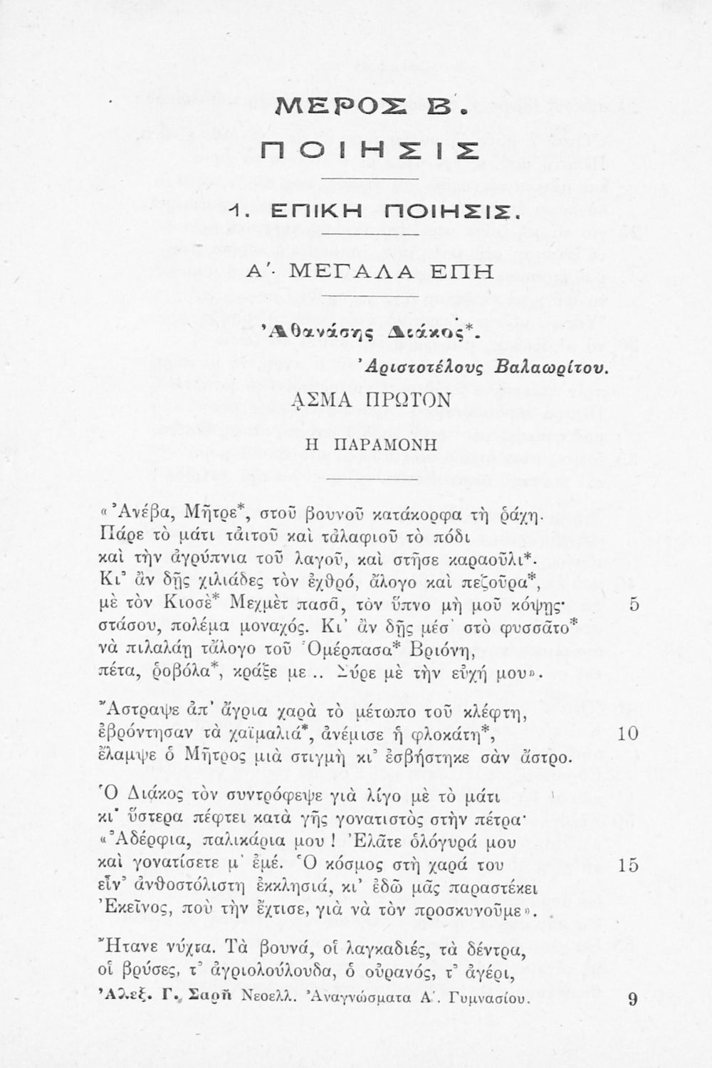 Σχολικό εγχειρίδιο για την Β΄ Γυμνασίου και την Γ΄ Αστικού Θηλέων για το μάθημα των Νέων Ελληνικών. Το εγχειρίδιο αποτελείται από κείμενα πεζού λόγου, επικολυρικά ποιήματα, ωδές, ηθογραφικά διηγήματα, ρητορικά