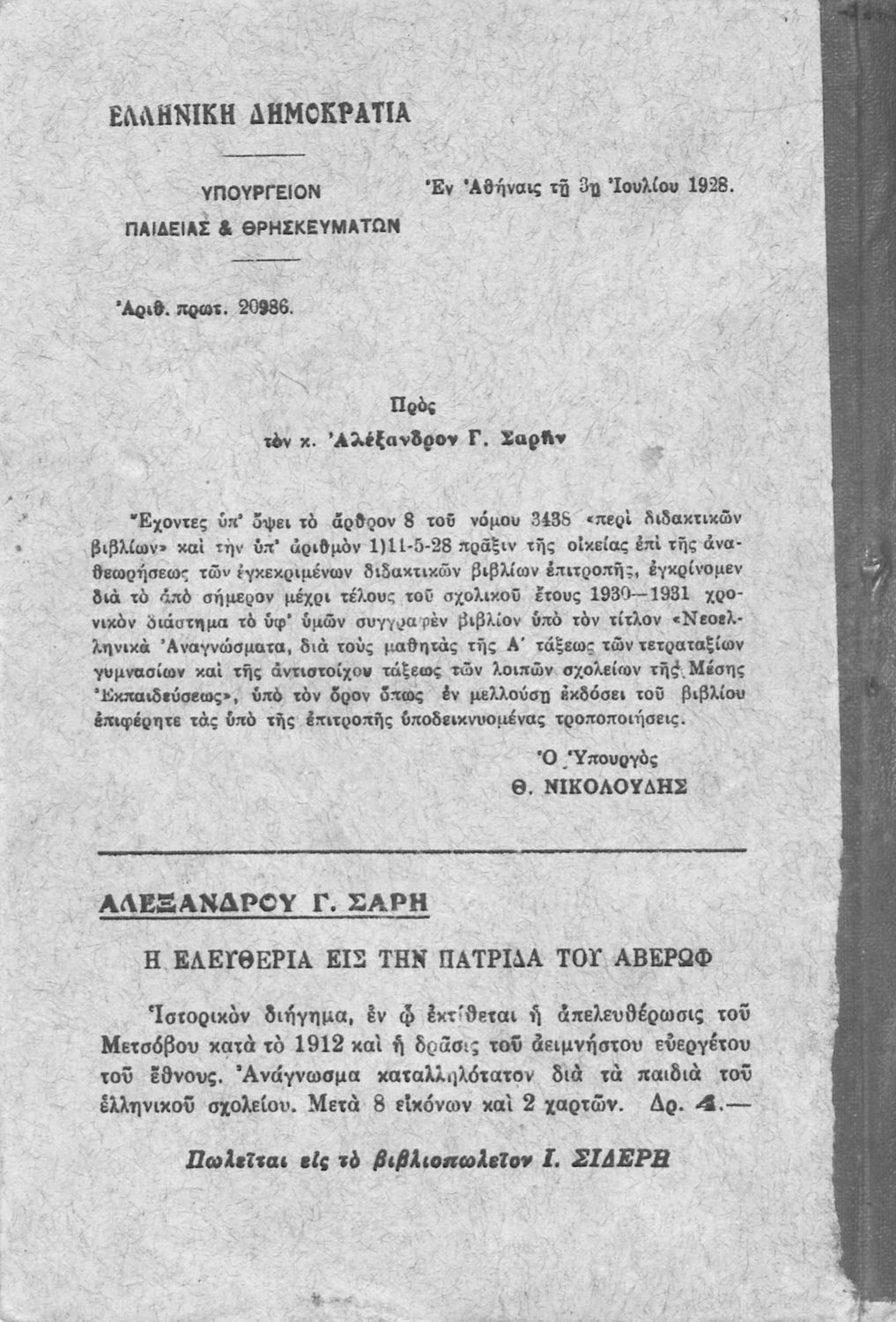Τίτλος: Νεοελληνικά αναγνώσματα για τους μαθητές της Α΄ τάξεως των Τετραταξίων Γυμνασίων και της αντιστοίχου τάξεως των λοιπών σχολείων της Μέσης Εκπαιδεύσεως