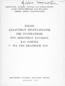 Κωδικός αναγνώρισης: 05-00025 Τίτλος: Σχέδιο αναλυτικού προγράμματος της γραμματικής του Δημοτικού Σχολείου και οδηγίες για την εφαρμογή του Συγγραφέας: Υπουργείο Εθνικής Παιδείας & Θρησκευμάτων Μέγεθος και υπόστρωμα: Παιδαγωγικό βοήθημα, μαλακό εξώφυλλο, 48 σελίδες. |