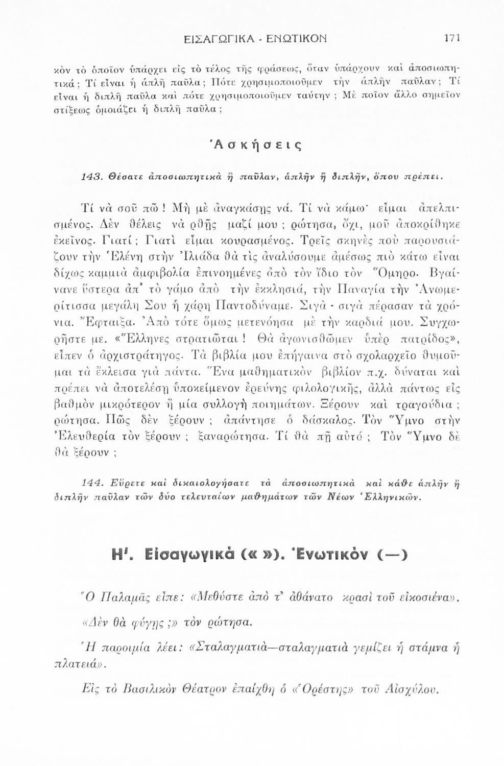 Τάξη:  Α' Γυμνάσιου / Β' Γυμνάσιου / Ανώτερα Παρθεναγωγεία / Α' Διδασκαλείου