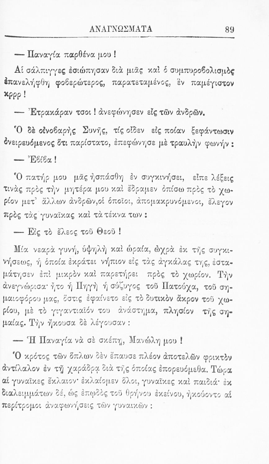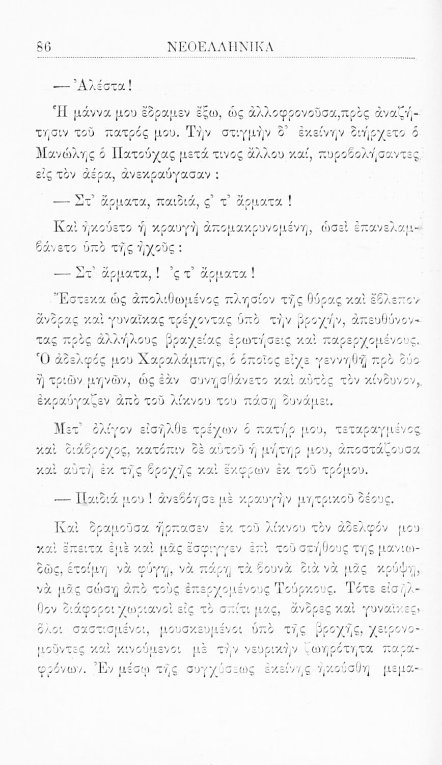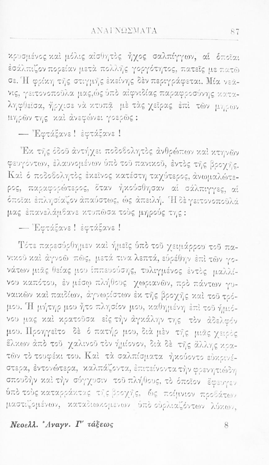 Βαθμίδα εκπαίδευσης: Δευτεροβάθμια Τάξη: Γ' Ελληνικού Σχολείου Μάθημα: Νέα Ελληνικά Γλώσσα: Καθαρεύουσα Παρουσίαση περιεχομένου: Σχολικό εγχειρίδιο Νέων Ελληνικών για τη Γ' Ελληνικού Σχολείου που περιλαμβάνει κείμενα και εξιστορήσεις γεγονότων που αφορούν την άλωση της Κωνσταντινούπολης από τους Άραβες και την Ελληνική Επανάσταση του 1821. |