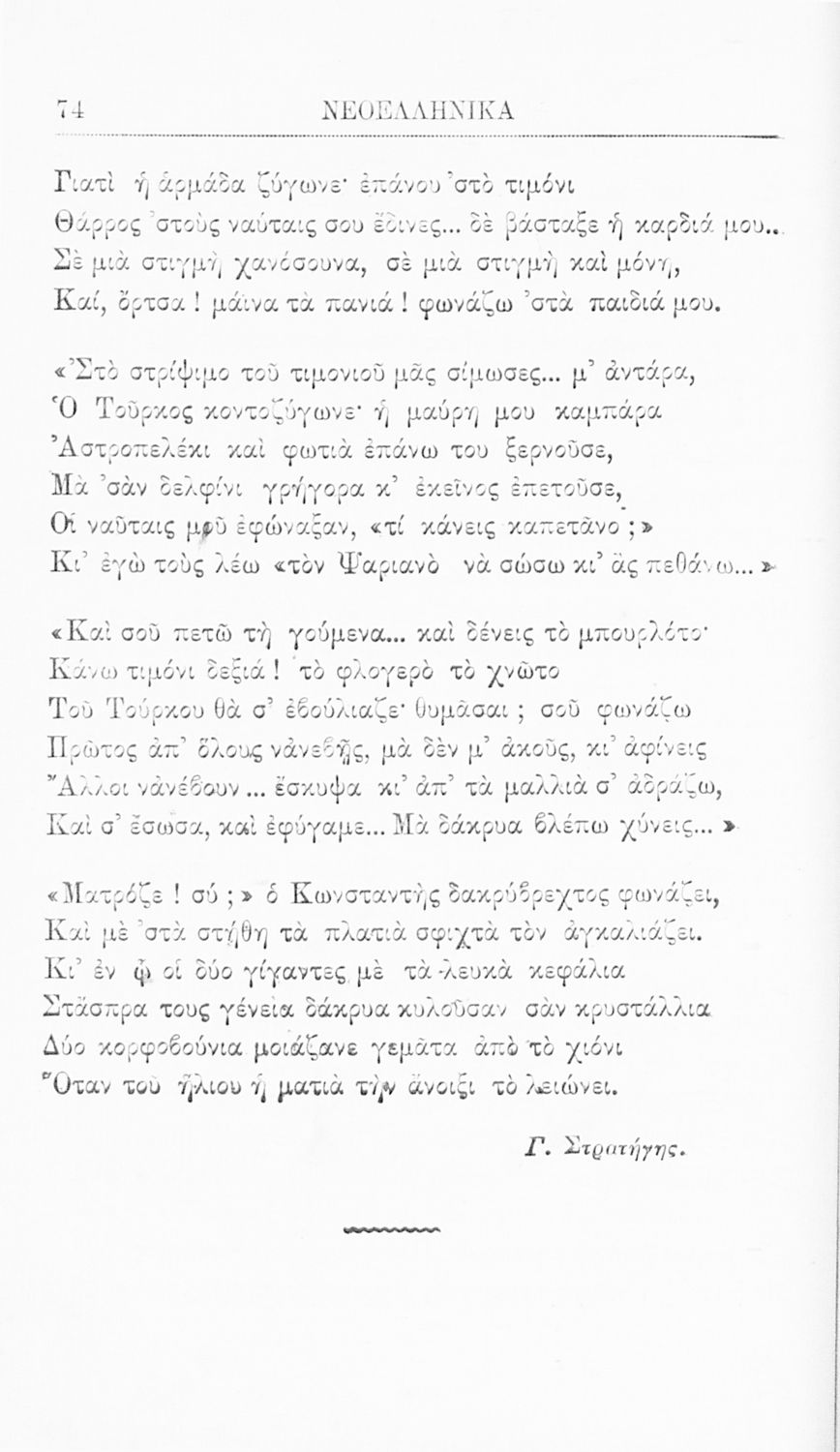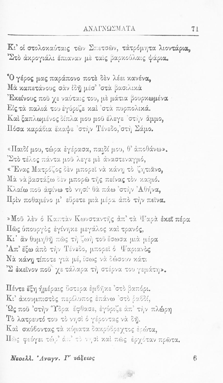 Σχολικό εγχειρίδιο Νέων Ελληνικών Γ' Ελληνικού Σχολείου που περιέχει πεζά και ποιήματα Ελλήνων συγγραφέων και δημοτικά τραγούδια εμπνευσμένα από τη βυζαντινή και σύγχρονη ελληνική ιστορία, και την οικογενειακή