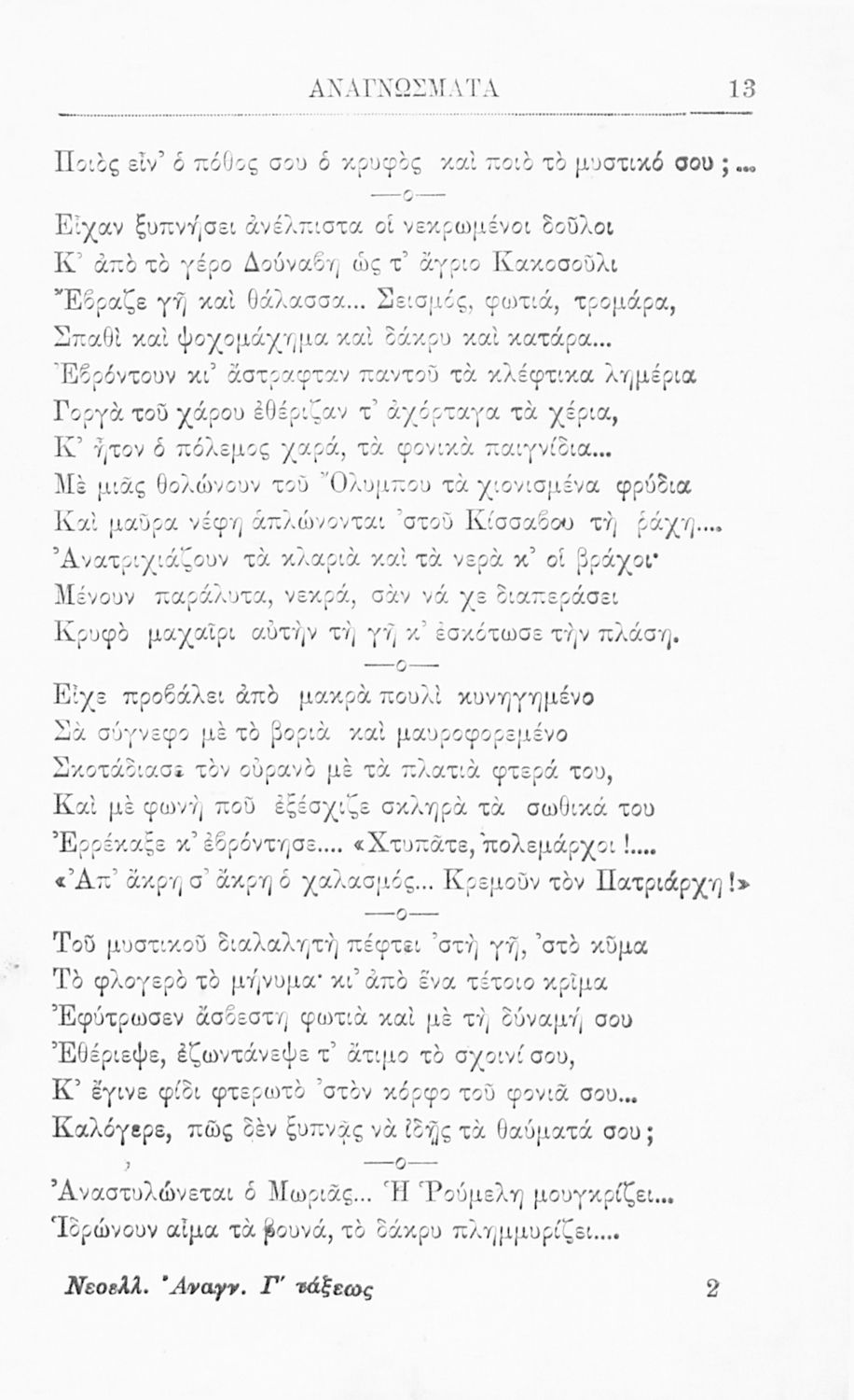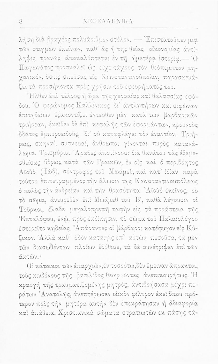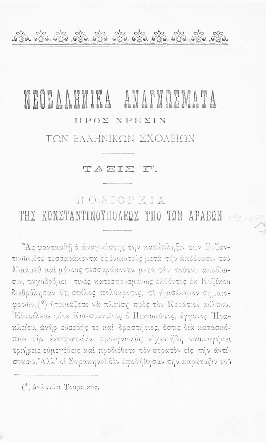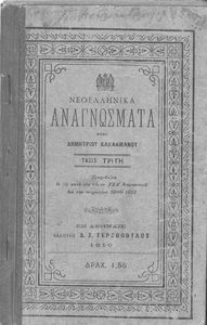 Βαθμίδα εκπαίδευσης: Δευτεροβάθμια Τάξη: Γ' Ελληνικού Σχολείου Μάθημα: Νέα Ελληνικά Γλώσσα: Καθαρεύουσα Παρουσίαση περιεχομένου: Σχολικό εγχειρίδιο Νέων Ελληνικών για τη Γ' Ελληνικού Σχολείου που περιλαμβάνει κείμενα και εξιστορήσεις γεγονότων που αφορούν την άλωση της Κωνσταντινούπολης από τους Άραβες και την Ελληνική Επανάσταση του 1821. |