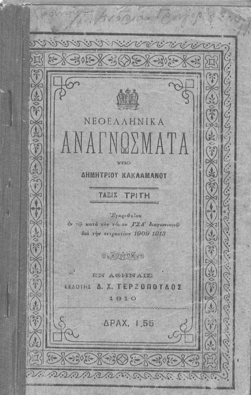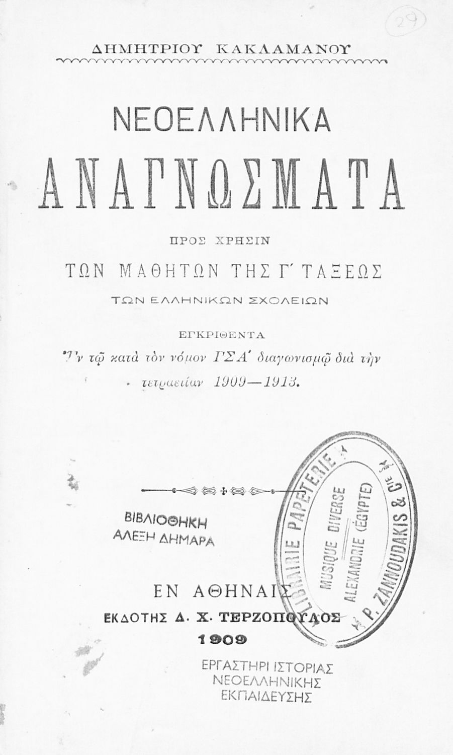 Εκδότης: Δ.Χ. Τερζόπουλος Έτος έκδοσης: 1910 Τόπος έκδοσης: Αθήνα Έκδοση: 1η Έτος έγκρισης: 1909 |