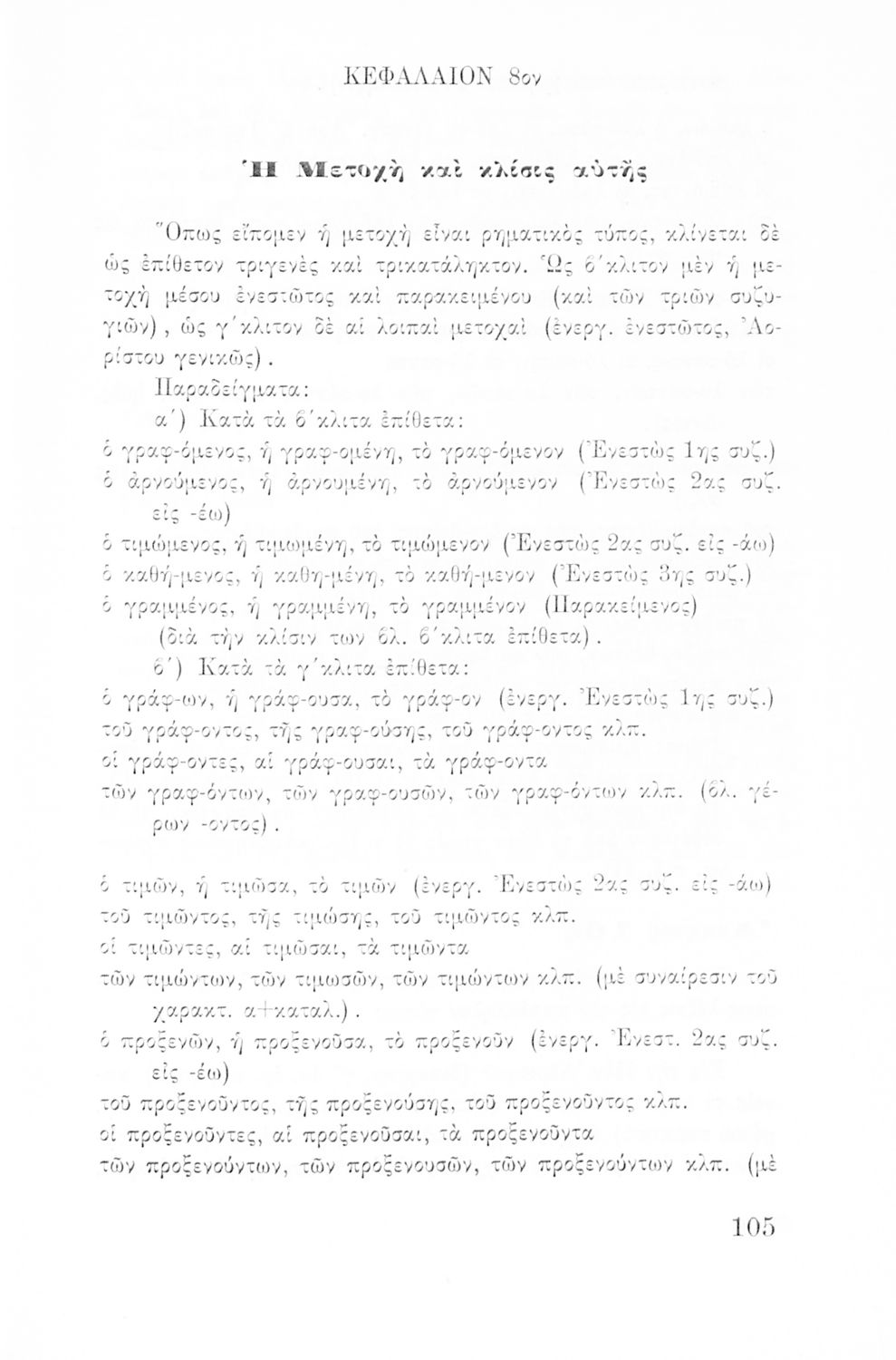 Σχολικό εγχειρίδιο γραμματικής για τους μαθητές της Ε΄ και ΣΤ΄ τάξης του Δημοτικού. Περιέχει τη διδασκαλία της γραμματικής της καθαρεύουσας με κανόνες και παραδείγματα.